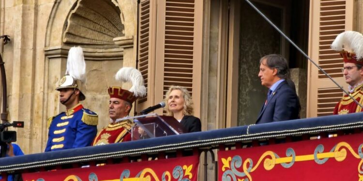 A continuación, y una vez terminada la ceremonia religiosa, vuelta al Consistorio para ceder el protagonismo en el salón de Recepciones y el balcón del Ayuntamiento a Mirian Cortés. Un pregón especial, que ha sido presentado por su hija, en el que Cortés ha realizado un repaso de su vida y vinculación con la ciudad de Salamanca en la que desarrolla su actividad profesional como rectora de la UPSA.