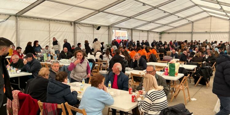 Niños, jóvenes y mayores han acudido con sus tickets a recoger su ración, servida con la colaboración de las peñas y los Quintos de este año, para degustarla en compañía en la carpa de la pista de Piedra Dorada, aunque algunos han preferido llevársela a casa para evitar el frío.