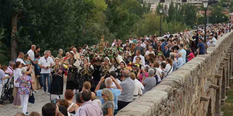 Los salmantinos han vuelto a demostrar el cariño y la devoción que profesan a la patrona de la ciudad, Santa María de la Vega. El entorno de la Iglesia del Arrabal y el Puente Romano han sido los lugares que han congregado a un mayor número de personas para ver el paso de uno de los actos institucionales con más tradición y más arraigados en Salamanca.