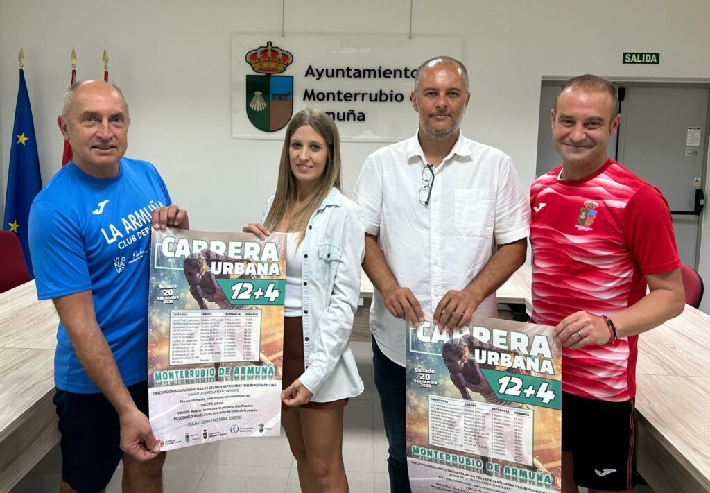 El Ayuntamiento de Monterrubio de Armuña celebrará el sábado día 20 de septiembre la ’12+4 Carrera Urbana de Monterrubio’. Una prueba, incluida en el 11º Circuito Provincial de Carreras Populares de la Diputación de Salamanca, que ha sido presentada por el alcalde de Monterrubio de Armuña, David Matute, la concejala de deportes, Sonia Pérez, el presidente del C.D Armuña, Ramiro Morán, y el monitor de Deportes, Javi Terleira.