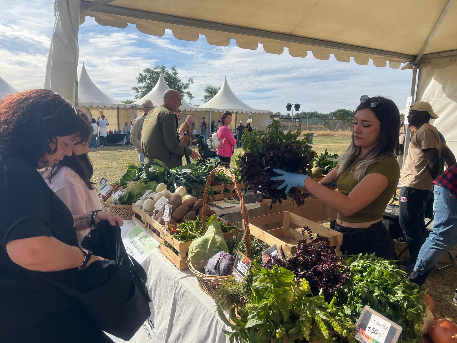 Zanahorias, patatas, pimientos, lombarda, puerros, lechugas, cebollas, tomates, repollo y una amplia variedad de más verduras, junto a frutas, quesos, vinos, carne de ternera, cosméticos, aceite, pan, huevos y calabazas, entre otros, han llenado el jardín del centro de FP Lorenzo Milani en Cabrerizos.