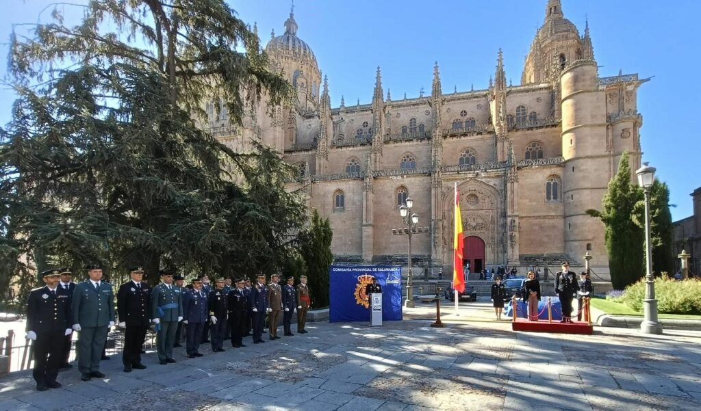 La Policía Nacional ha celebrado hoy jueves, 2 de octubre, su festividad con un acto central que ha tenido lugar en la plaza de Anaya, al aire libre, que el Cuerpo ha querido compartir con los ciudadanos salmantinos. Tras la eucaristía, a mediodía se ha desarrollado el acto institucional, presidido por la subdelegada del Gobierno en Salamanca, Rosa López, y por el comisario jefe provincial de Salamanca, Claudio Javier Díaz.