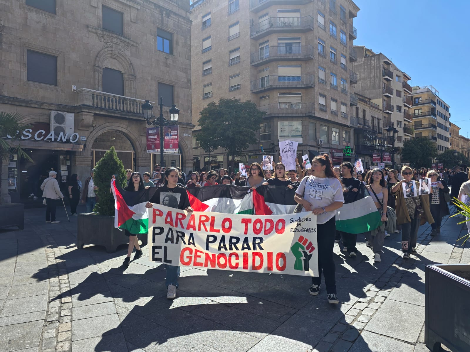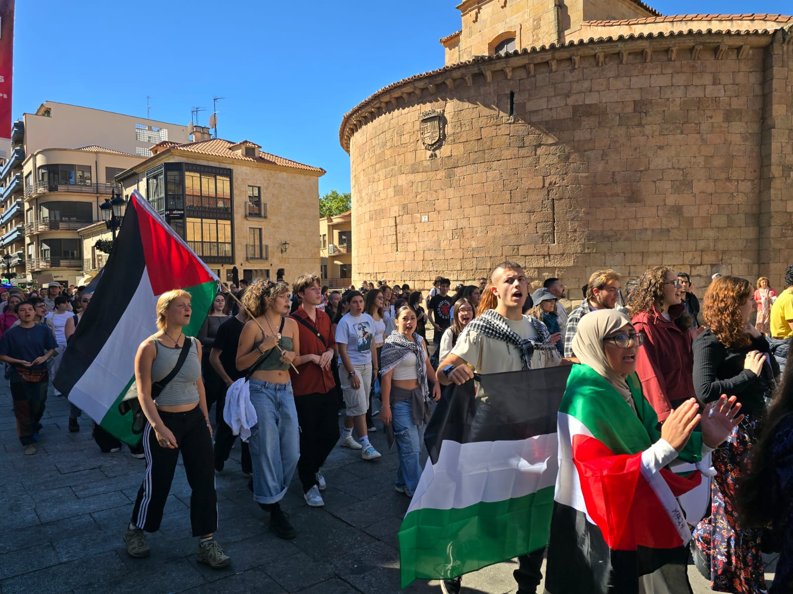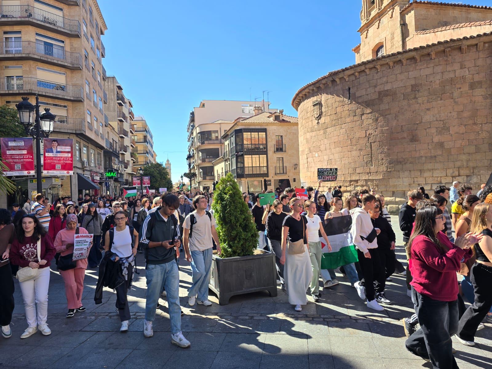 Cientos de jóvenes han salido esta mañana a la calle para recorrer el centro de Salamanca para pedir la paz y la libertad para el pueblo palestino y la flotilla humanitaria con activistas de 40 países que ha sido interceptada por Israel.