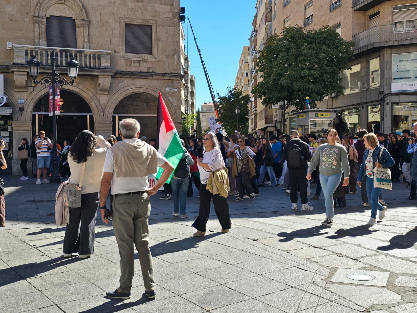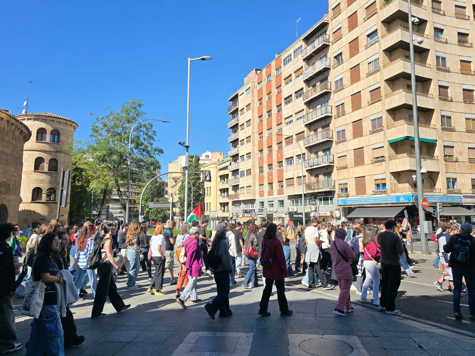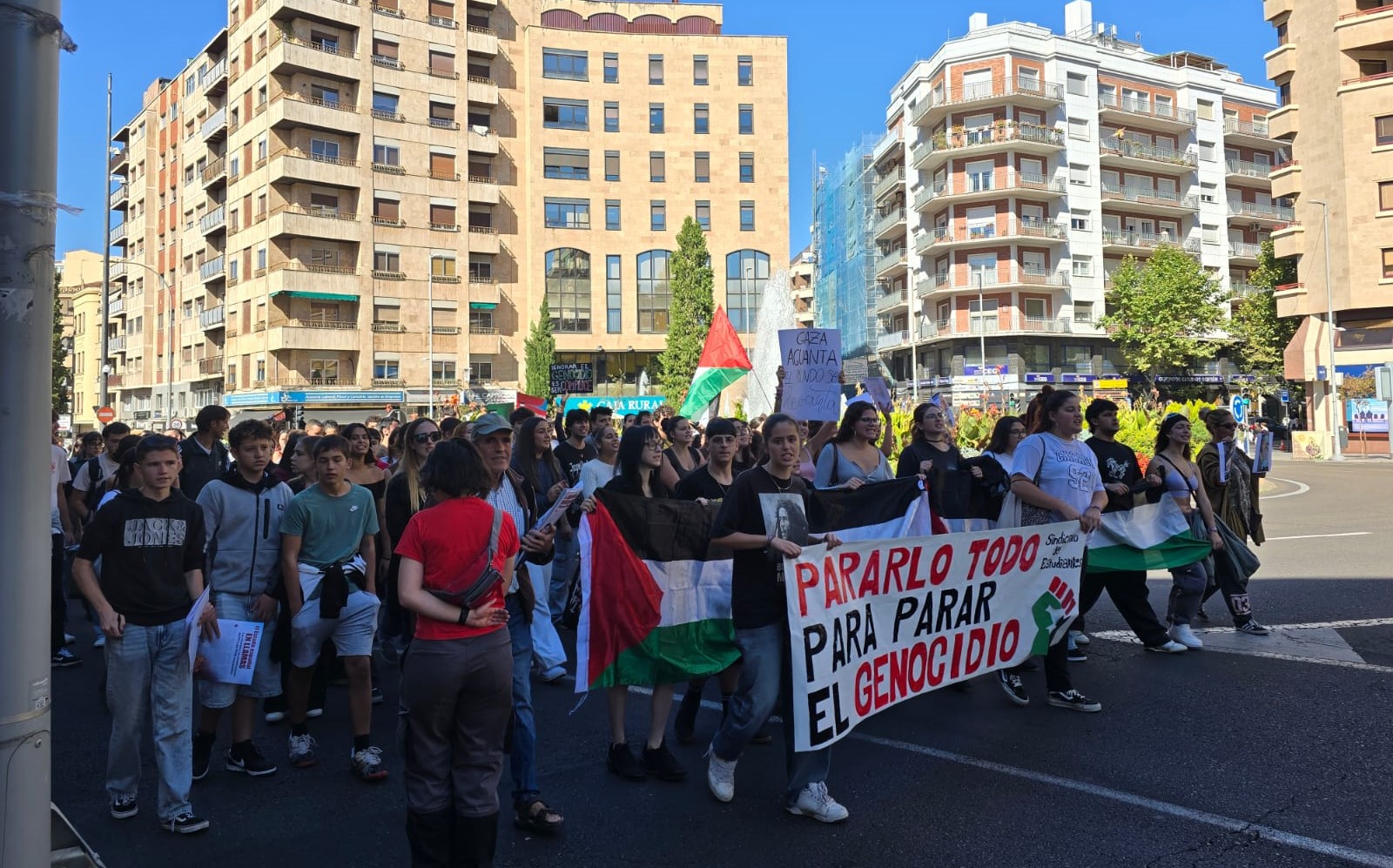 Cientos de jóvenes han salido esta mañana a la calle para recorrer el centro de Salamanca para pedir la paz y la libertad para el pueblo palestino y la flotilla humanitaria con activistas de 40 países que ha sido interceptada por Israel.