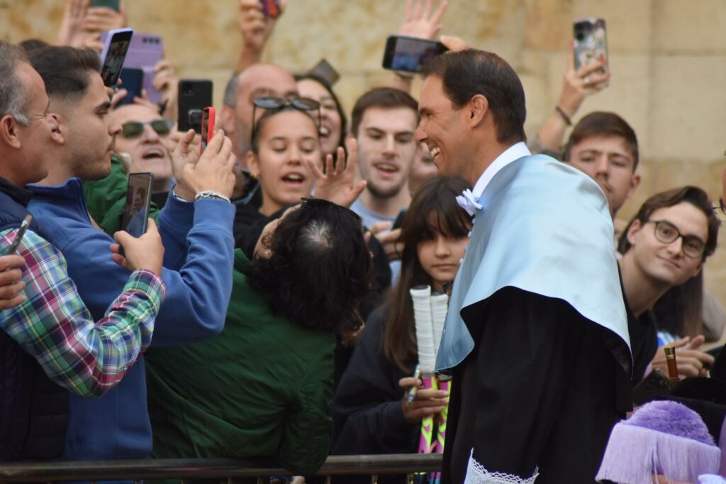 Nadal se ha mostrado cercano con el numerosos público reunido en el Patio de Escuelas para verlo y mostrar su orgullo y agradecimiento al deportista, antes de entrar al Paraninfo para la celebración del acto académico institucional, acompañado de su padrino, el decano de la Facultad de Educación, Ricardo Canal.