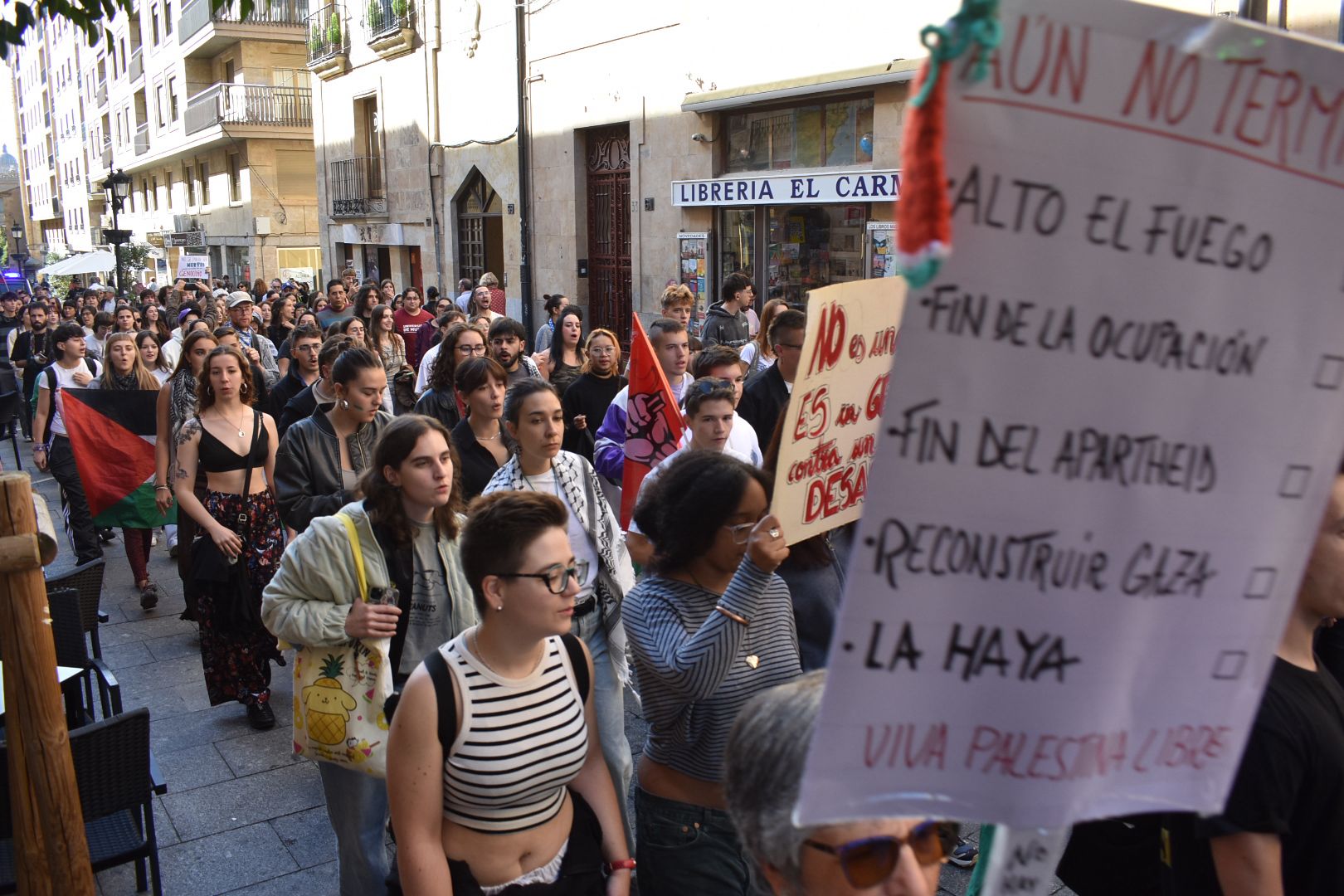 Así , más de medio centenar de alumnos de los centros educativos salmantinos secundan hoy este llamamiento, que incluye una manifestación multitudinaria que parte desde la Plaza de los Bandos y recorre lugares como la calle Zamora. De esta manera, a gritos de “Qué viva la lucha del pueblo palestino”, “Desde el río hasta el mar, Palestina vencerá” o “Gaza será la tumba del sionismo”, protestan alegando, tal y como apunta la Coordinadora Juvenil Socialista, “que el genocidio no ha terminado, únicamente se encuentra en una nueva fase”.