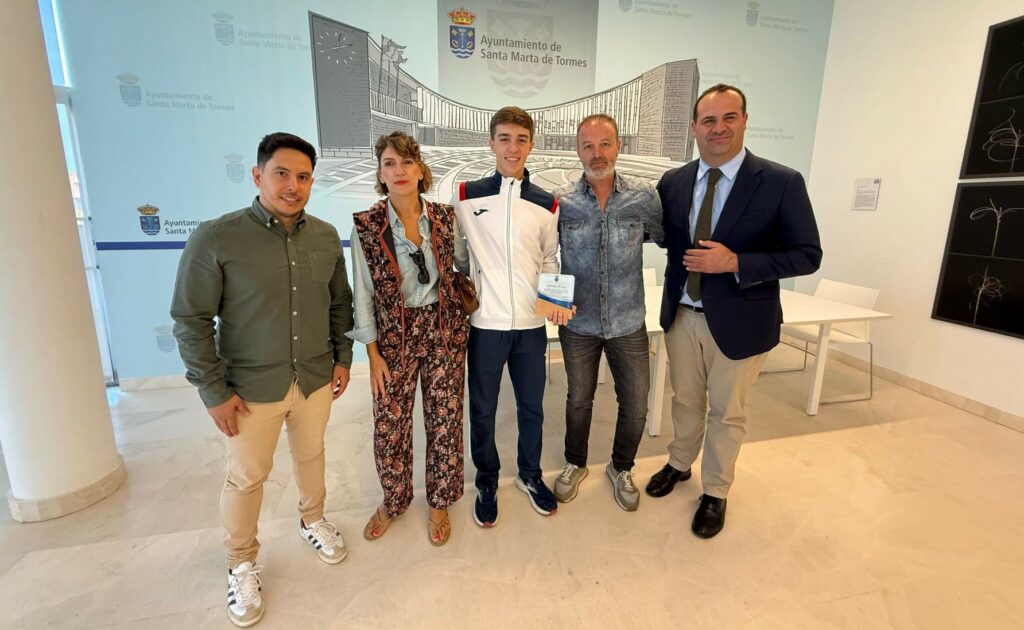 El alcalde de Santa Marta, David Mingo, y el concejal de Deportes. Jorge Valiente, han recibido esta mañana en el Ayuntamiento a Samuel Rivas, campeón del mundo de pádel por equipos y por parejas.