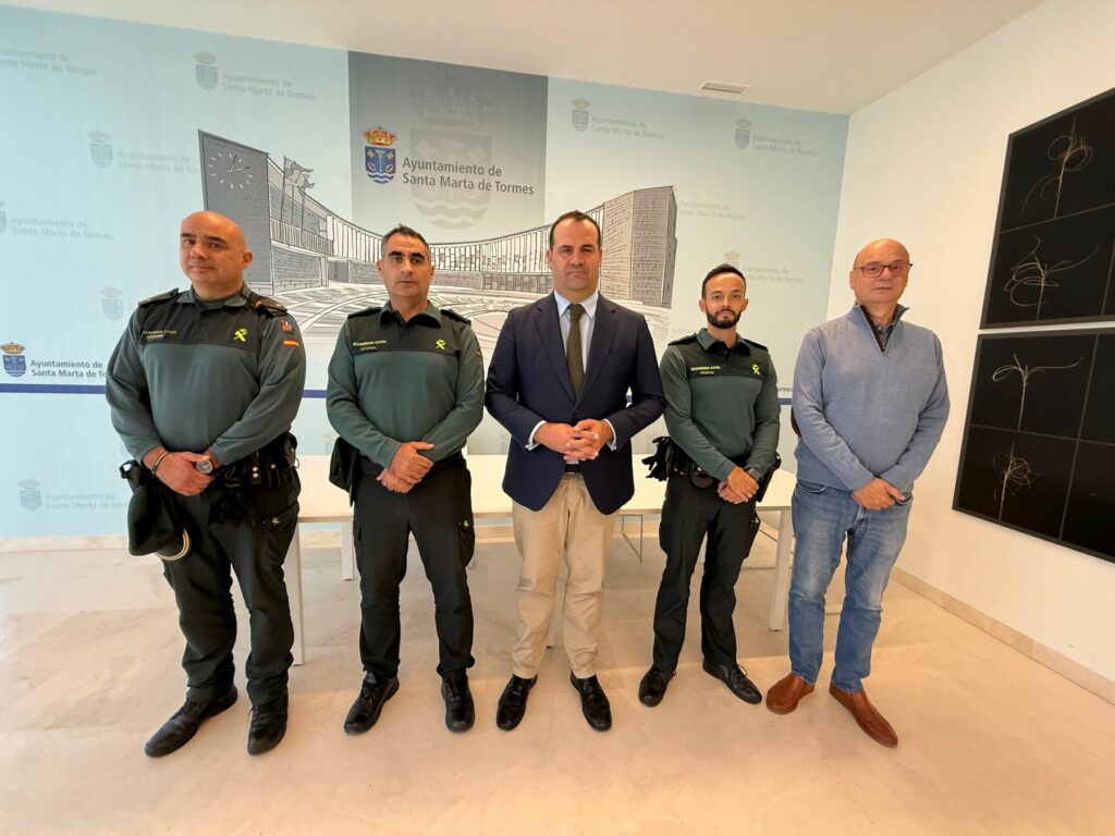 El teniente coronel de la Guardia Civil de Salamanca, Arturo Marcos, así como el teniente comandante del puesto de la Guardia Civil de Santa Marta de Tormes, Miguel Pedraza, han realizado esta mañana una visita protocolaria al Ayuntamiento del municipio, donde han sido recibidos por el alcalde, David Mingo, y el concejal, Jesús Hernández.