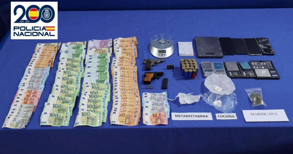 La policía realizó la entrada y el registro en las cuatro viviendas de manera simultanea, procediéndose a la incautación de sustancias estupefacientes, dos pistolas, munición, básculas de precisión, varios teléfonos móviles, más de 6.000 euros de dinero en efectivo y diversos útiles para la comisión del delito.