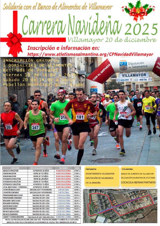 Una prueba consolidada en el circuito salmantino que ofrece inscripción gratuita para los participantes a cambio de la entrega de un 1 kilogramo de alimento no perecedero al retirar los dorsales que se donará al Banco de Alimentos de Villamayor. Los interesados en disputar la Carrera Navideña podrán formalizar la inscripción en la web www.atletismosalmantino.org y retirar los dorsales el viernes 19, de 16:00 a 20:00 horas, y el sábado 20, de 14:00 a 16:30 horas, en el Pabellón Municipal Dori Ruano.