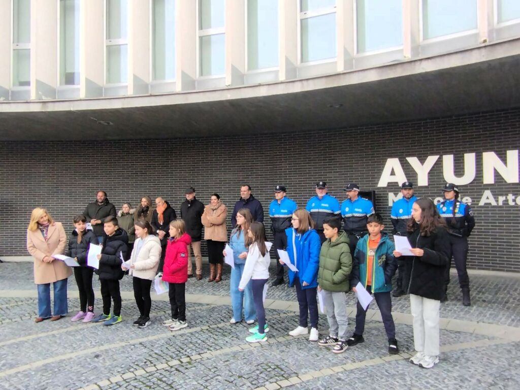 Miembros de la Corporación municipal de Santa Marta, trabajadores municipales y una representación de escolares de los colegios de Santa Marta se han unido a mediodía para dar lectura al manifiesto institucional contra la violencia contra las mujeres.