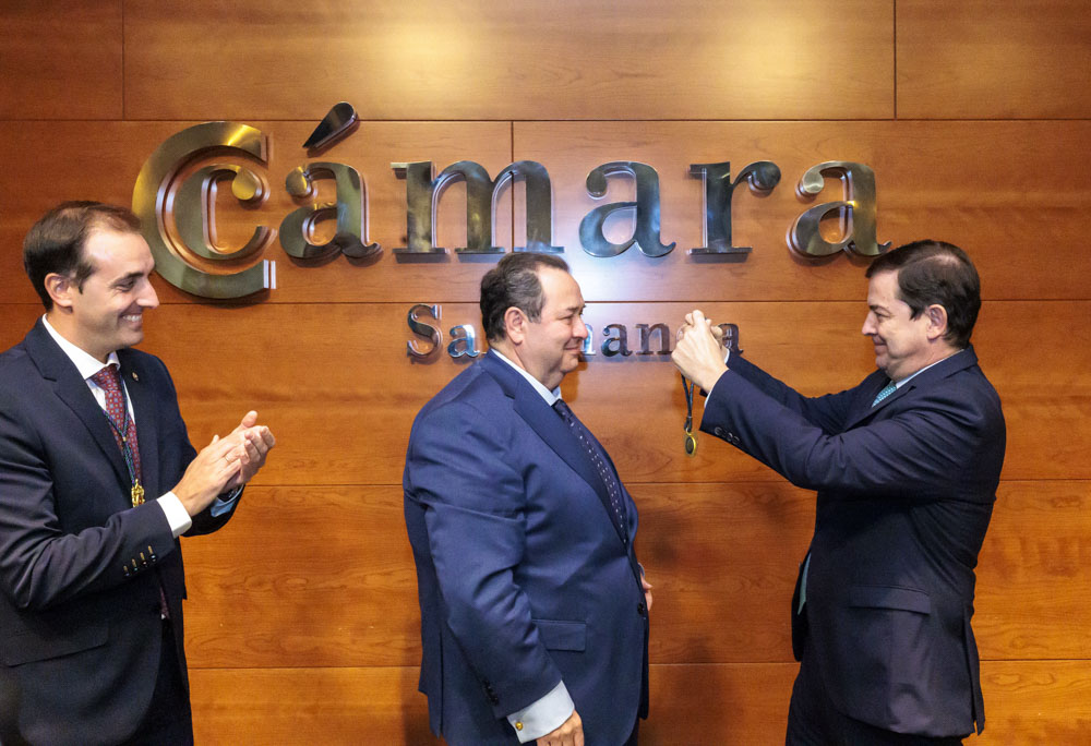 Alfonso Fernández Mañueco, presidente de la Junta de Castilla y León, ha clausurado hoy el acto de entrega de la Medalla al Mérito de la Cámara de Comercio de Salamanca a Benjamín Crespo, como reconocimiento a sus diez años al frente de la entidad cameral, de quien ha destacado su implicación con el dinamismo comercial, empresarial, económico y laboral de esta provincia.