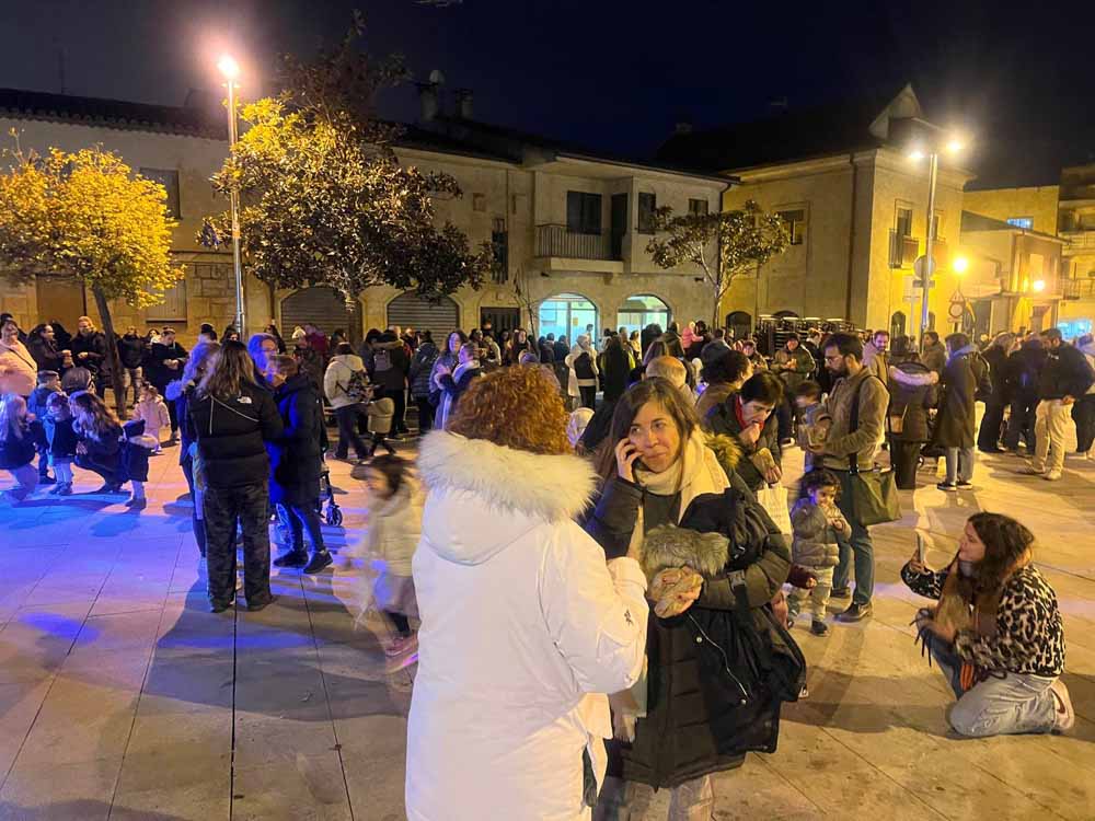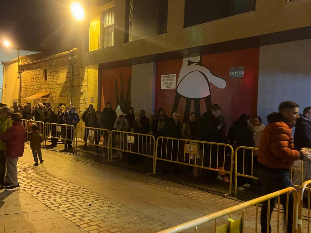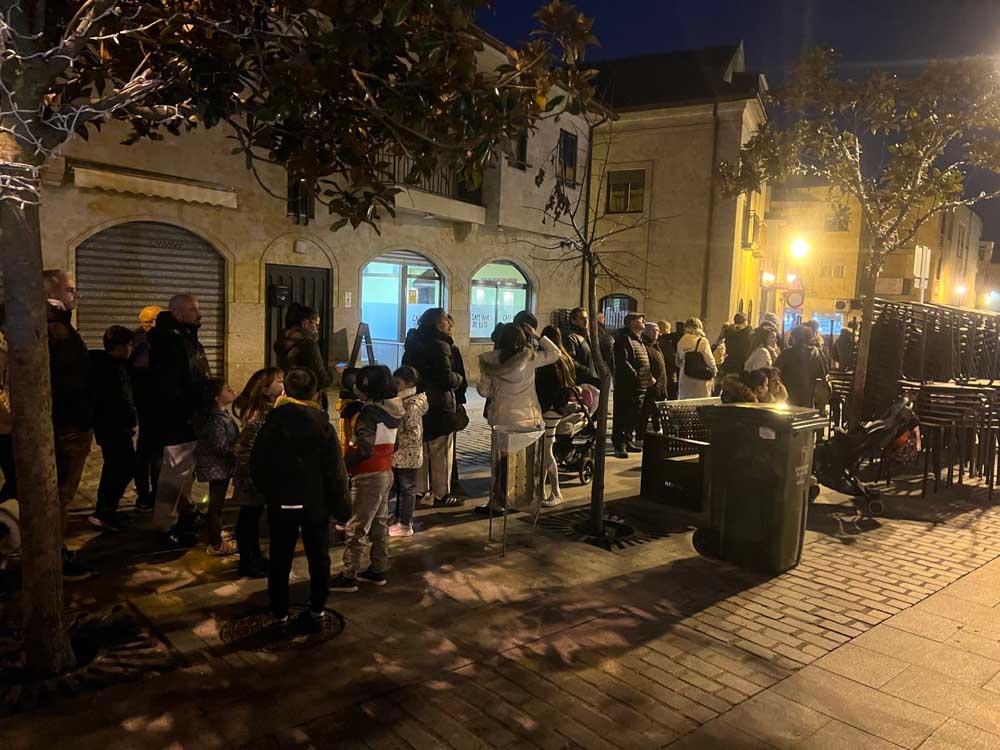los vecinos de Villamayor han formado una larga fila que daba la vuelta a toda la Plaza de España para recoger su ración de castañas asadas.