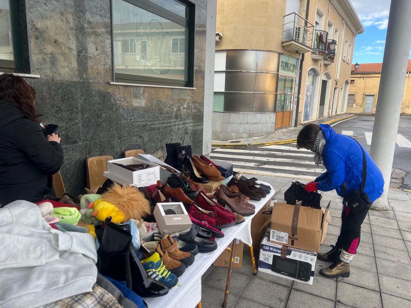 Desde primera hora han sacado cientos de productos y artículos de ropa, decoración, libros, bisutería, calzado, complementos y un largo etcétera de todas las donaciones que tienen en el ropero y que tras seleccionarlos han colocado en un largo mostrador bajo el soportal de la Plaza Mayor.