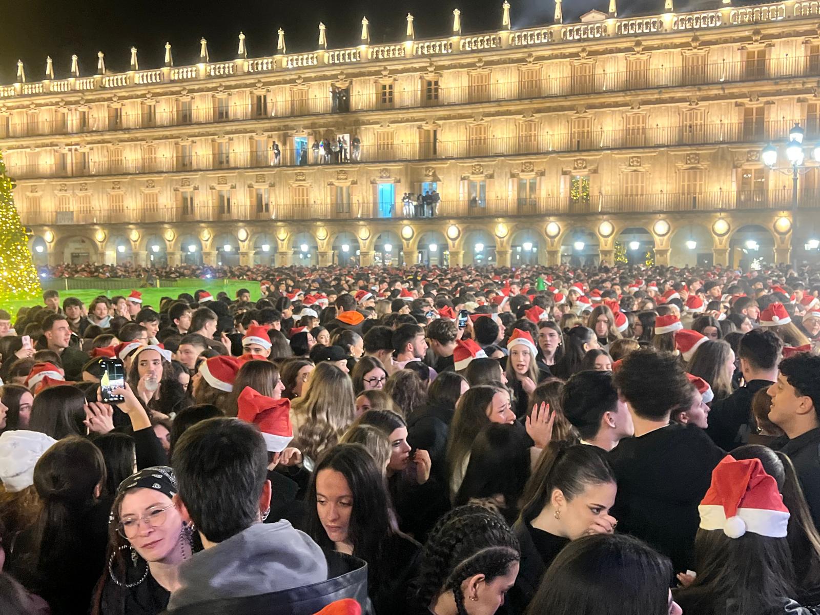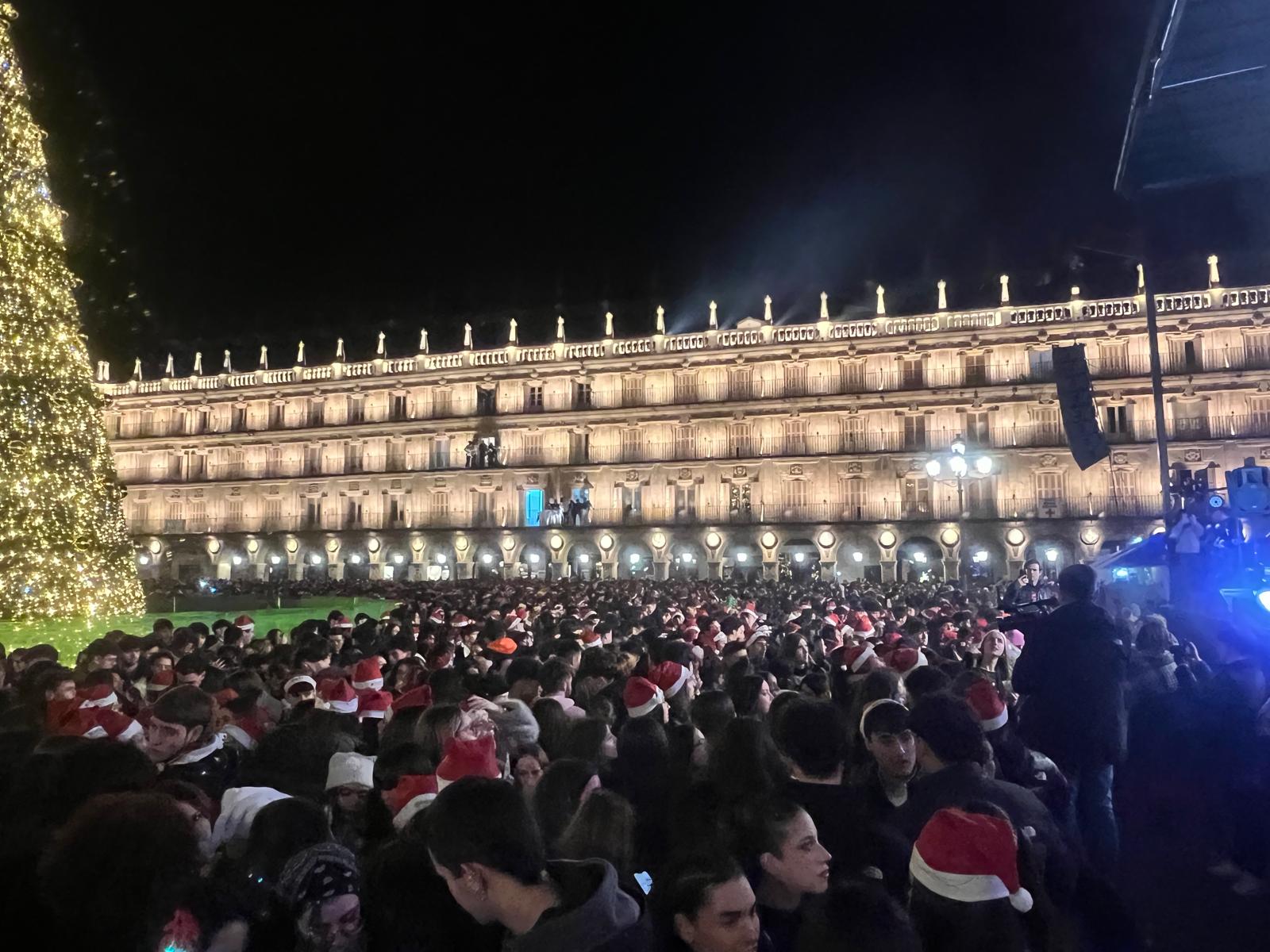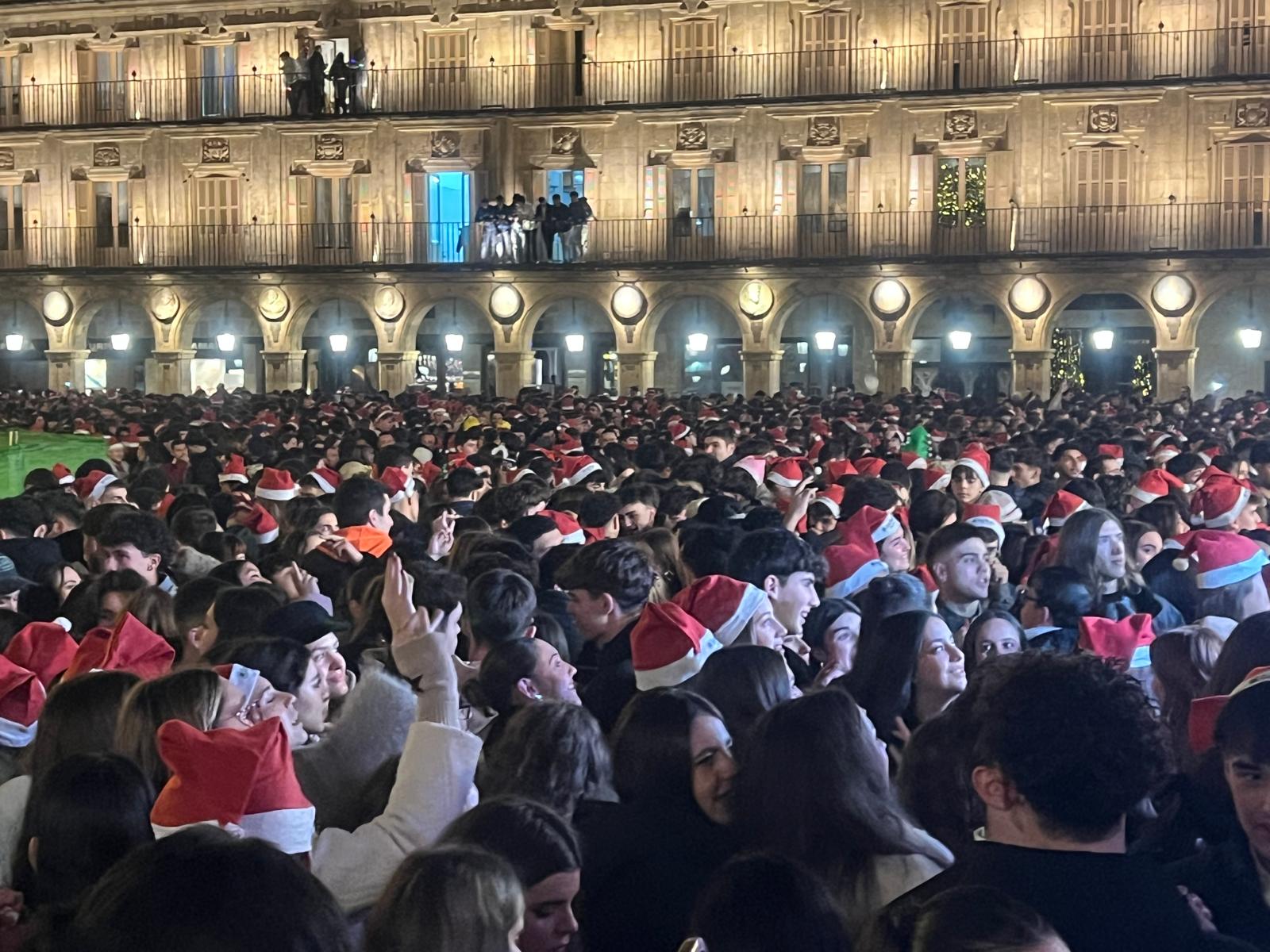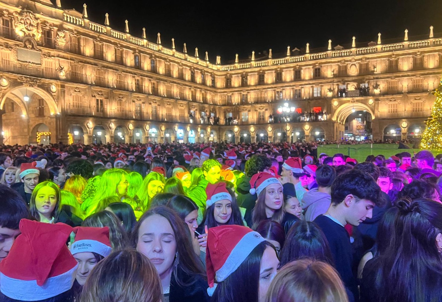 Miles de jóvenes han desafiado al intenso frío de la noche salmantina y, un año más, han abarrotado la Plaza Mayor para celebrar el Fin de Año Universitario.