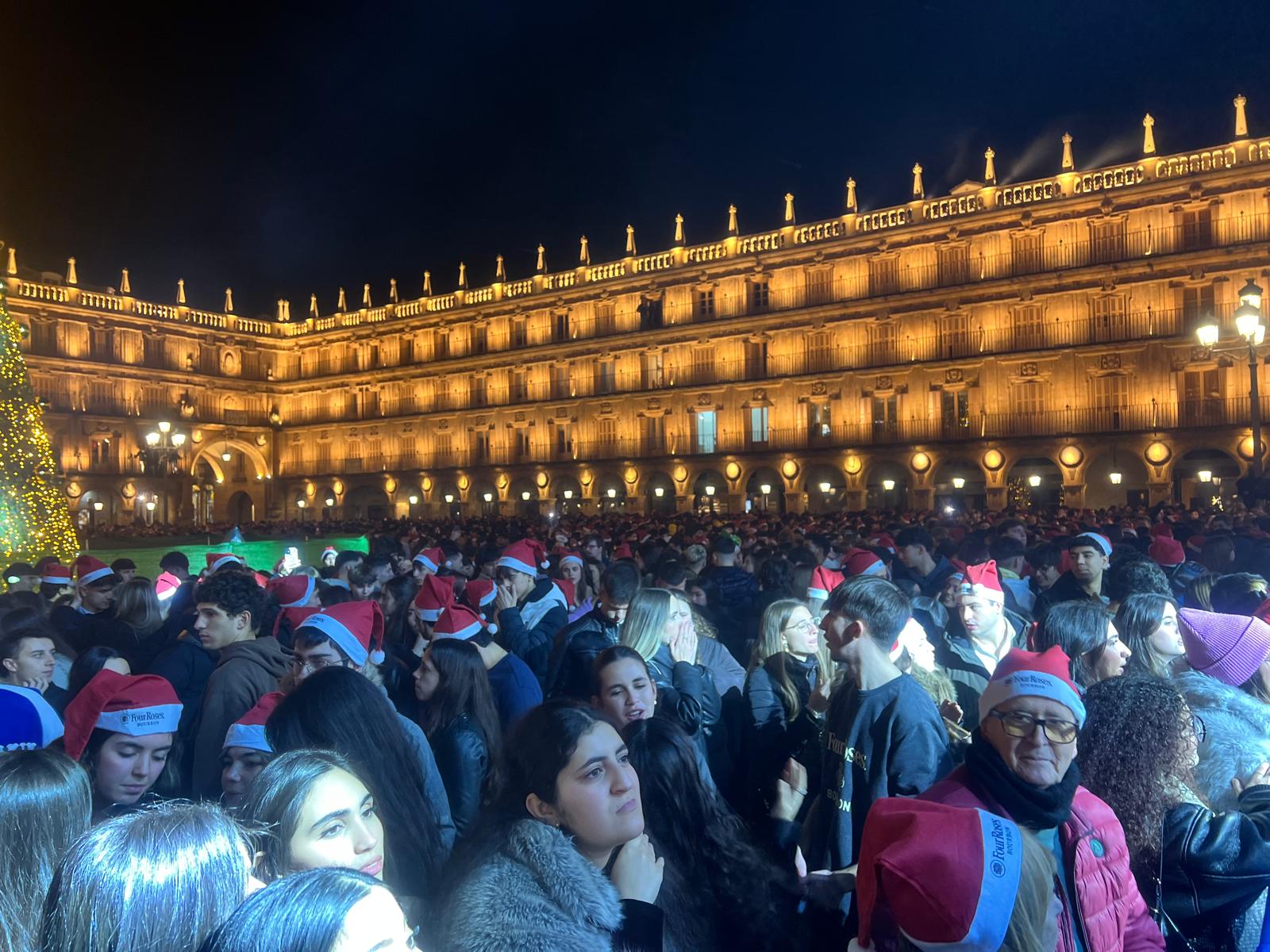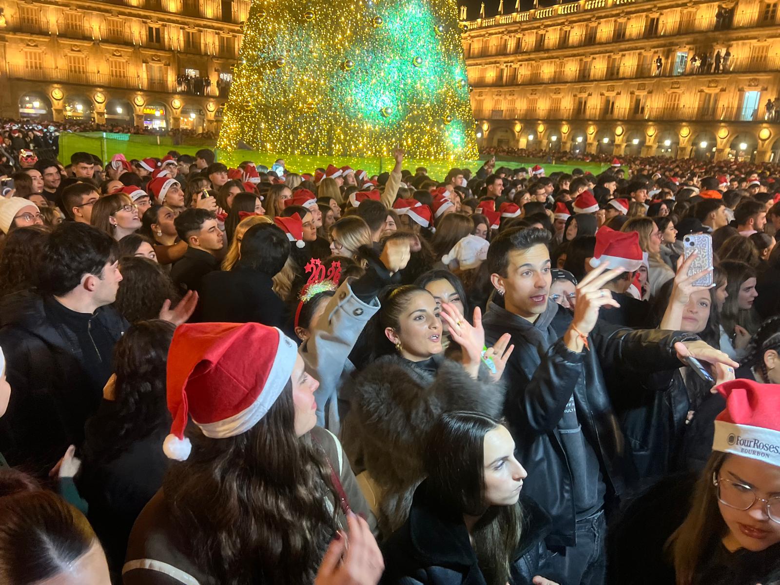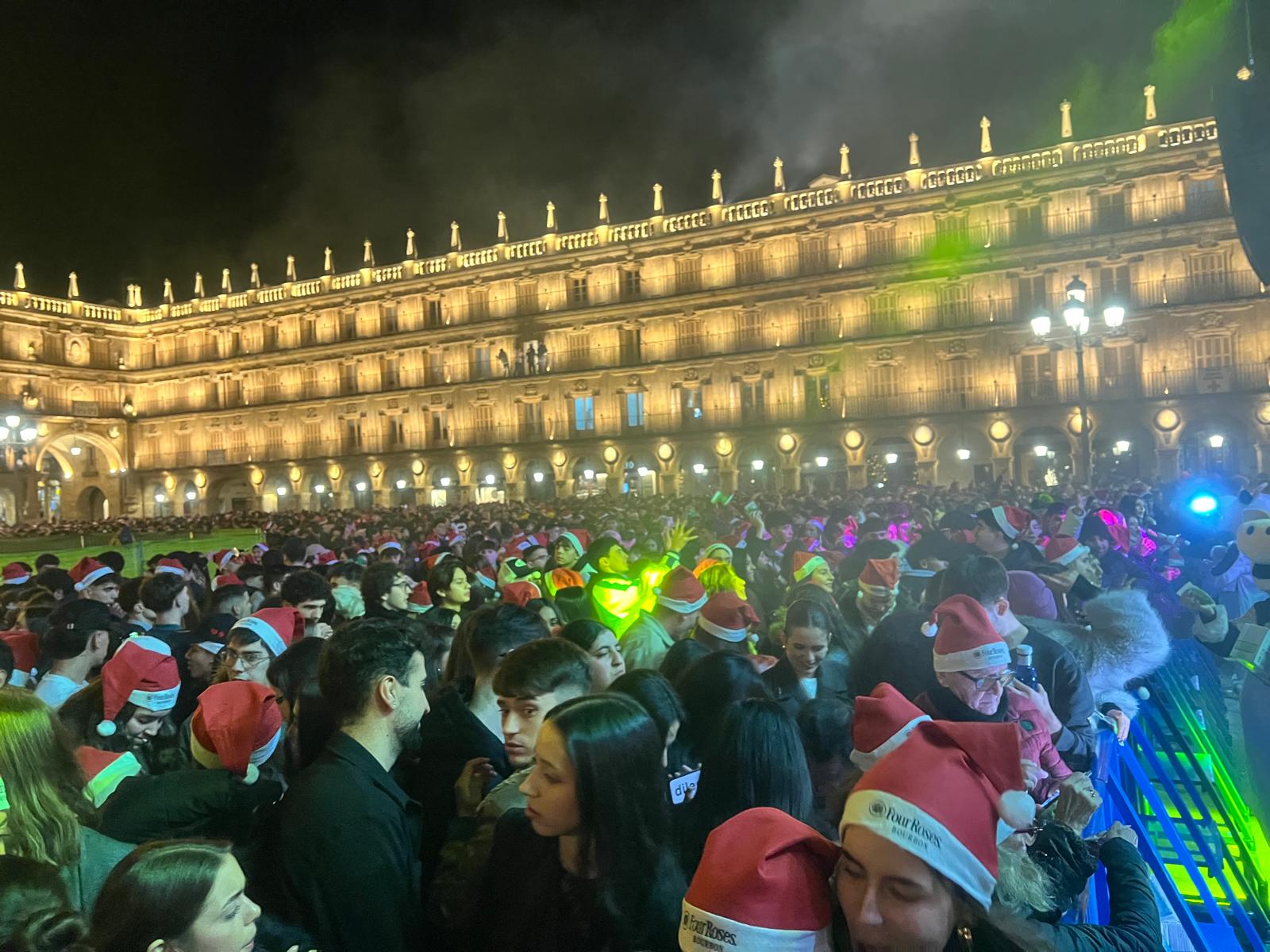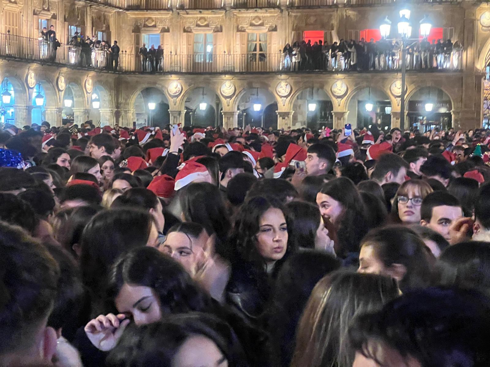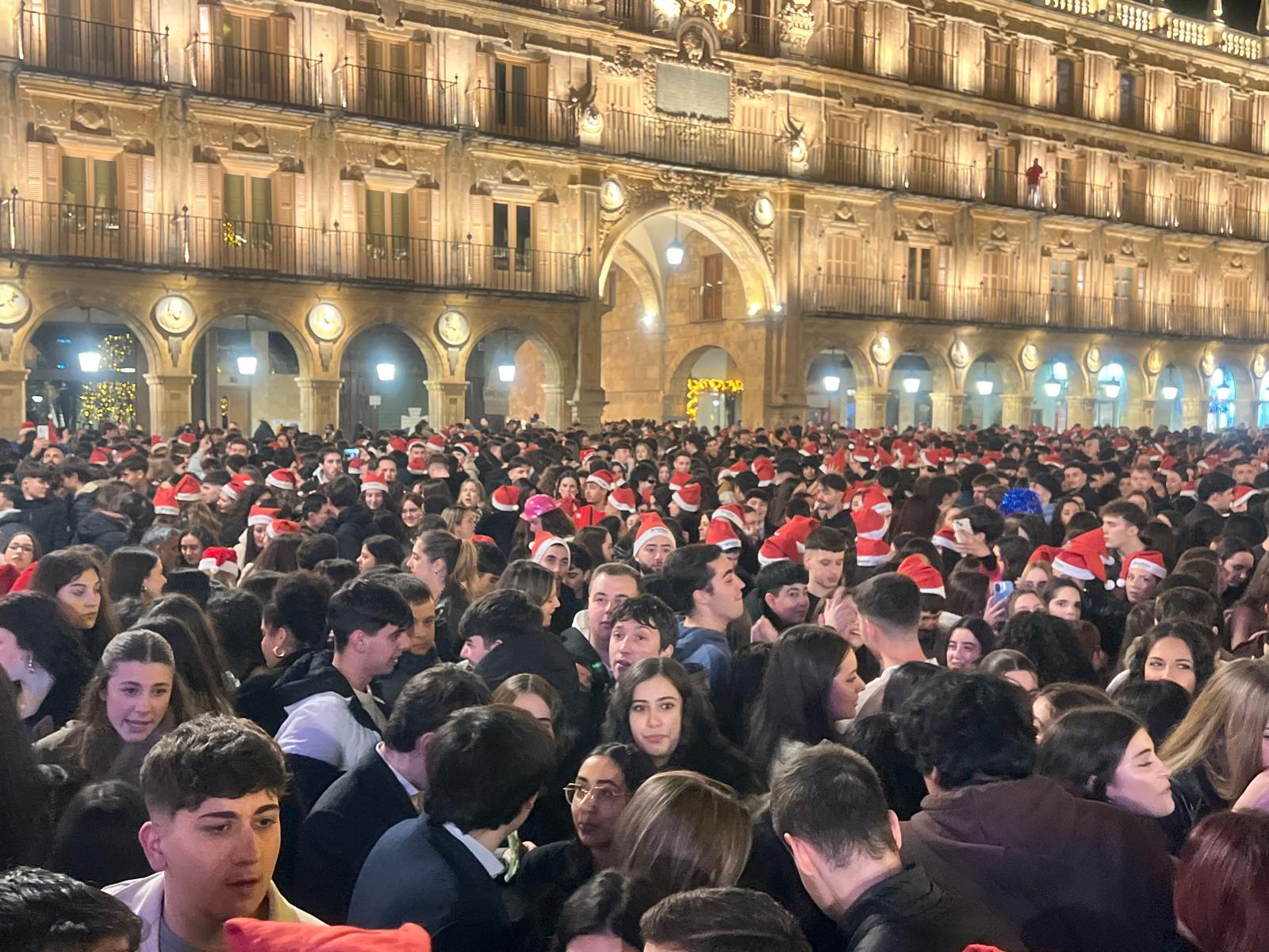 Miles de jóvenes han desafiado al intenso frío de la noche salmantina y, un año más, han abarrotado la Plaza Mayor para celebrar el Fin de Año Universitario.