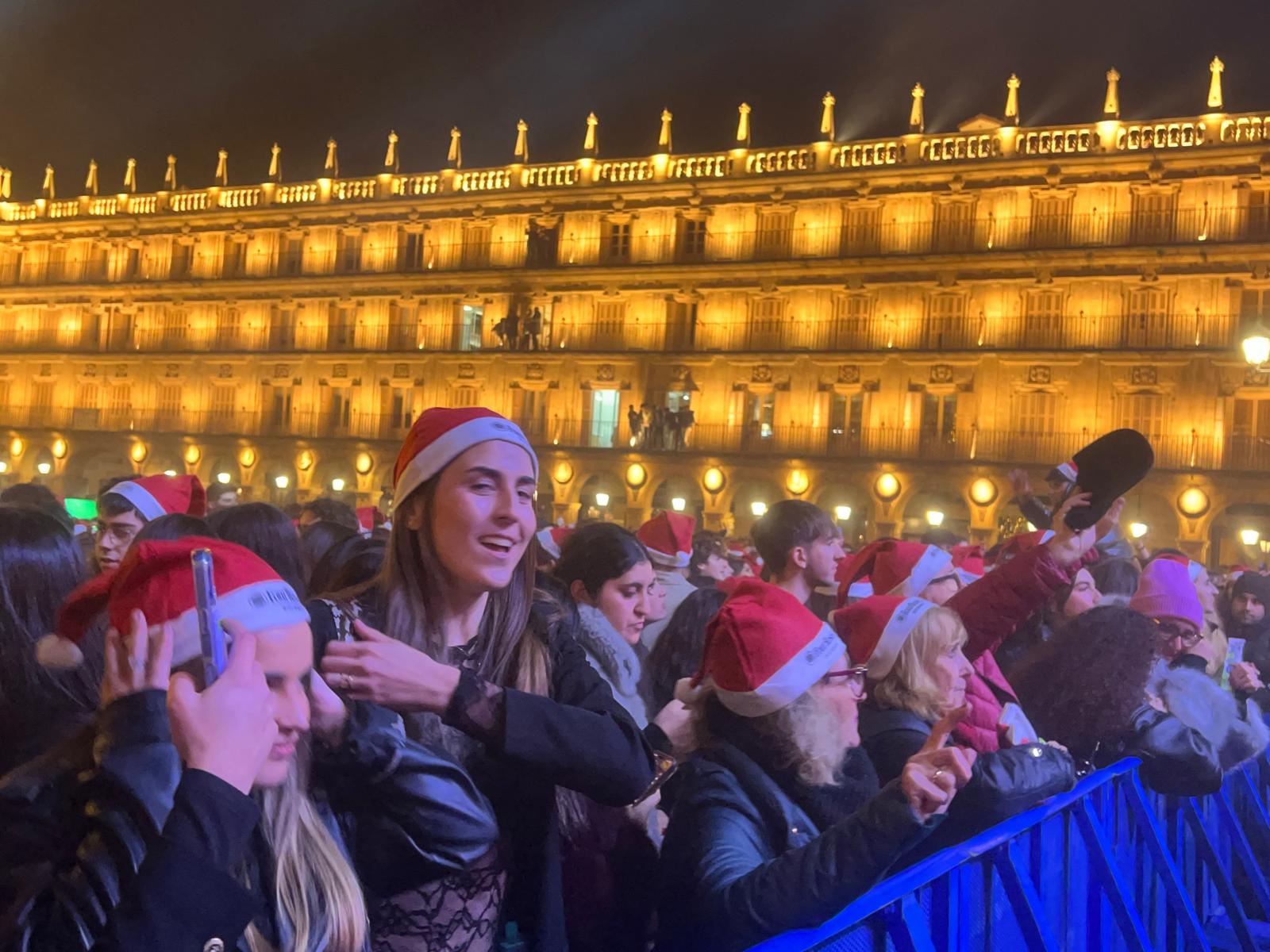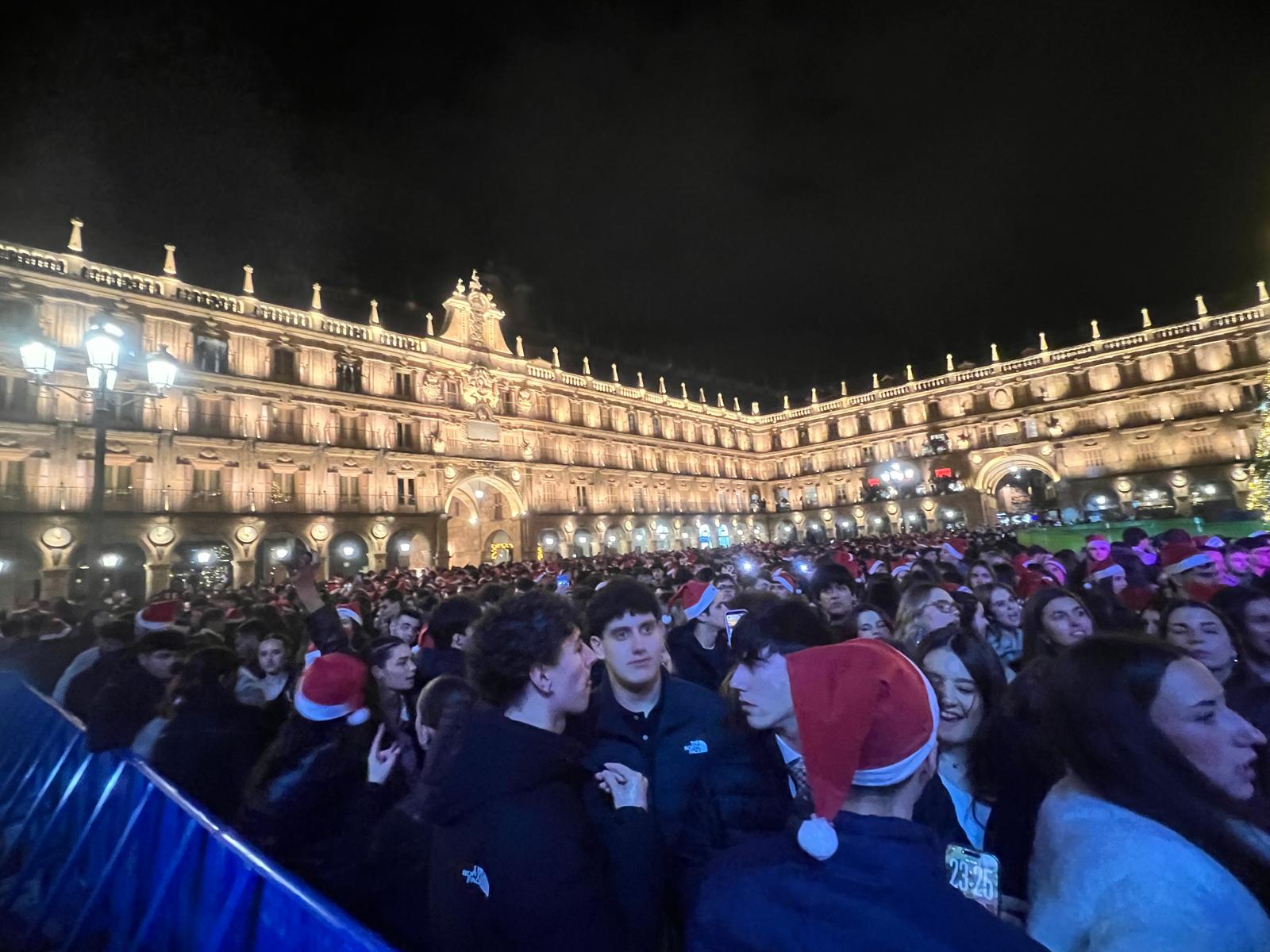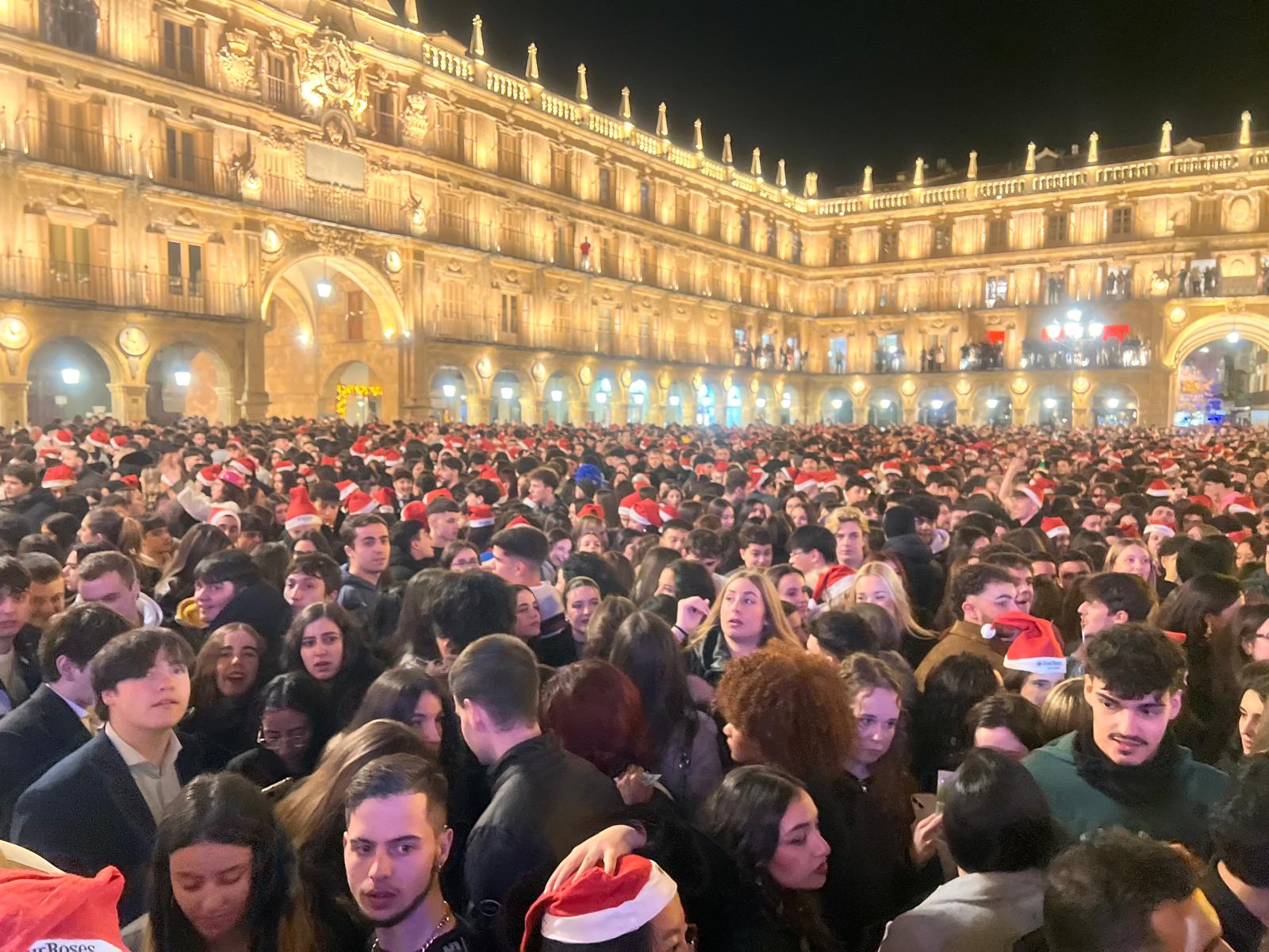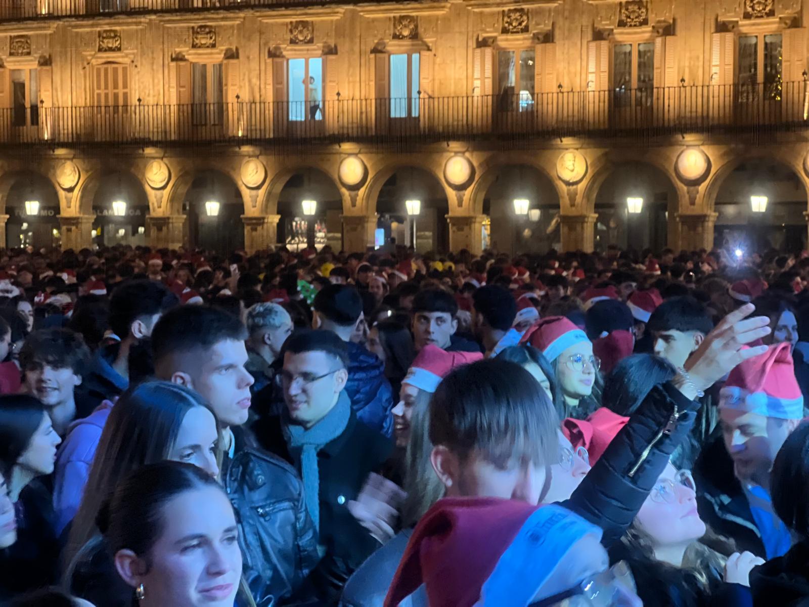 Miles de jóvenes han desafiado al intenso frío de la noche salmantina y, un año más, han abarrotado la Plaza Mayor para celebrar el Fin de Año Universitario.