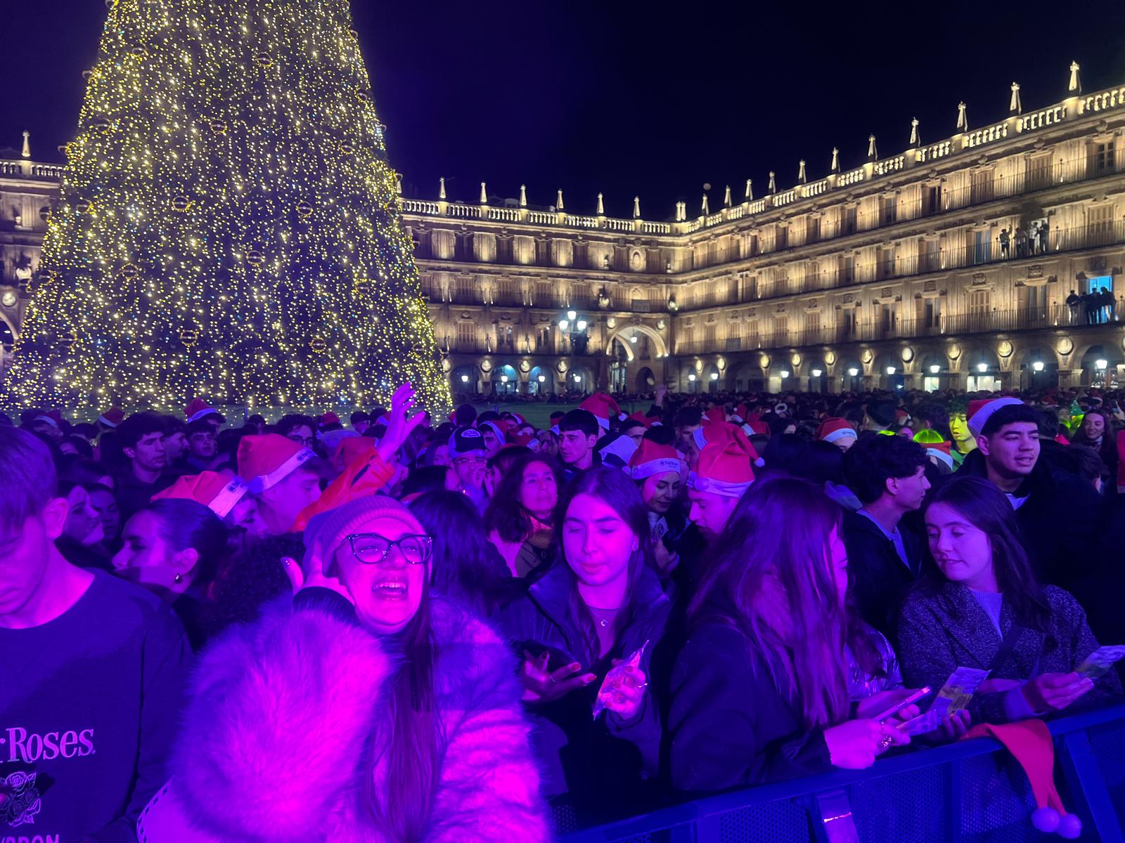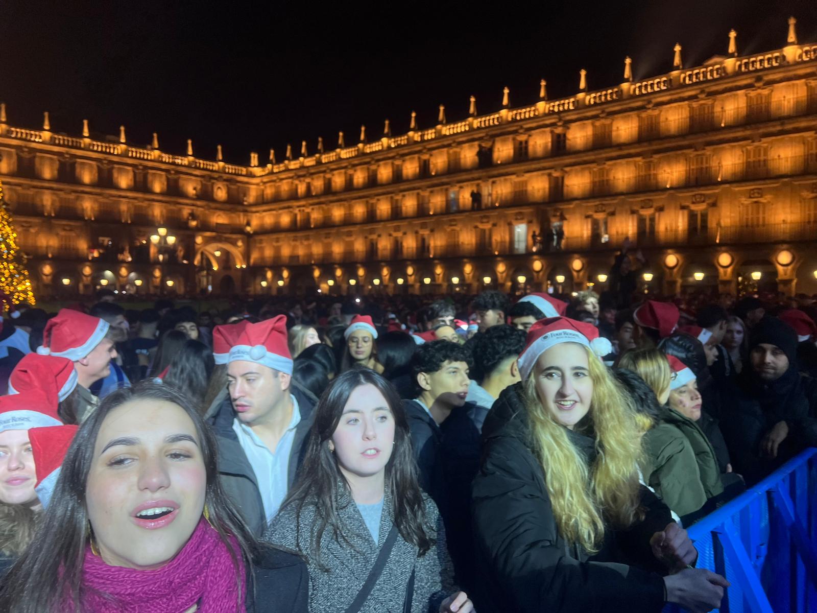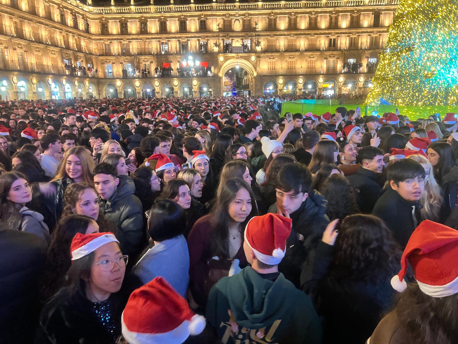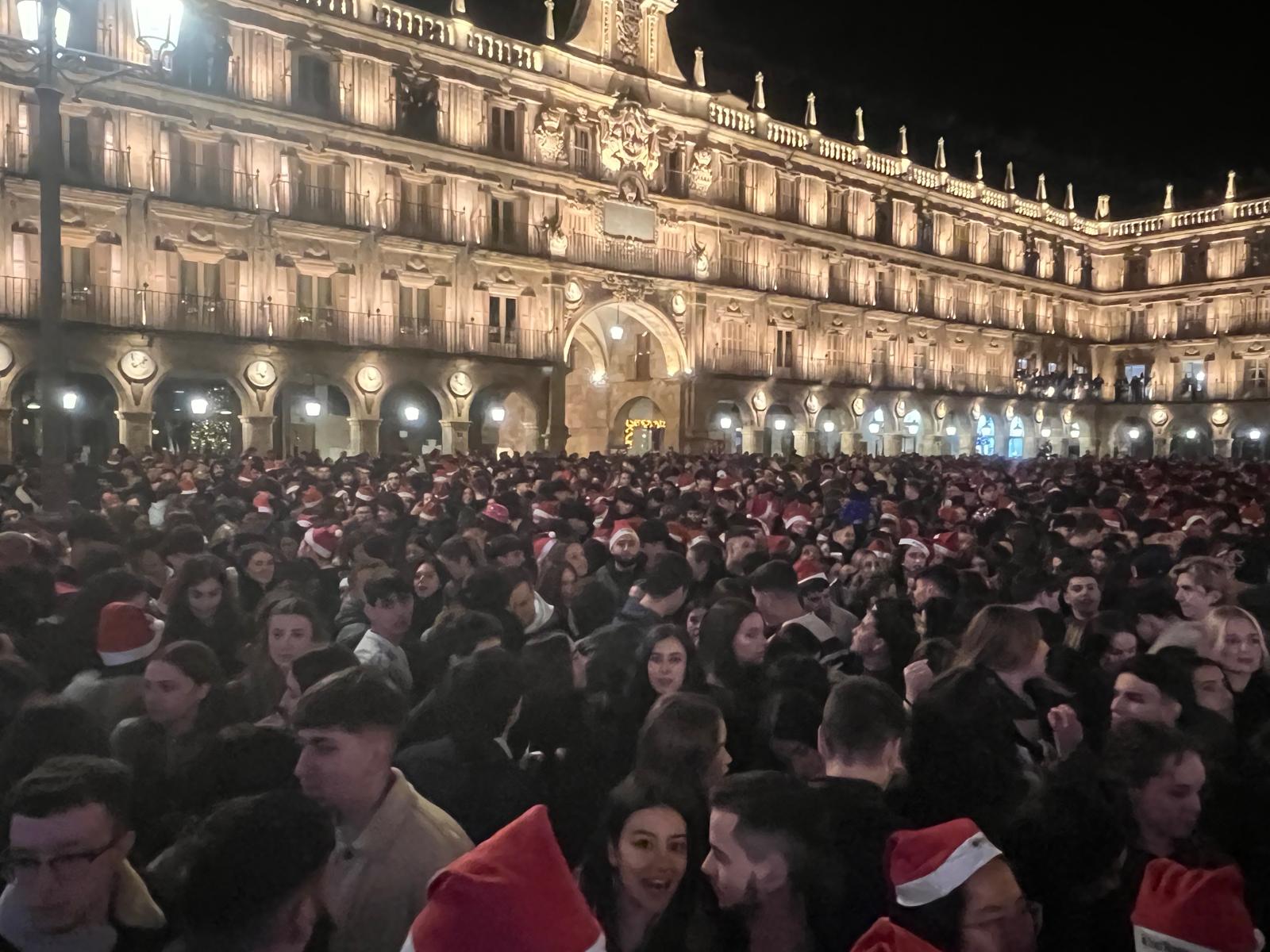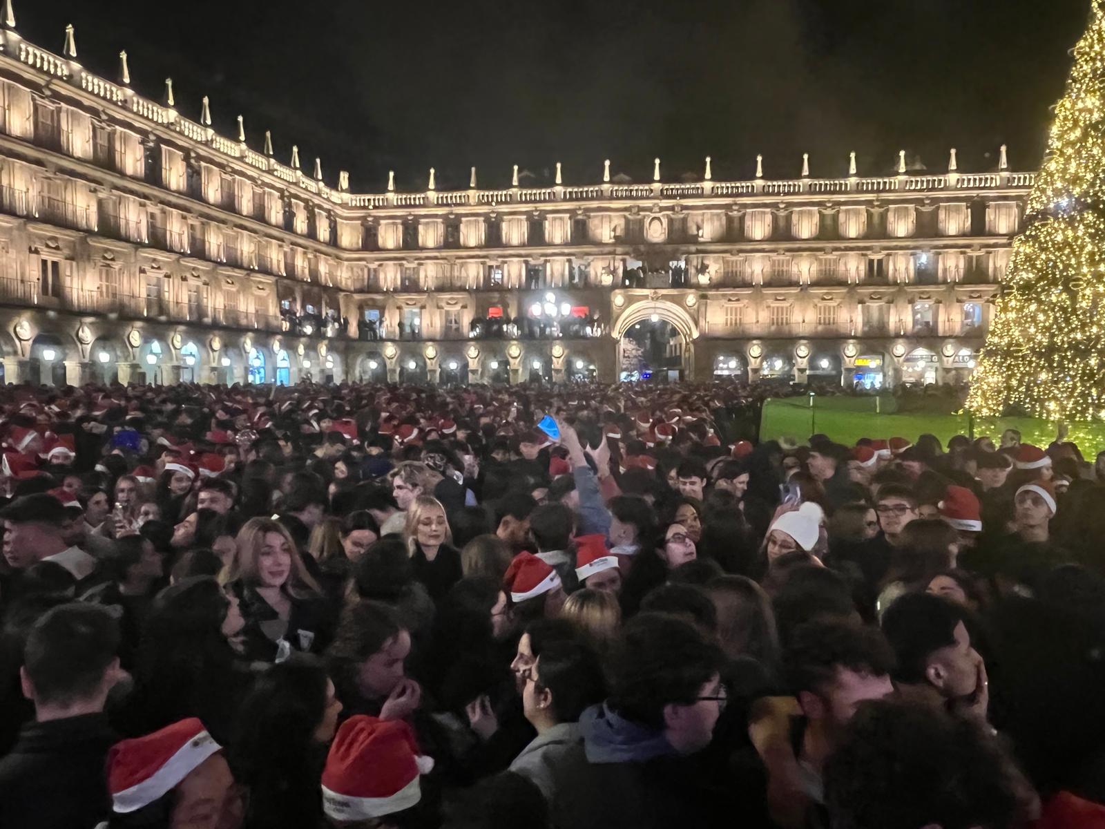 Miles de jóvenes han desafiado al intenso frío de la noche salmantina y, un año más, han abarrotado la Plaza Mayor para celebrar el Fin de Año Universitario.