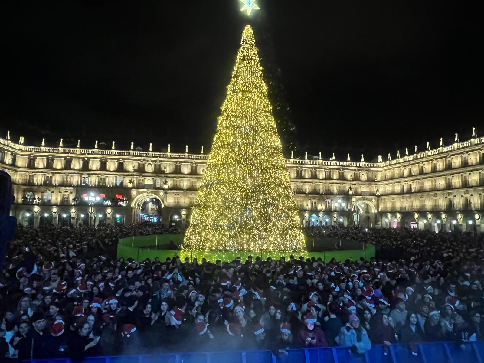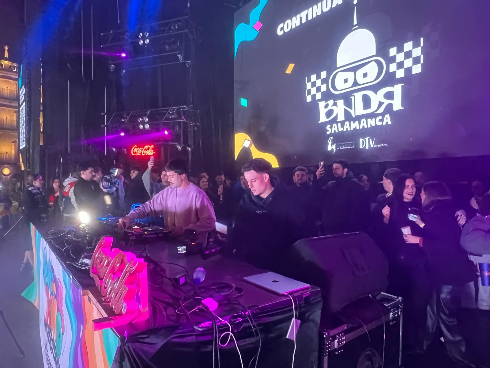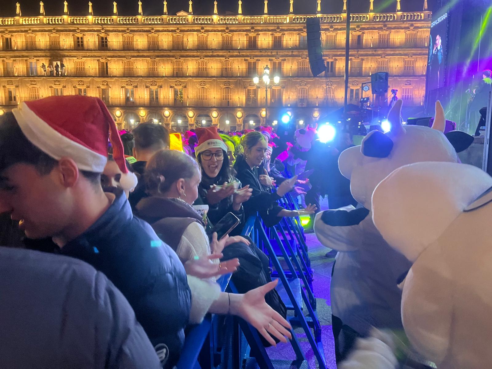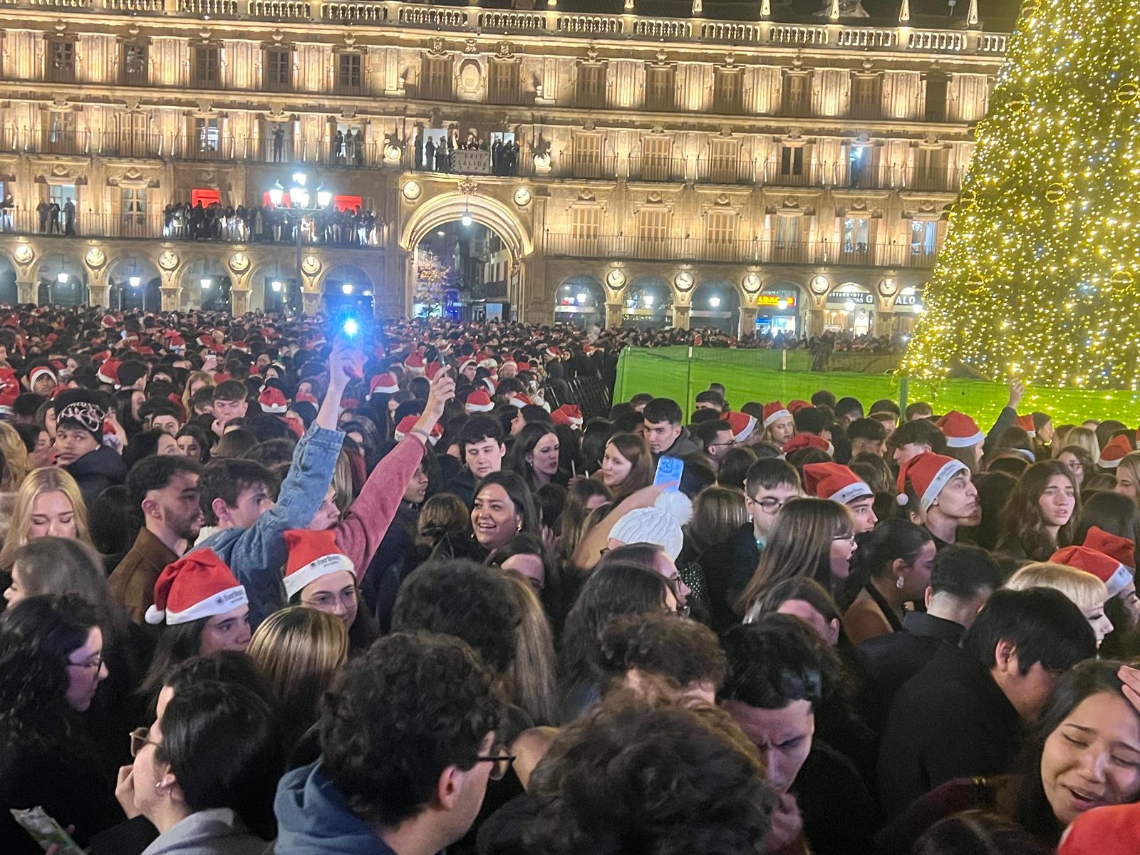 Miles de jóvenes han desafiado al intenso frío de la noche salmantina y, un año más, han abarrotado la Plaza Mayor para celebrar el Fin de Año Universitario.