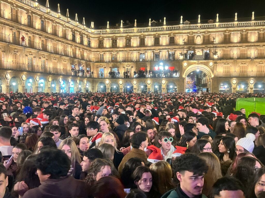 Miles de jóvenes han desafiado al intenso frío de la noche salmantina y, un año más, han abarrotado la Plaza Mayor para celebrar el Fin de Año Universitario.