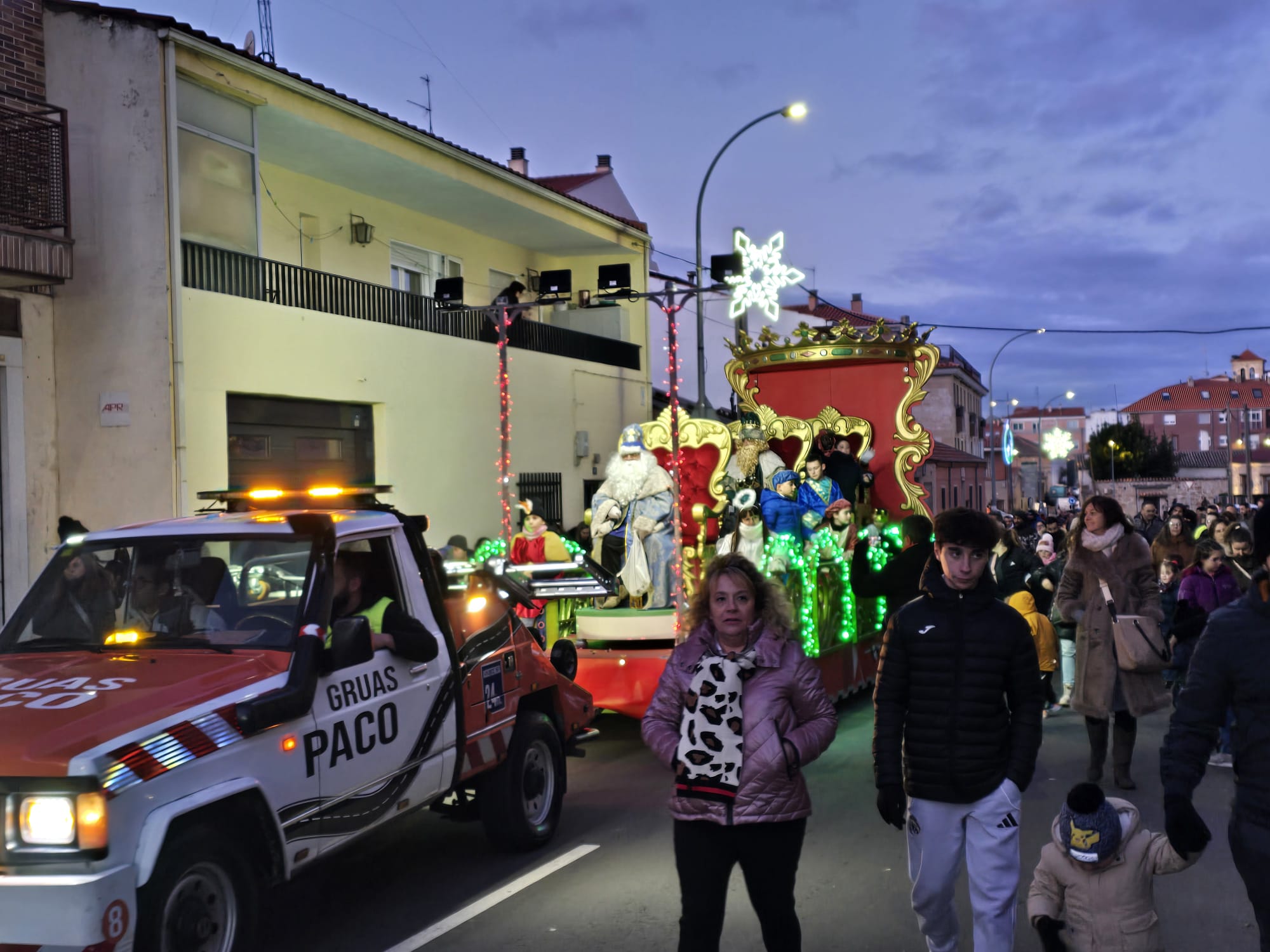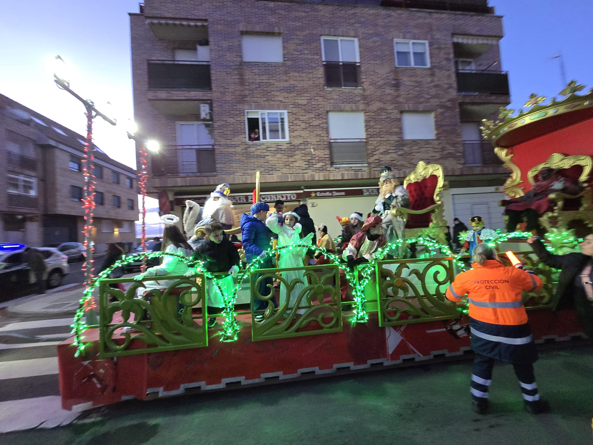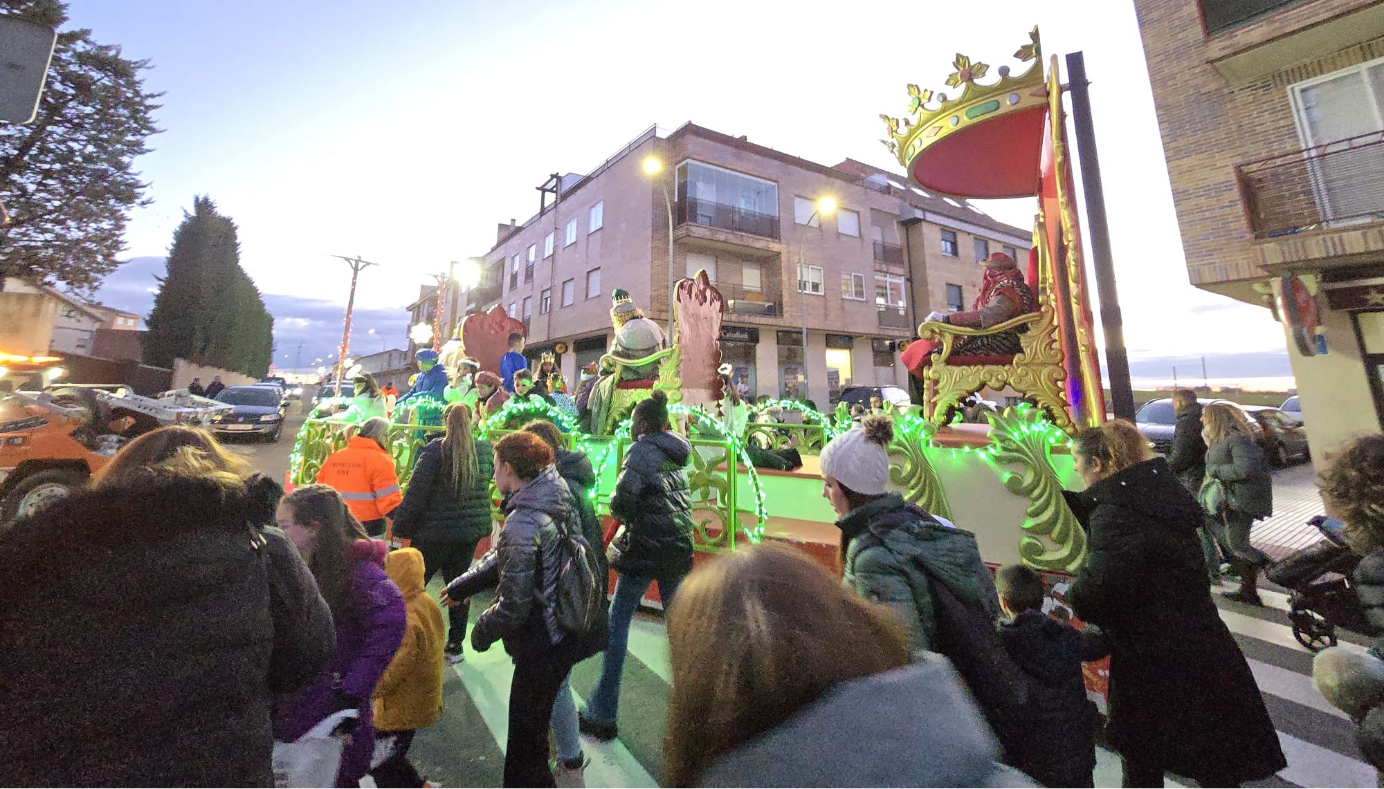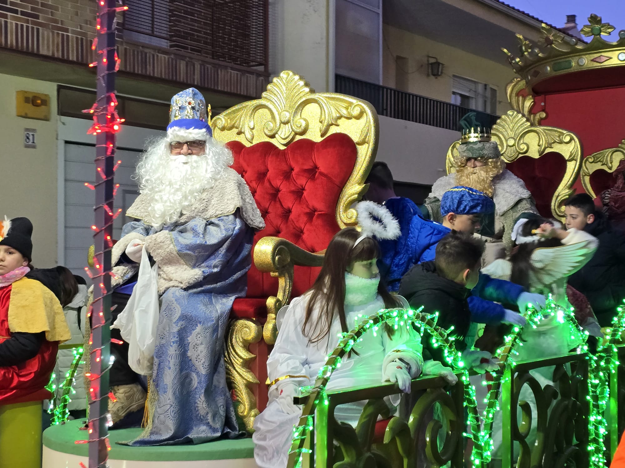 Melchor, Gaspar y Baltasar han compartido carroza en Villares. Cada uno en su trono han desfilado a paso firme para evitar el intenso frío a los niños que esperaban su llegada.