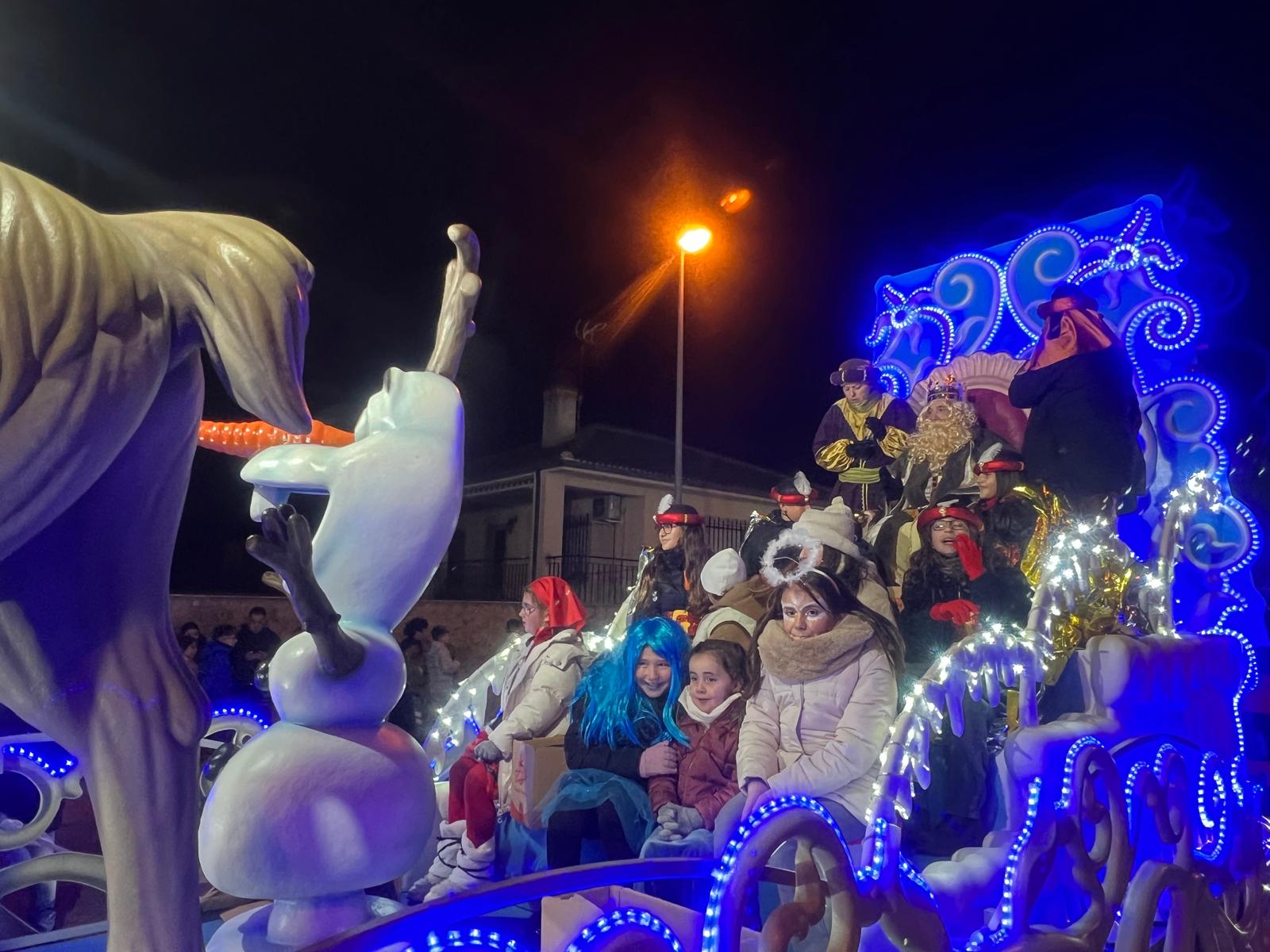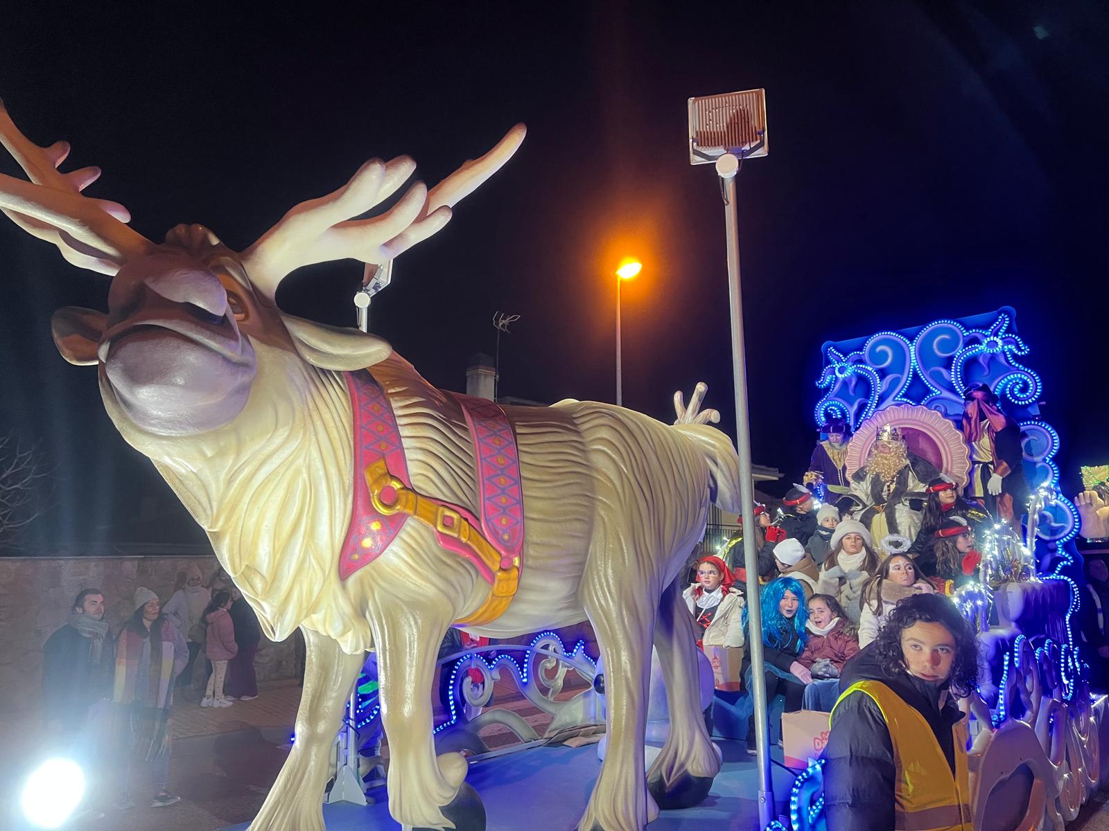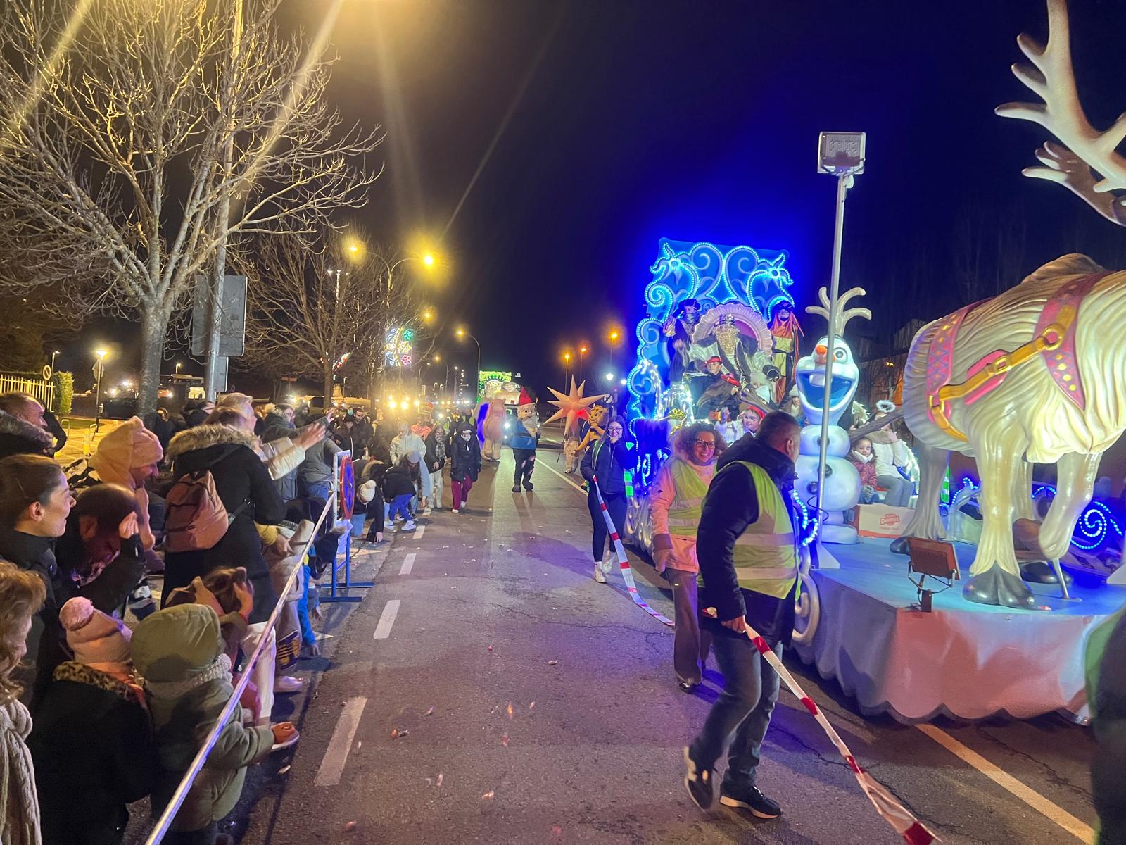 Los Reyes Magos han desfilado al ritmo de la música y los villancicos, acompañados en las carrozas por algunos niños, y han repartido 900 kilos de caramelos durante el animado recorrido, que este año ha cambiado de sentido para facilitar la marcha de la comitiva y ha partido del pabellón deportivo hacia la rotonda de entrada al municipio por la SA-300 para iniciar la bajada por la travesía principal, la calle San Miguel, y después continuar por las calles del centro urbano para completar la ruta circular hasta regresar al recinto deportivo, donde Melchor, Gaspar y Baltasar han recibido a los niños y les han entregado un cucurucho de chuches.
