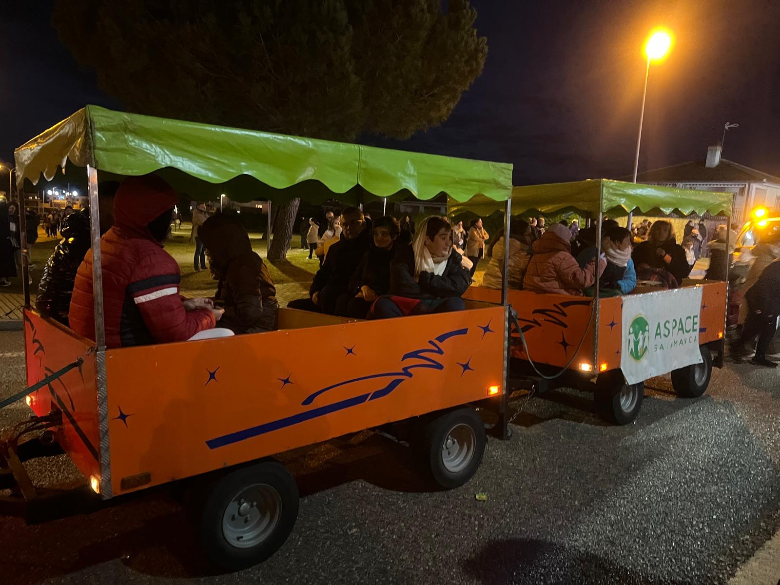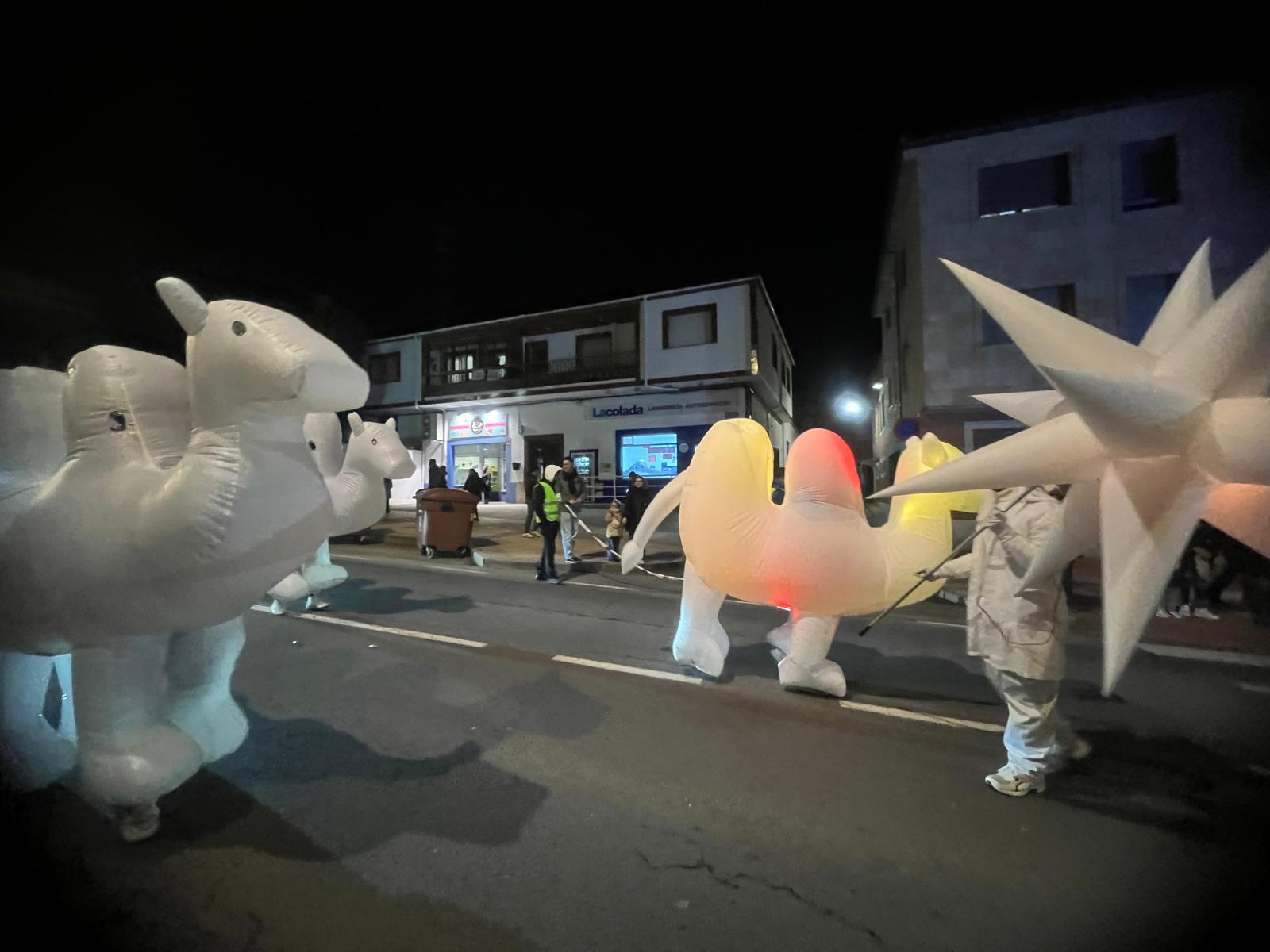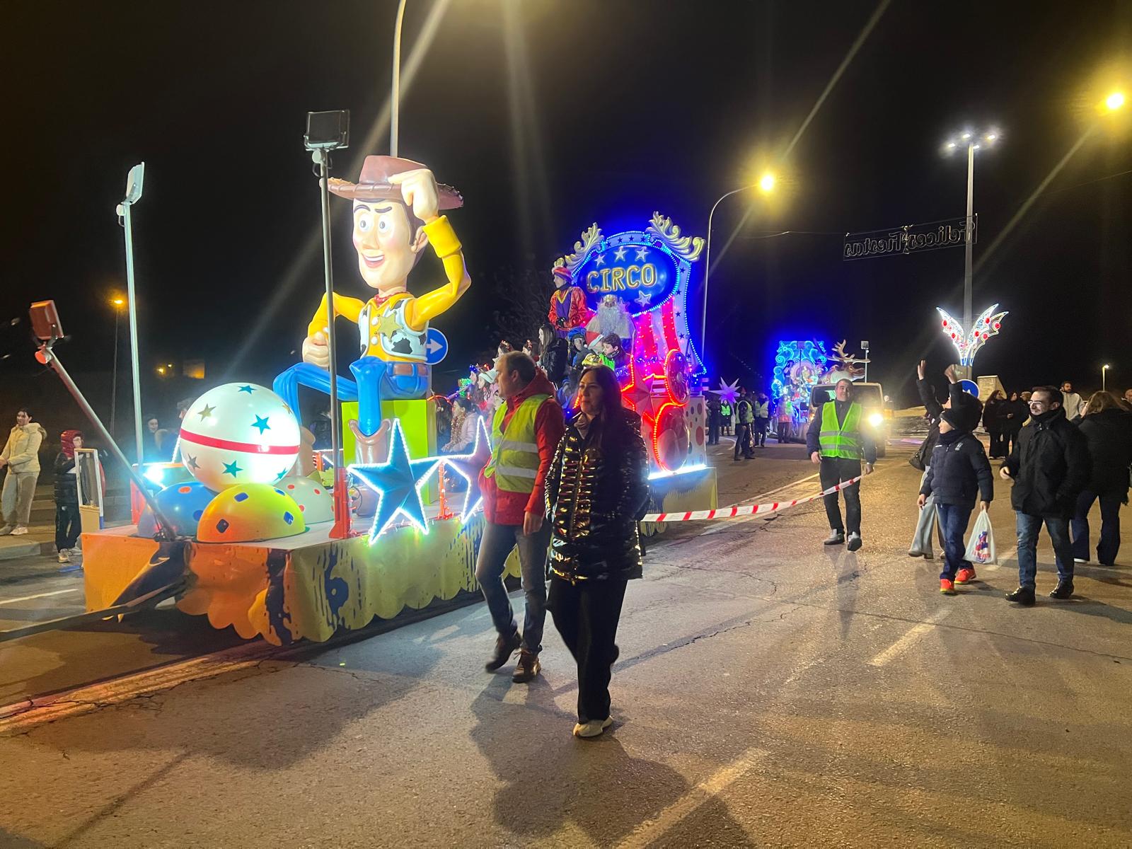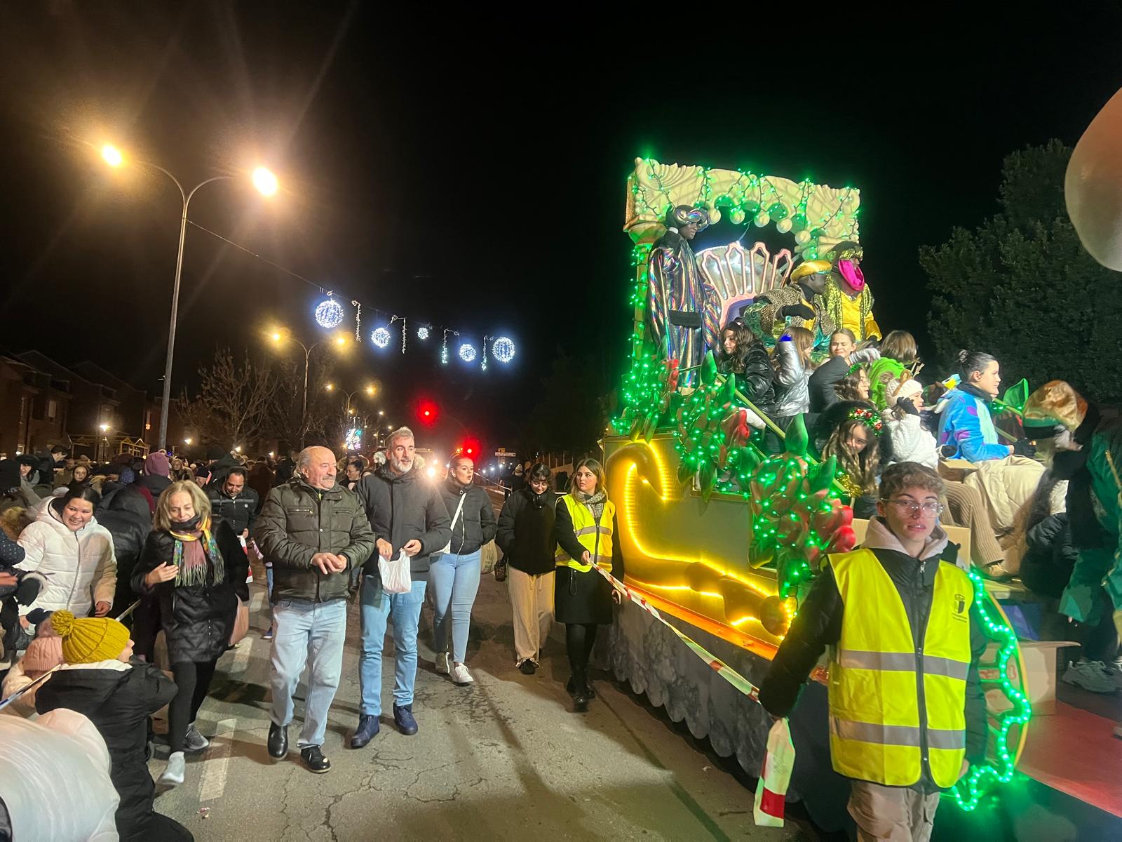 Los Reyes Magos han desfilado al ritmo de la música y los villancicos, acompañados en las carrozas por algunos niños, y han repartido 900 kilos de caramelos durante el animado recorrido, que este año ha cambiado de sentido para facilitar la marcha de la comitiva y ha partido del pabellón deportivo hacia la rotonda de entrada al municipio por la SA-300 para iniciar la bajada por la travesía principal, la calle San Miguel, y después continuar por las calles del centro urbano para completar la ruta circular hasta regresar al recinto deportivo, donde Melchor, Gaspar y Baltasar han recibido a los niños y les han entregado un cucurucho de chuches.