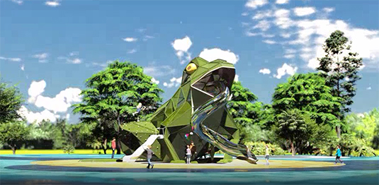 Una de las señas de identidad de este proyecto de mejora del parque de Würzburg será un gran juego infantil con forma de rana de casi 7 metros de altura y de 170 metros cuadrados de planta, con capacidad para más de 200 menores.