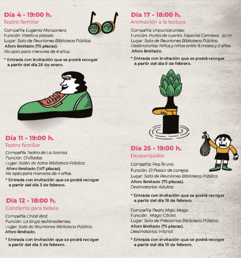 Todas las actividades cuentan con aforo limitado y sistema de invitaciones, que se podrán recoger en la Biblioteca Pública Municipal en los plazos establecidos.