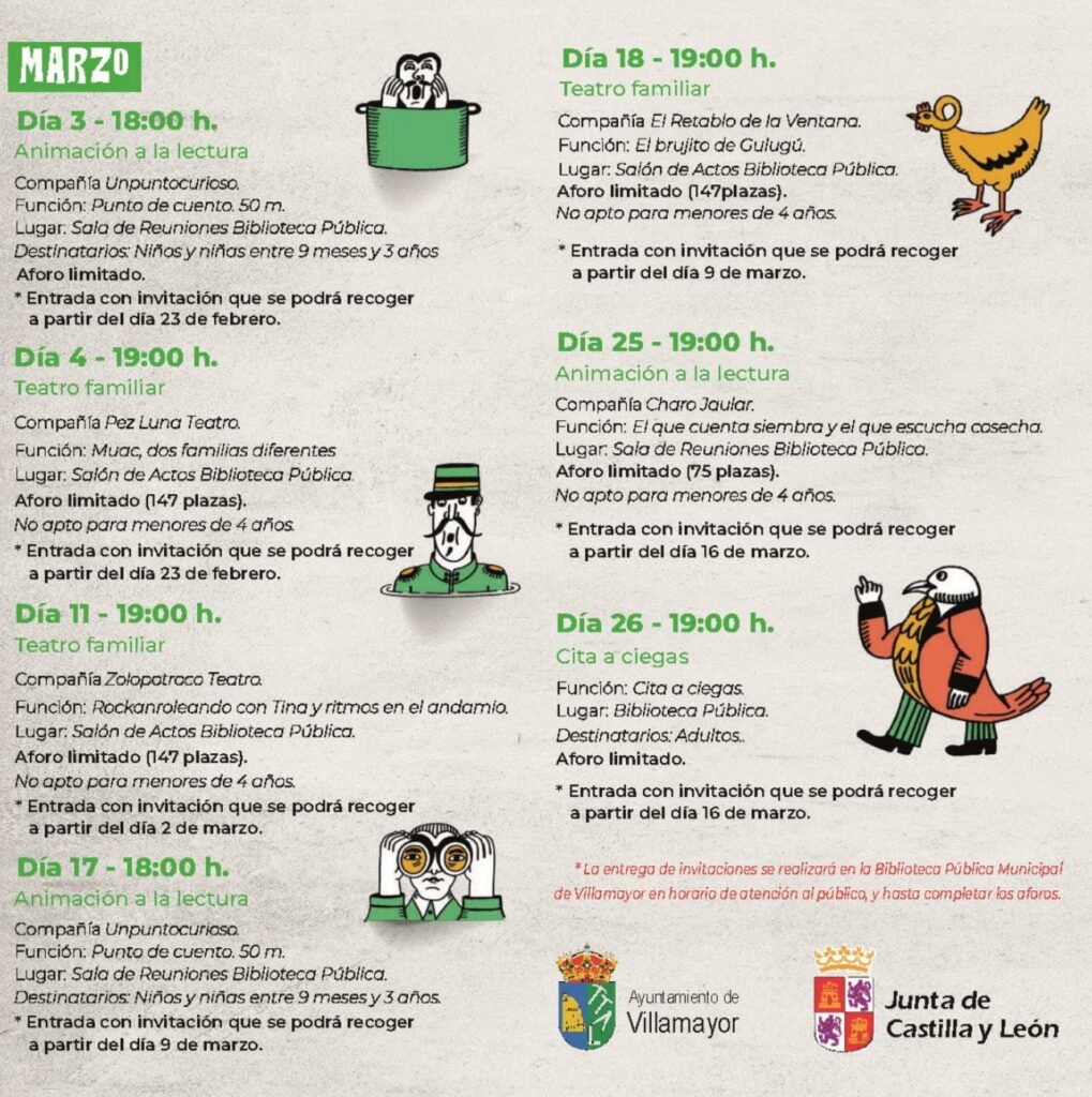 La Concejalía de Cultura de Villamayor ha presentado la programación organizada para el primer trimestre del año con cerca de una veintena de actividades culturales, en las que volverán las sesiones de animación a la lectura con cuentacuentos y bebecuentos, teatro familiar, además de un concierto para bebés y las demandas cita a ciegas y desparejados.