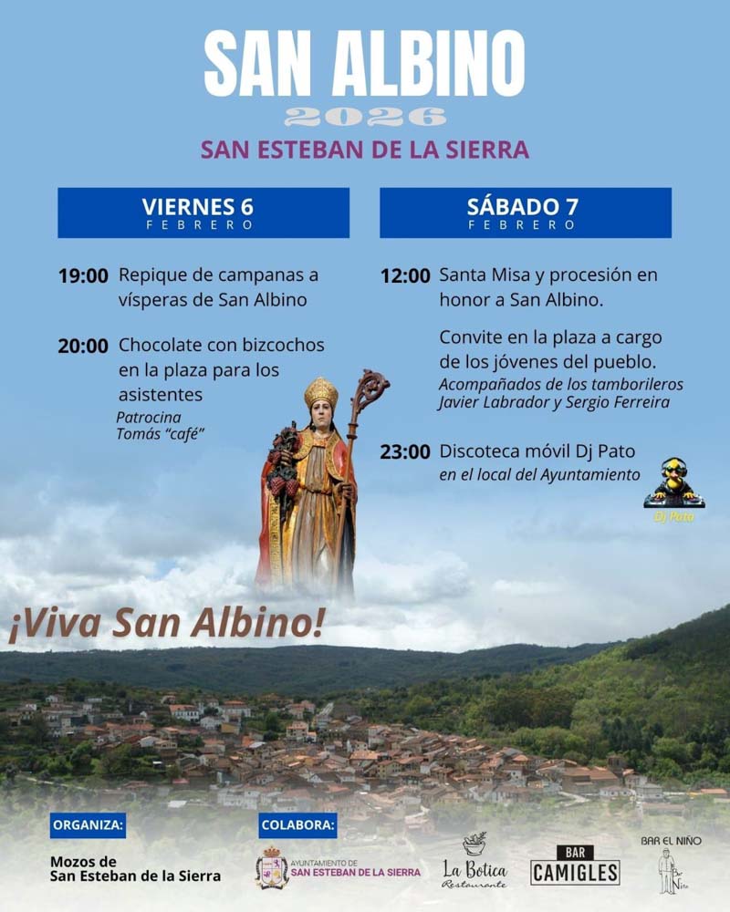 El 7 de febrero las actividades comienzan a las 12:00 horas con la misa y la procesión en honor a San Albino que darán paso al convite en la plaza organizado por los jóvenes del pueblo, que estarán acompañados por los tamborileros Javier Labrador y Sergio Ferreira.