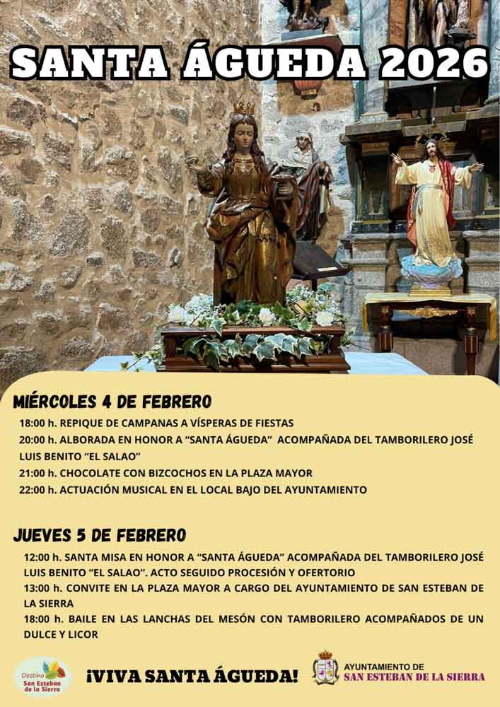El 5 de febrero se celebra el día de Santa Águeda, que recibirá su merecido homenaje en la misa, la procesión y el ofertorio que darán comienzo en torno al mediodía con el acompañamiento musical de “El Salao” y que darán paso al tradicional convite que cada año ofrece el Ayuntamiento de San Esteban de la Sierra en la Plaza Mayor.