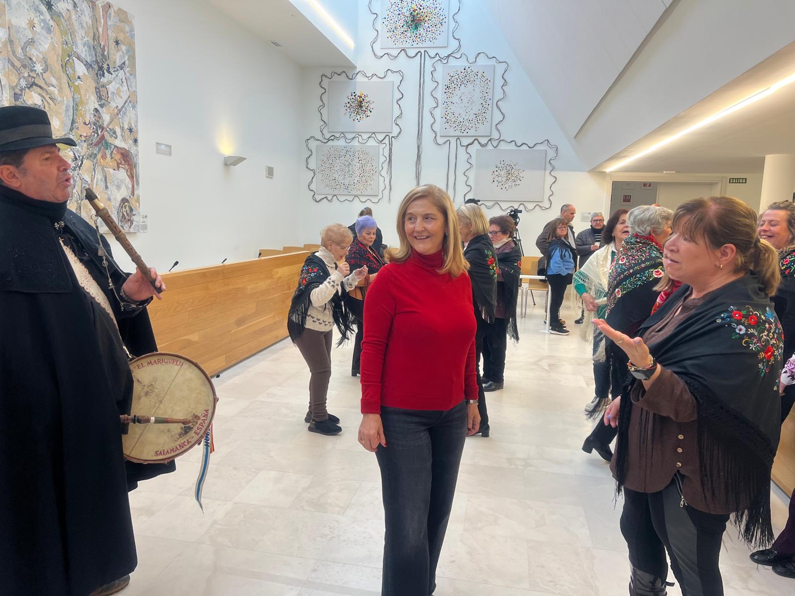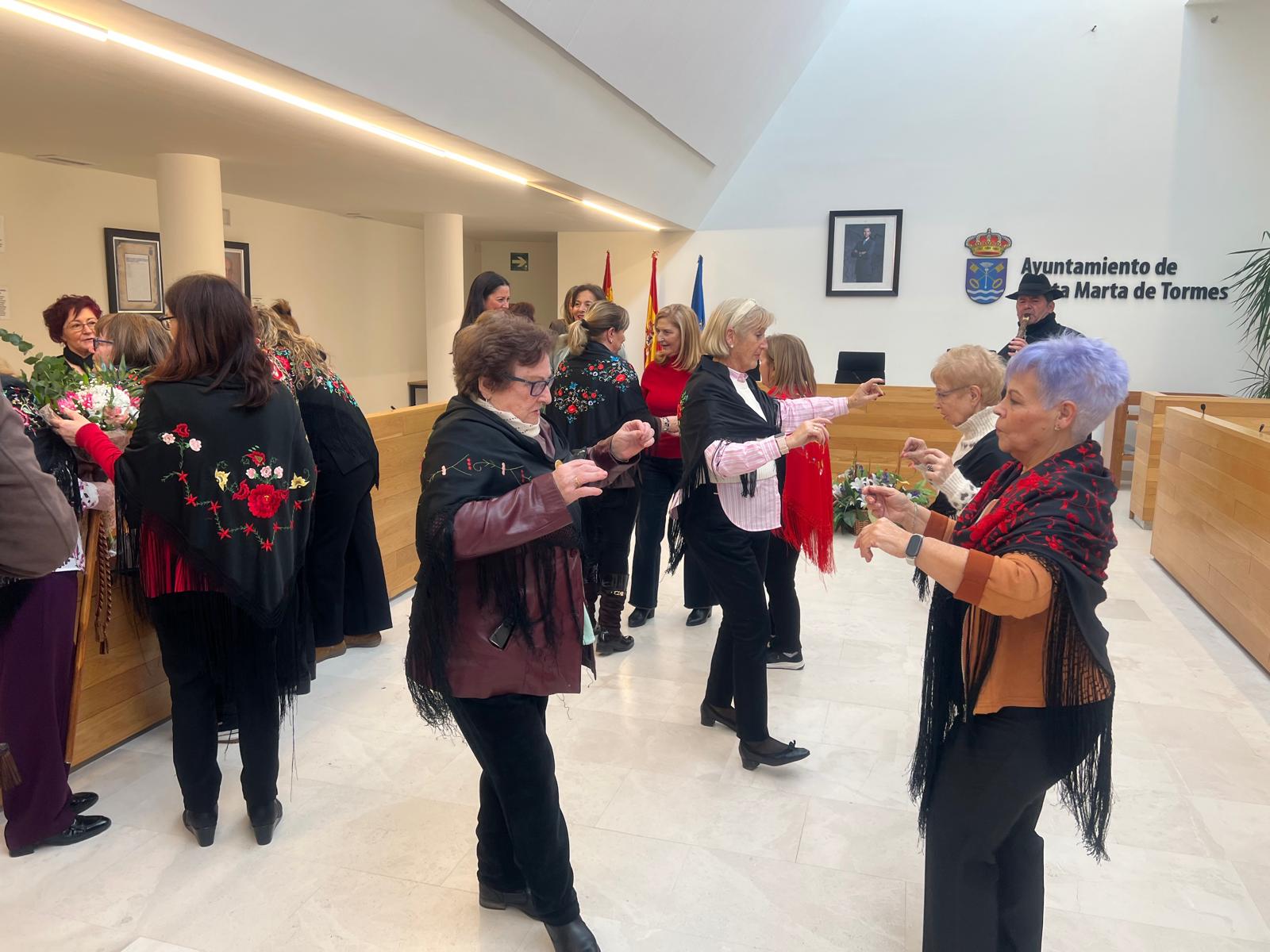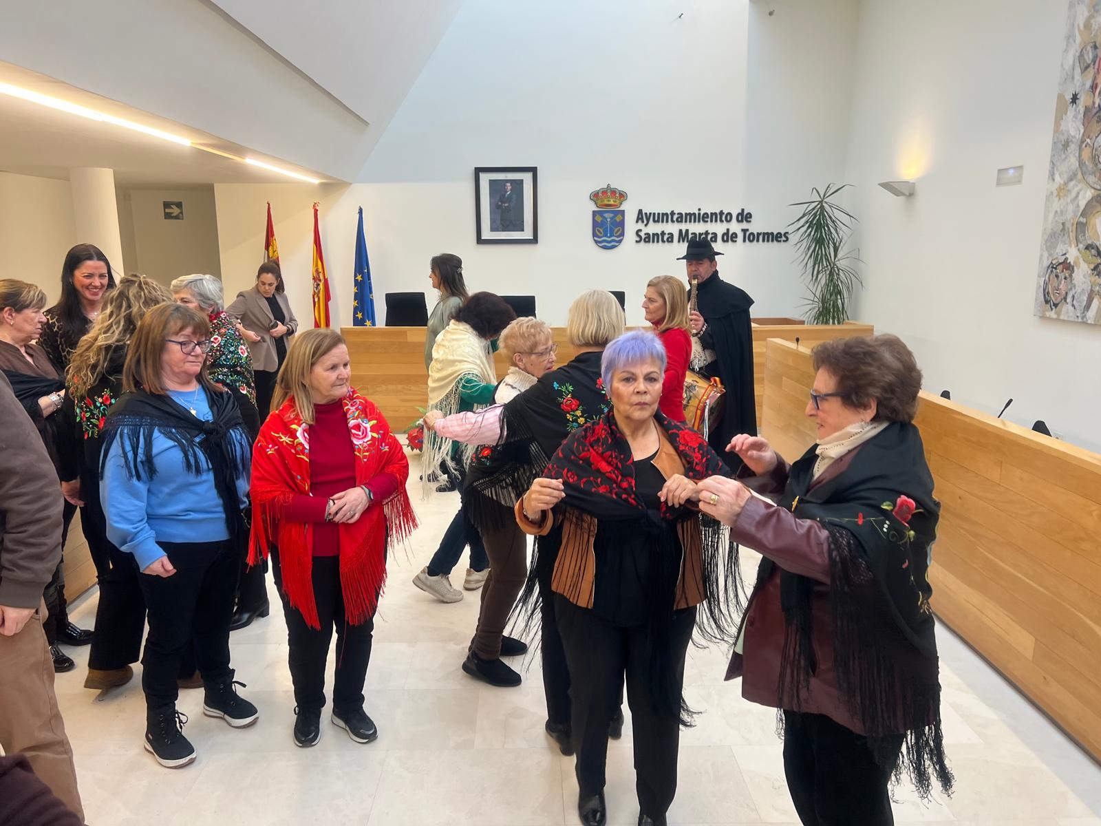 Las Águedas, ataviadas con sus mantones de Manila, han llenado el salón de plenos de música y bailes ataviadas con sus mantones y repartiendo dulces y vino moscatel para animar la jornada y han continuado la celebración de su primer día de fiesta.