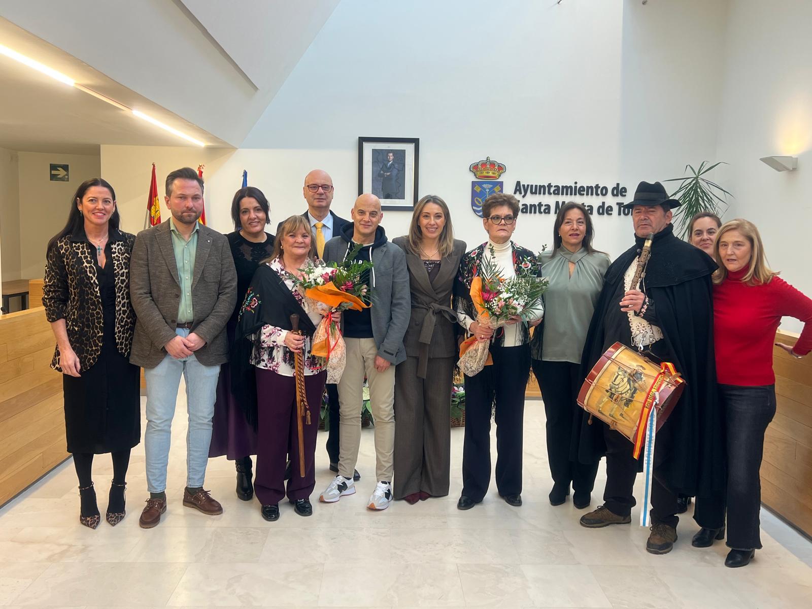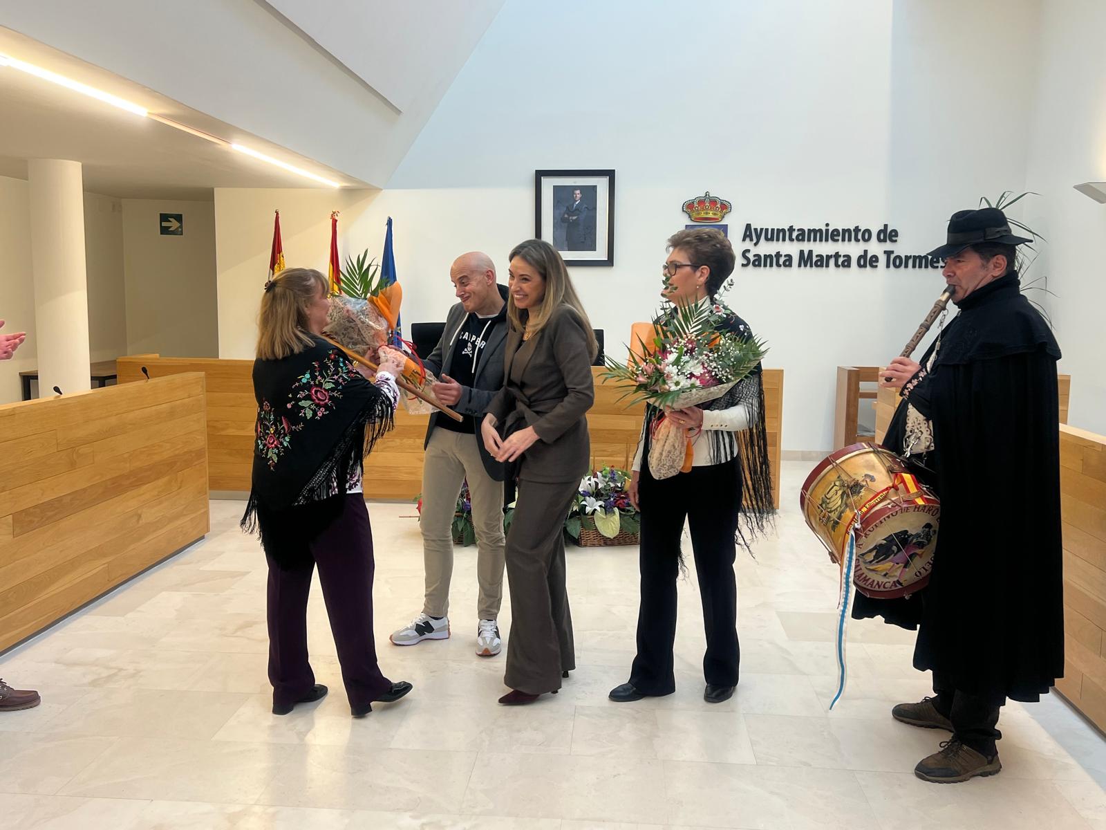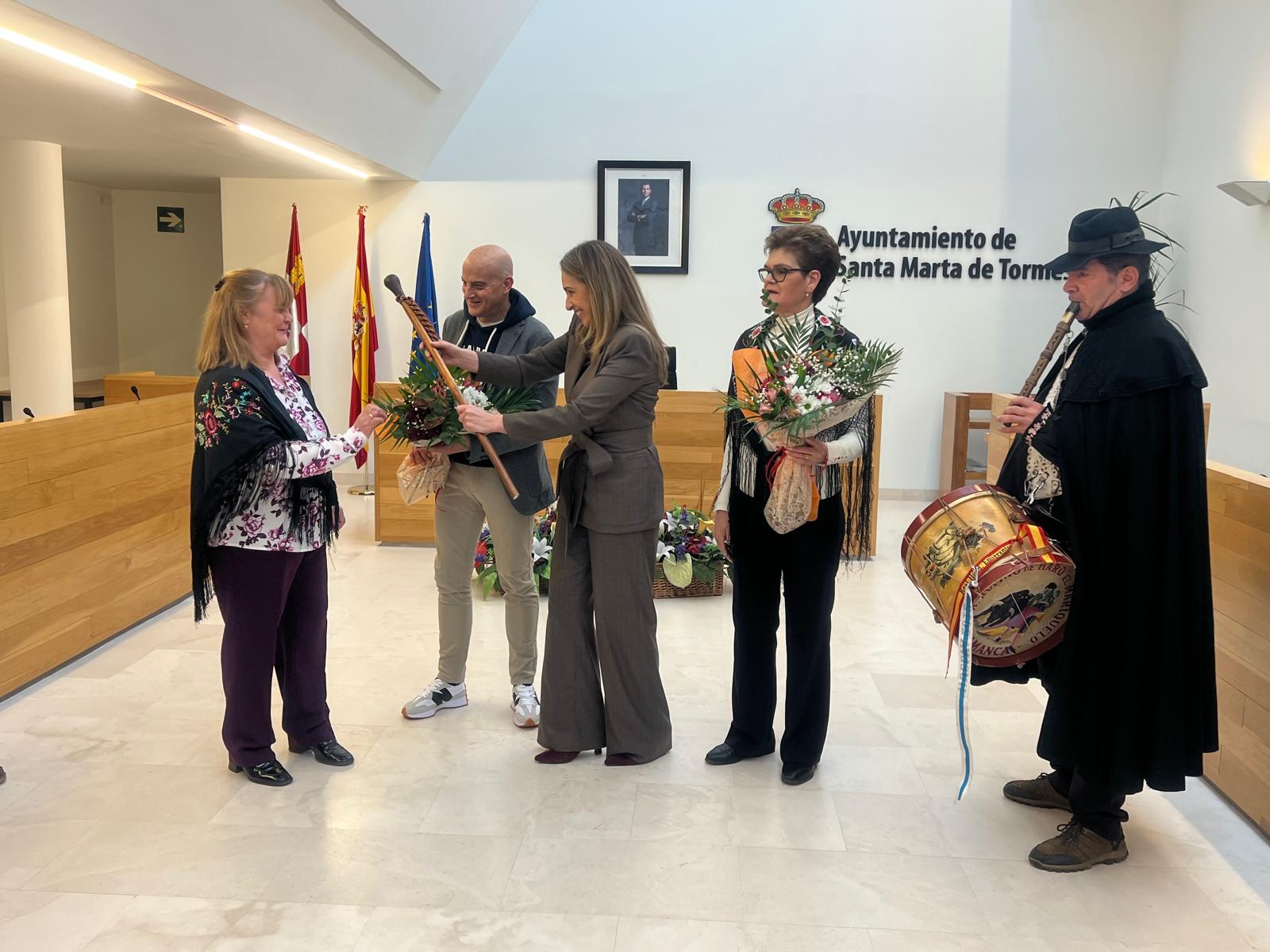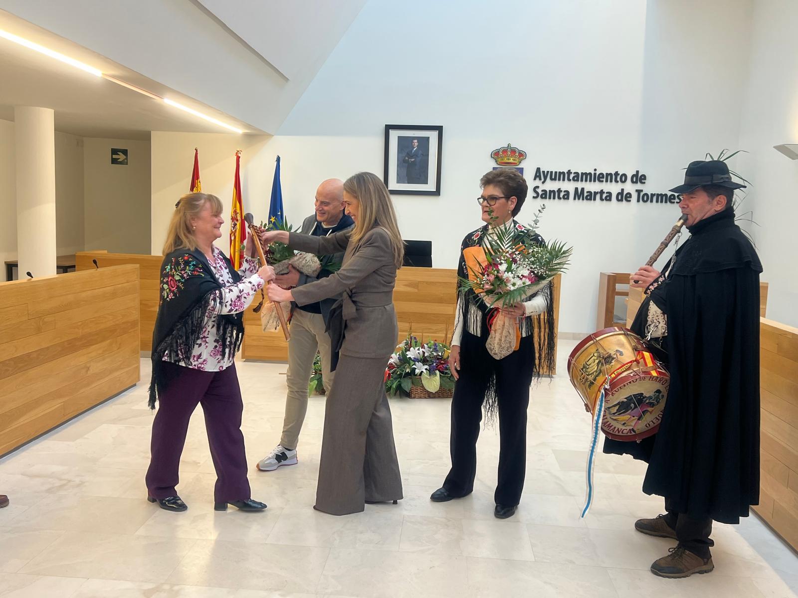 La teniente de alcalde, Marta Labrador, ha sido la encargada de entregar el bastón de mando a la aguedera mayor de este año, Teo Gutiérrez, que ha recibido el cargo de su antecesora, Antonia Carrasco, al ritmo de la música de la gaita y el tamboril de ‘El Mariquelo’.