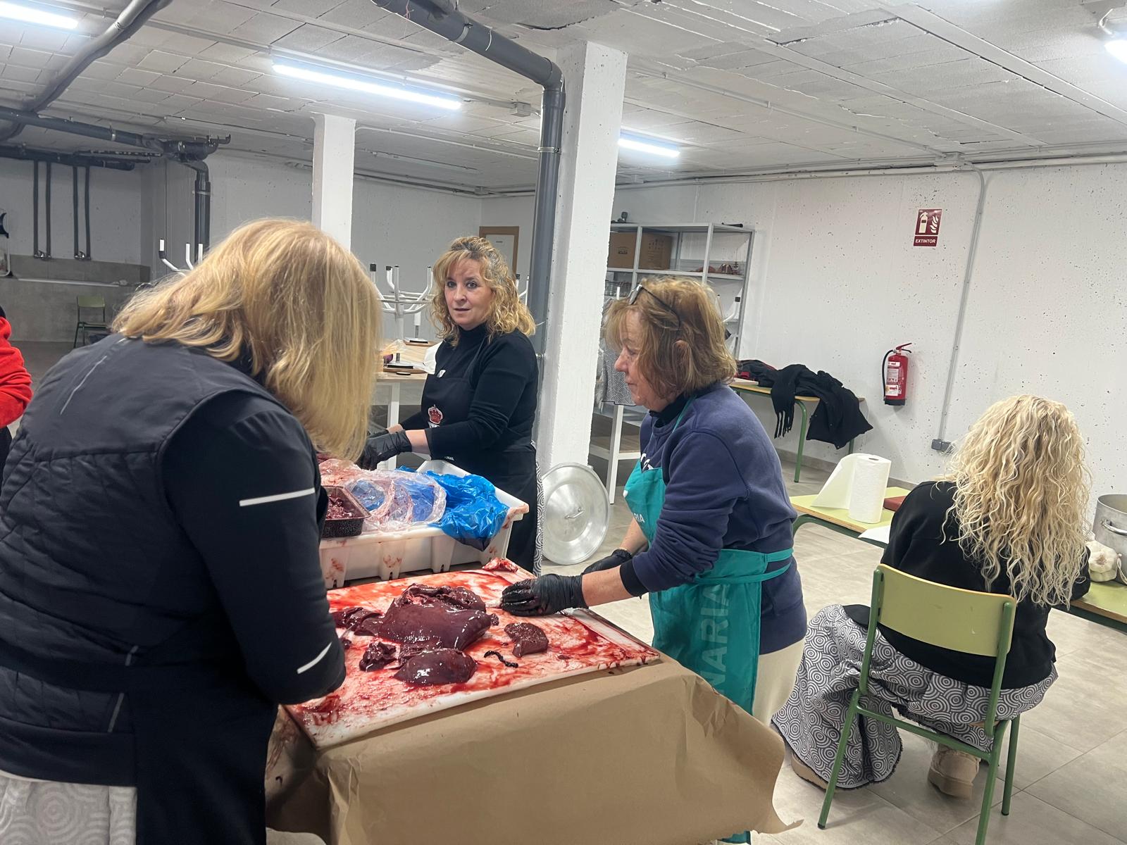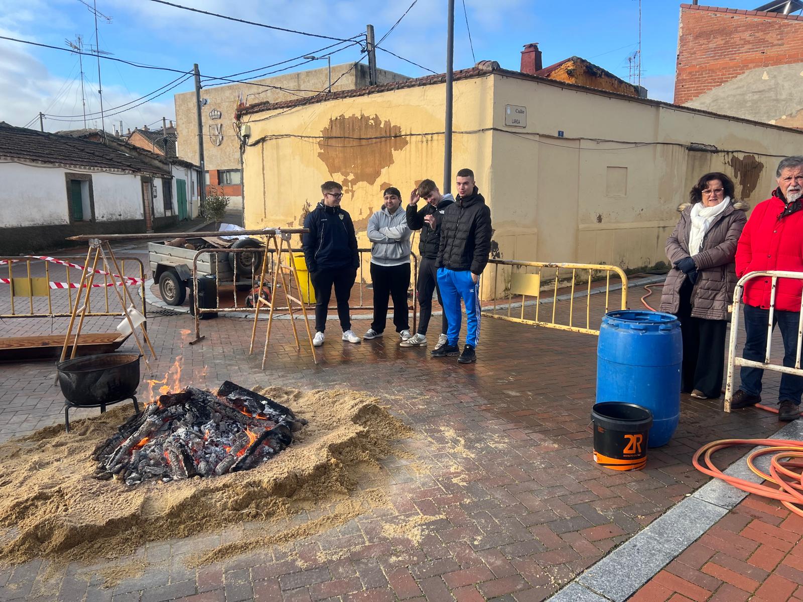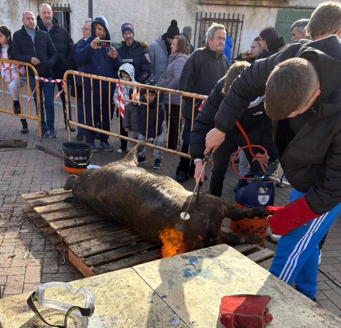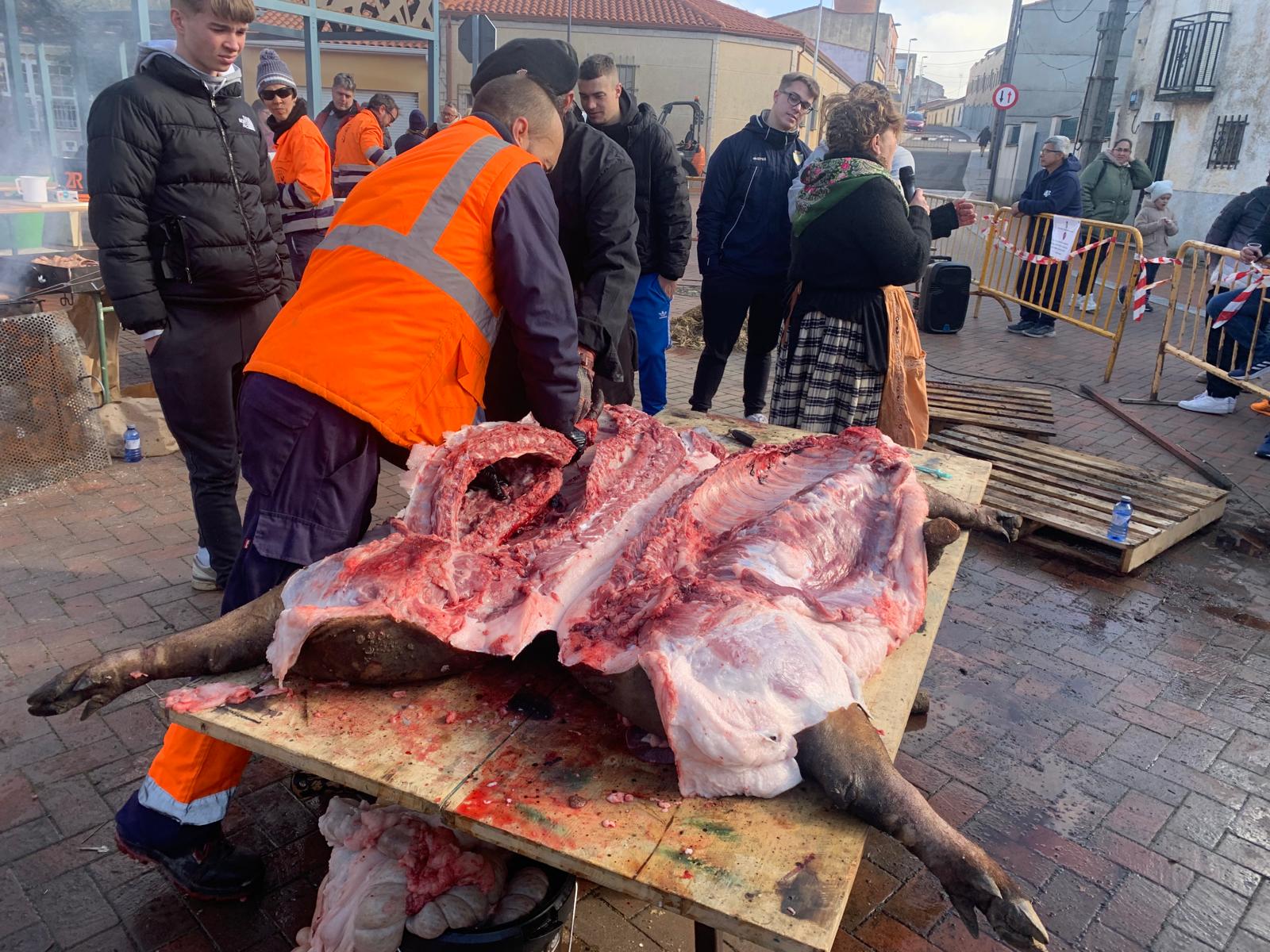 Doñinos ha cumplido fielmente con el ritual de la matanza, guiado como es habitual por el matarife Juan Manuel Rodríguez, primero con el chamuscado del cerdo y después el despiece del animal y la elaboración de los chorizos y la carne, mientras las mujeres de la Asociación de Mujeres Mercedes Amaro preparaban los 35 kilos de hígado encebollado para la posterior degustación popular.