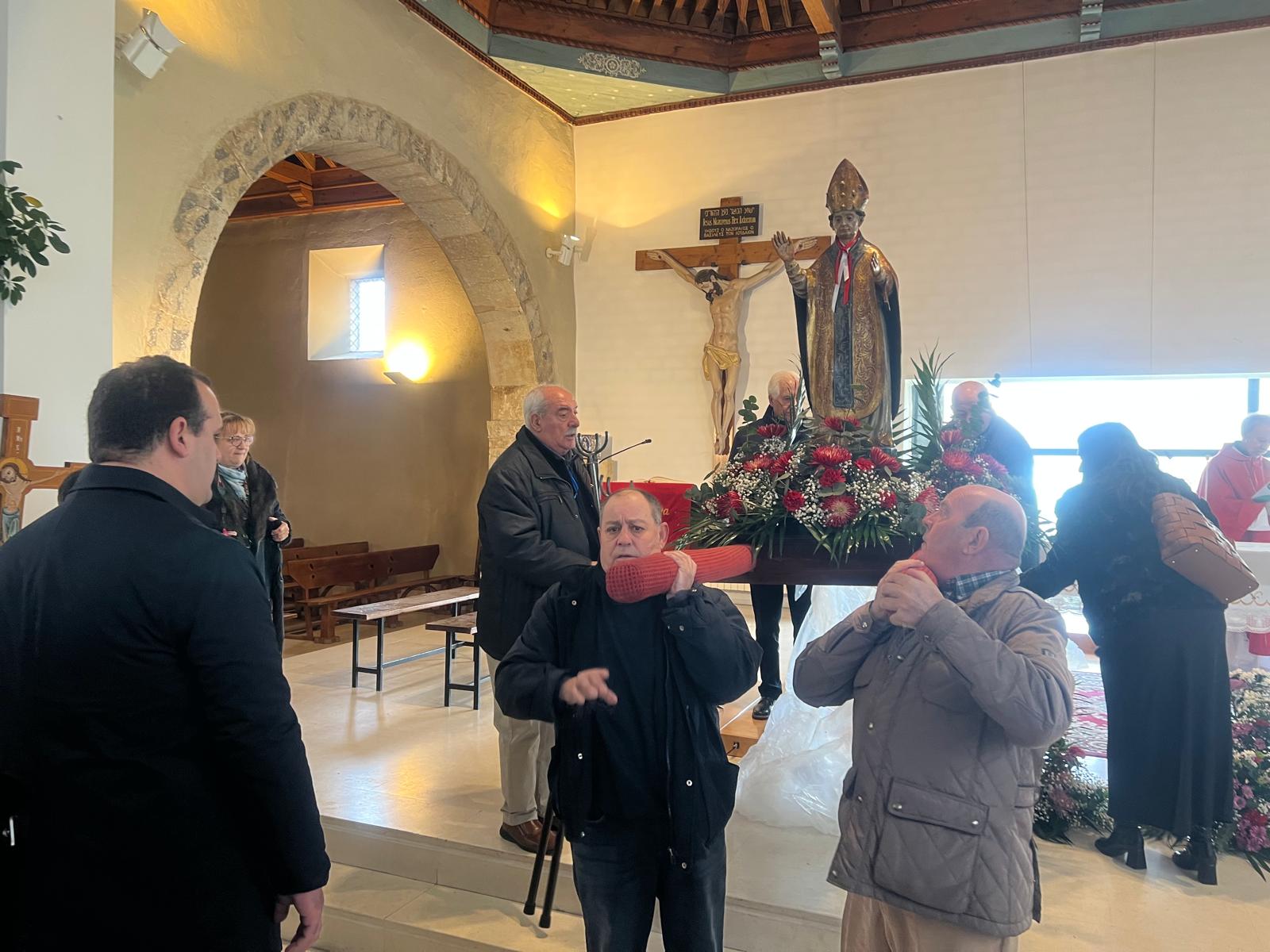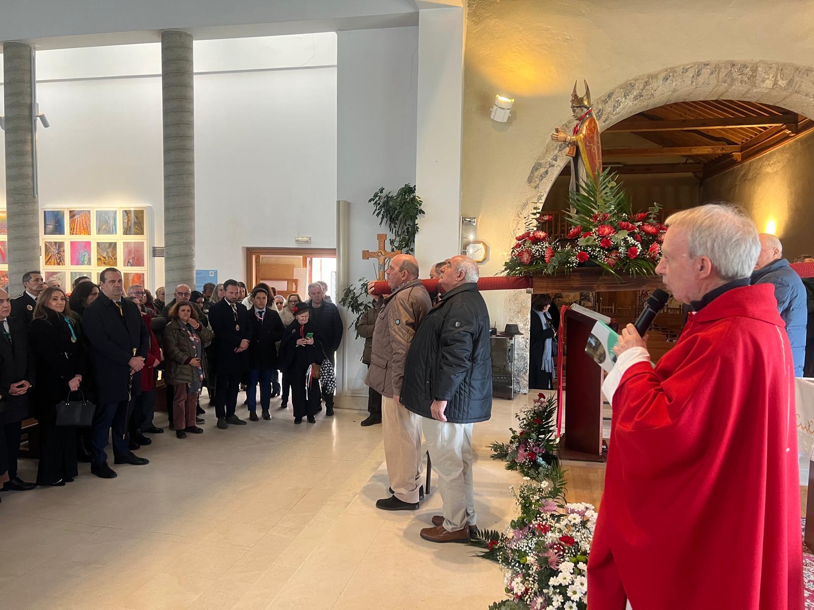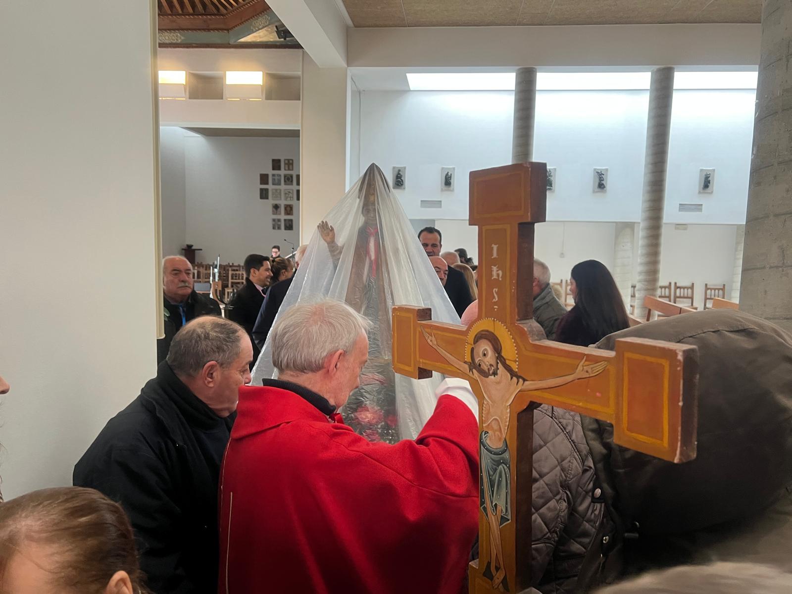 Tras finalizar la misa y varios intentos por sacar la imagen en procesión, finalmente el párroco decidió celebrar la bendición del santo en la iglesia. Los fieles volvieron al interior para bendecir sus gargantillas y se procedió a oficiar la oración con el acompañamiento de la banda de música que entonó el himno de España.