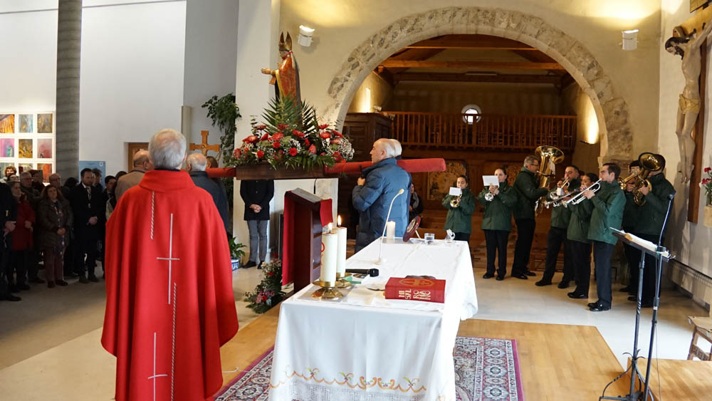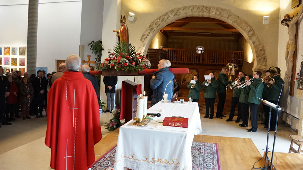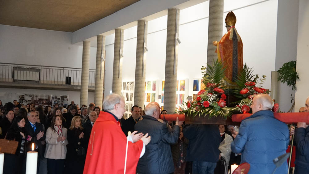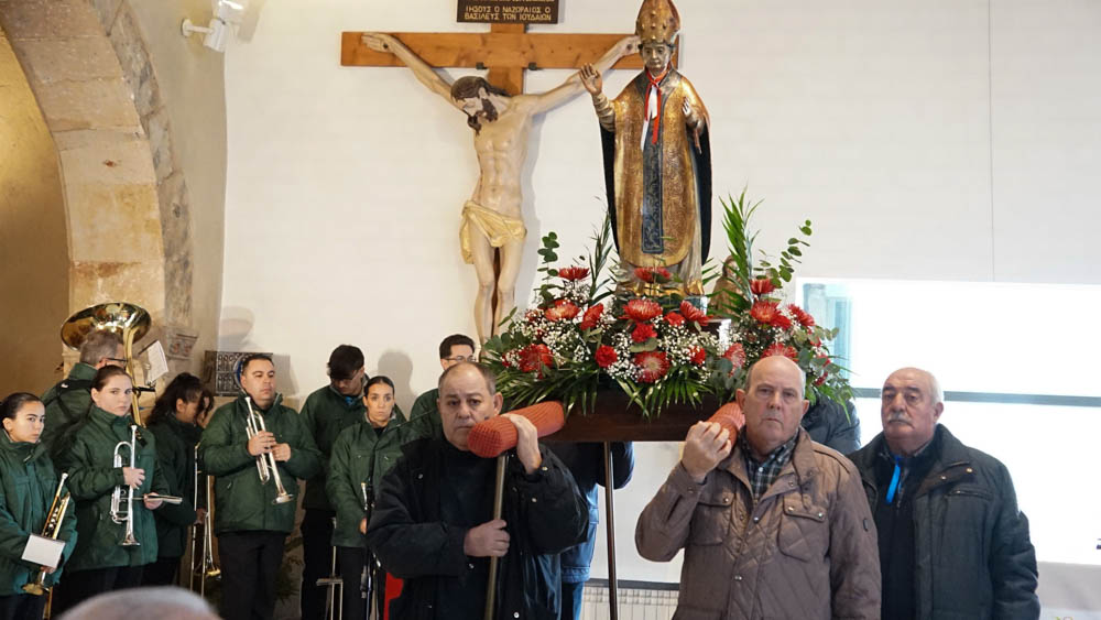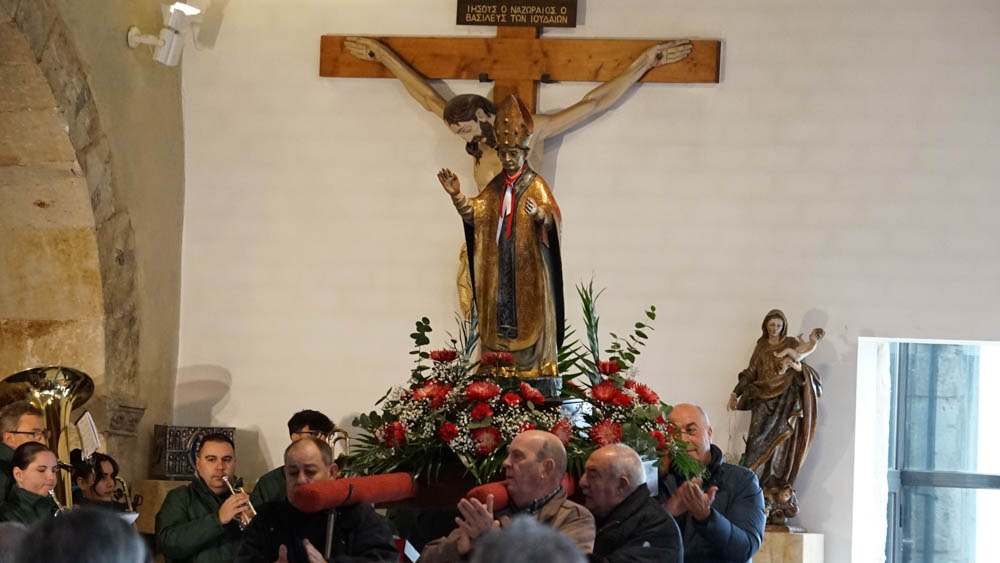 Tras finalizar la misa y varios intentos por sacar la imagen en procesión, finalmente el párroco decidió celebrar la bendición del santo en la iglesia. Los fieles volvieron al interior para bendecir sus gargantillas y se procedió a oficiar la oración con el acompañamiento de la banda de música que entonó el himno de España.