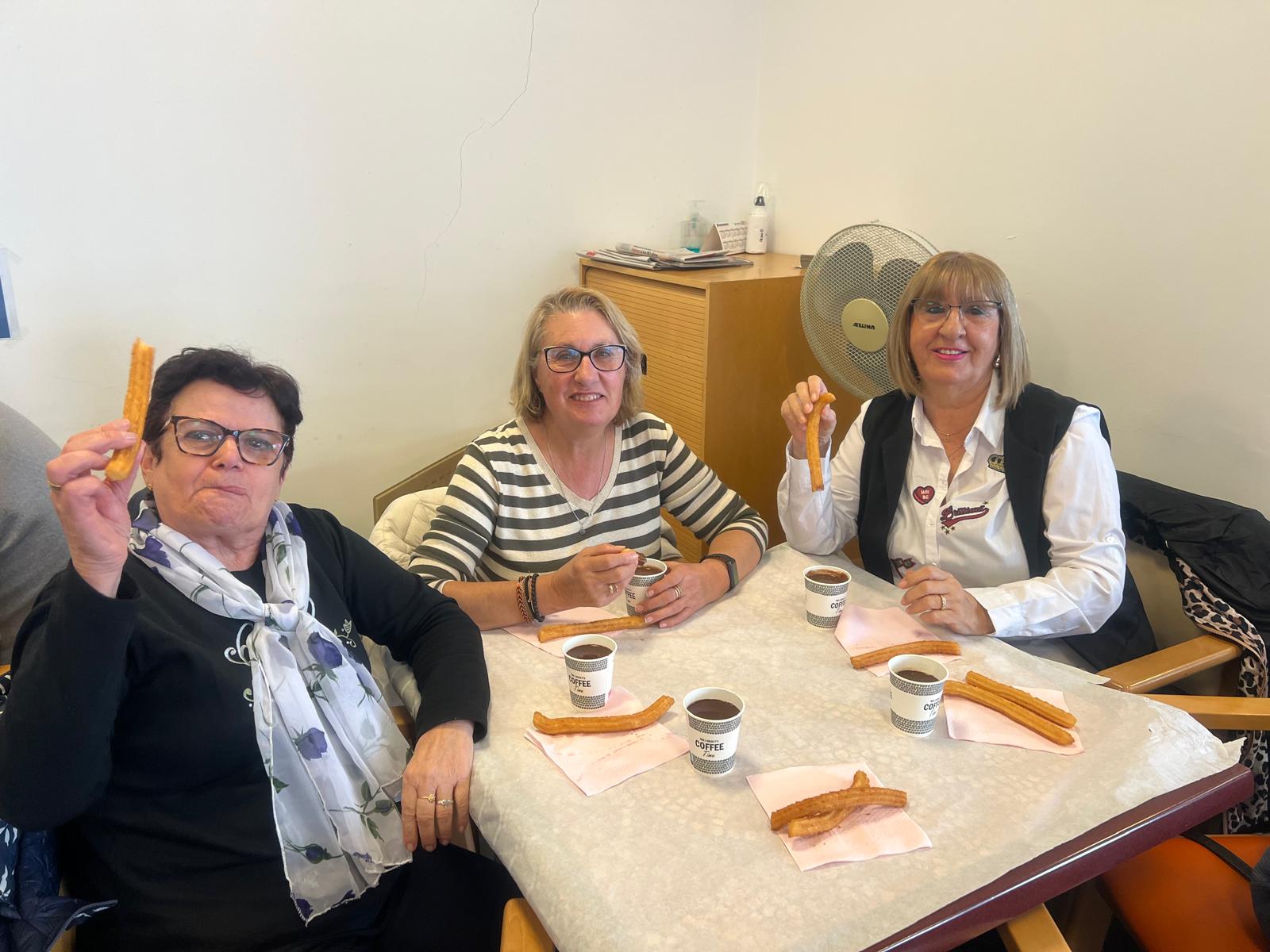 En un salón del Edificio Sociocultural lleno, los mayores han degustado las 250 raciones de chocolate caliente acompañadas con los 500 churros, de los que han dado buena cuenta en una divertida tarde que ha continuado con la obra de teatro ‘El dentista, la Evarista y los cuatro de la lista’ que el grupo Sin Complejos ha puesto en escena en el Auditorio Enrique de Sena.