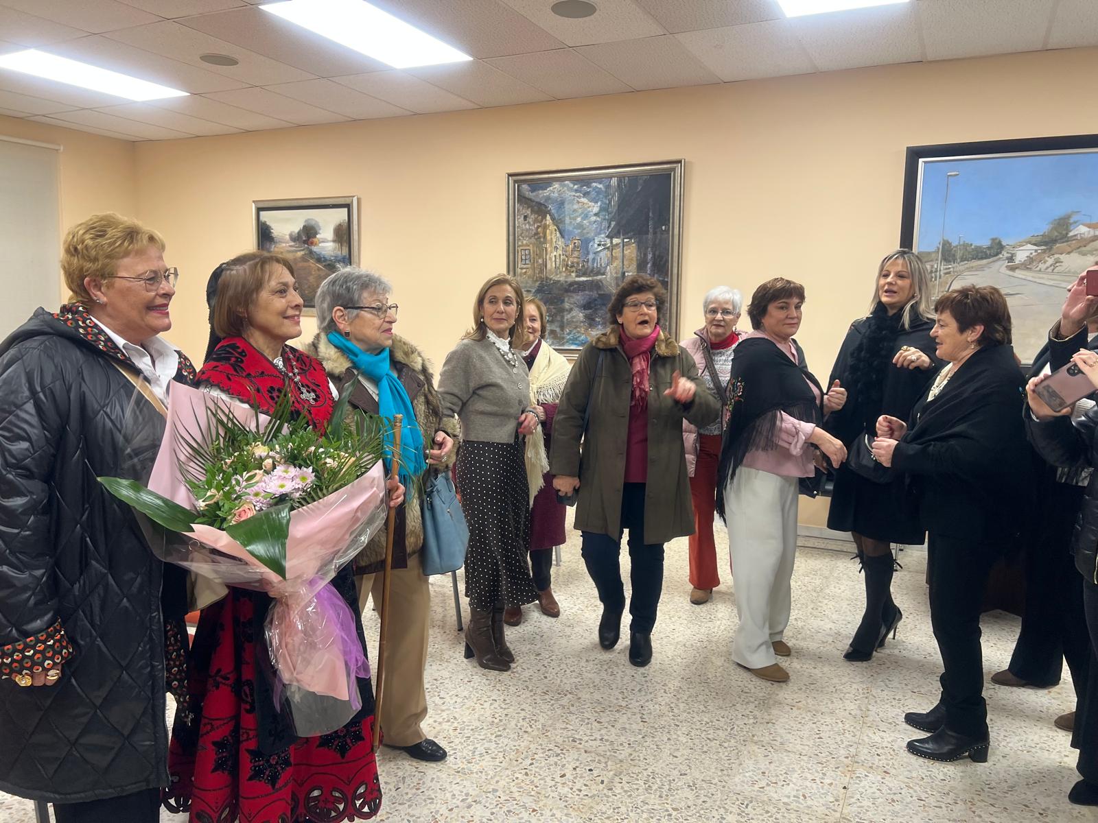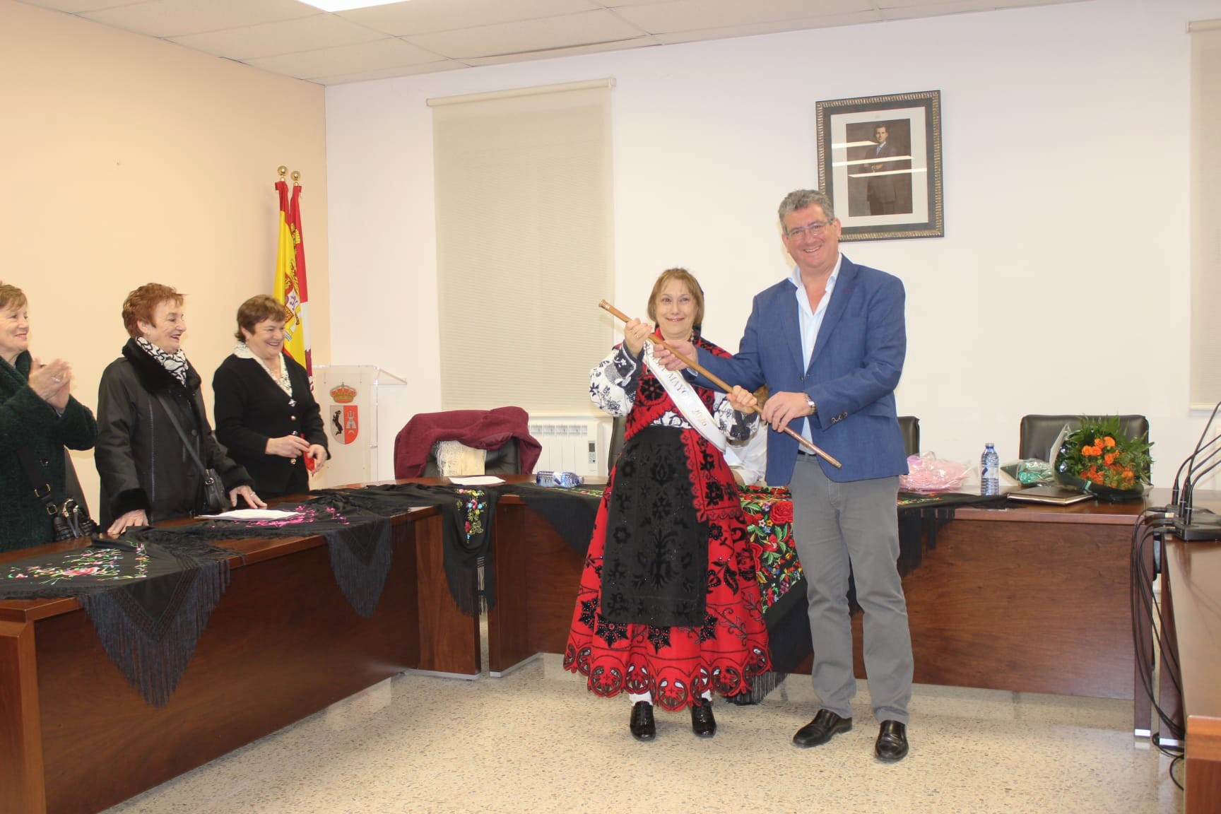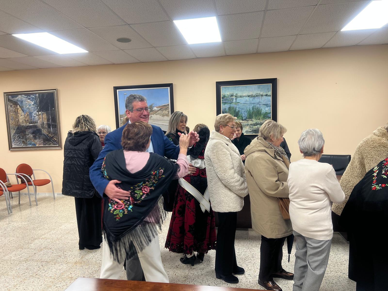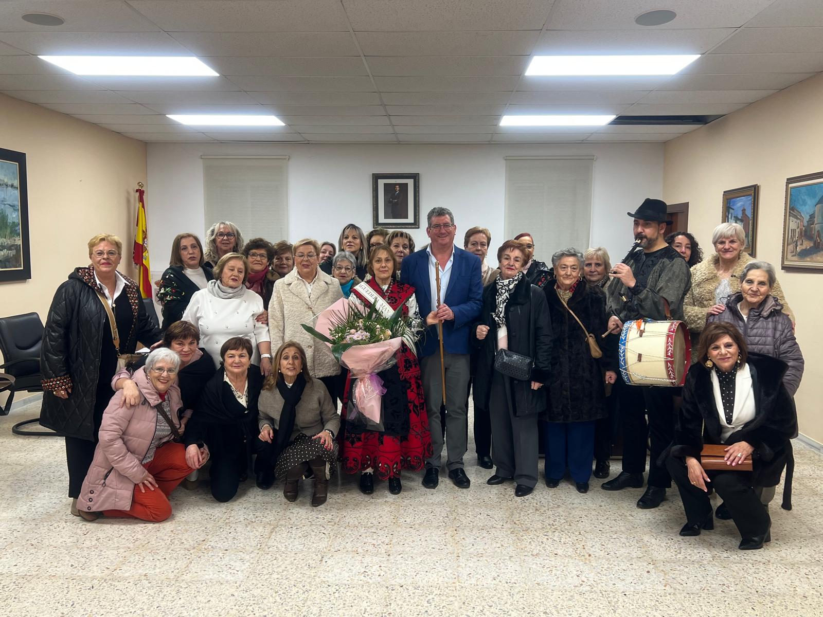 La celebración del día de Santa Águeda ha reunido a una veintena de mujeres en el salón de pleno del Ayuntamiento para participar en la entrega del bastón de mando por parte del alcalde, Claudio del Río, a la aguedera mayor, Ana María Alfaraz, que este año asume el cargo con su elegante traje de charra.