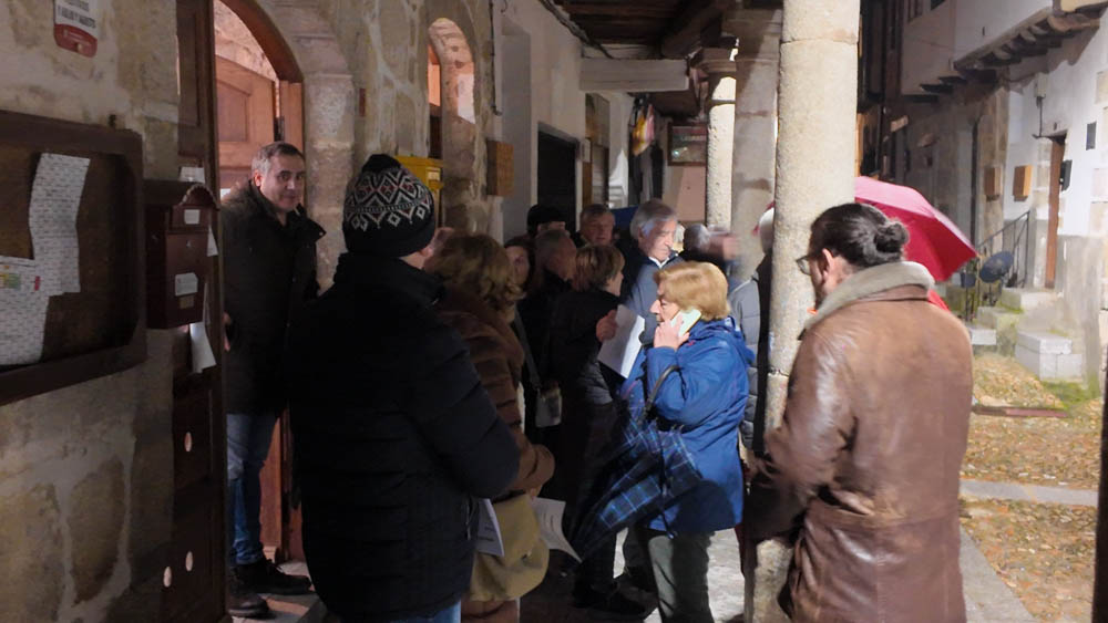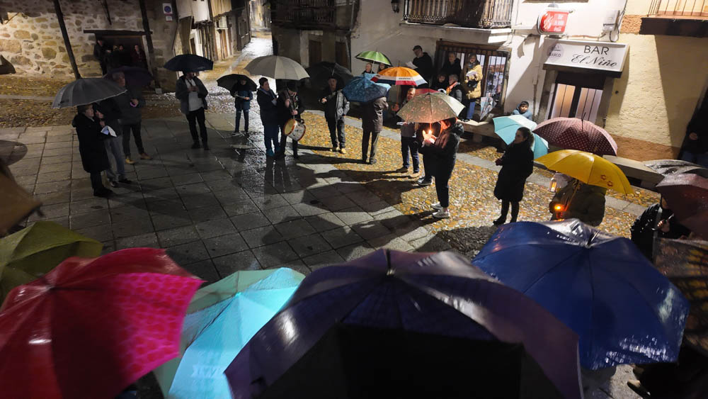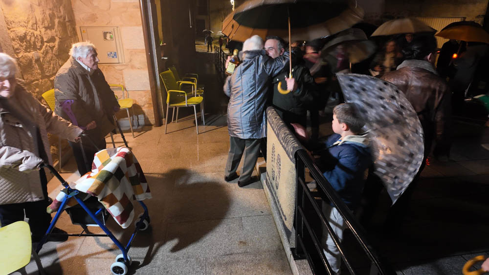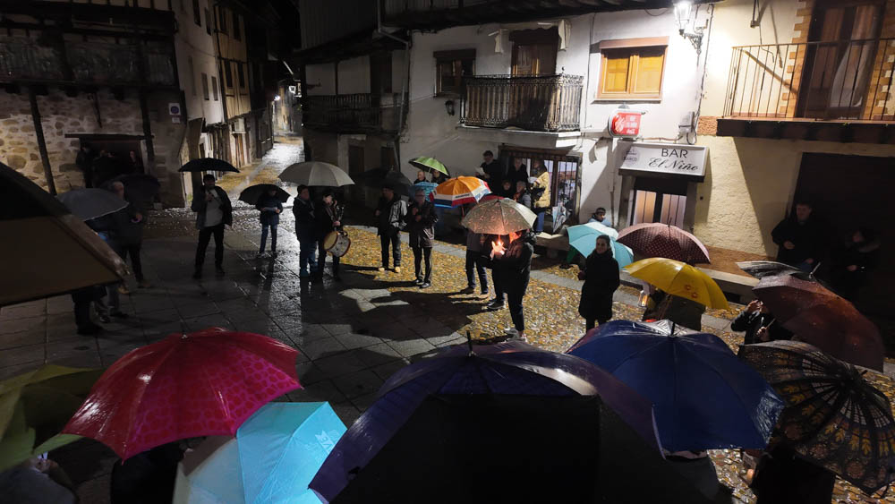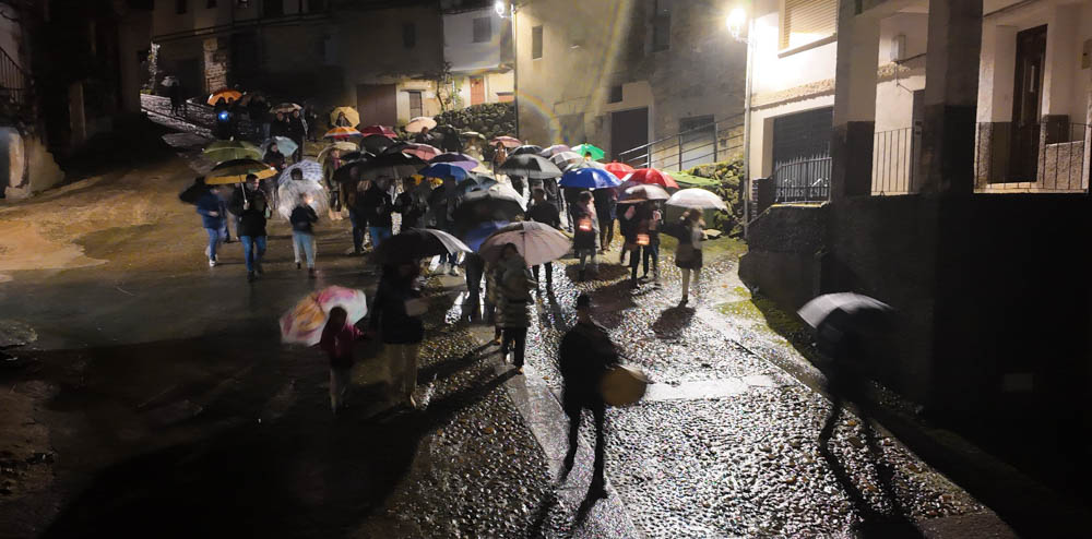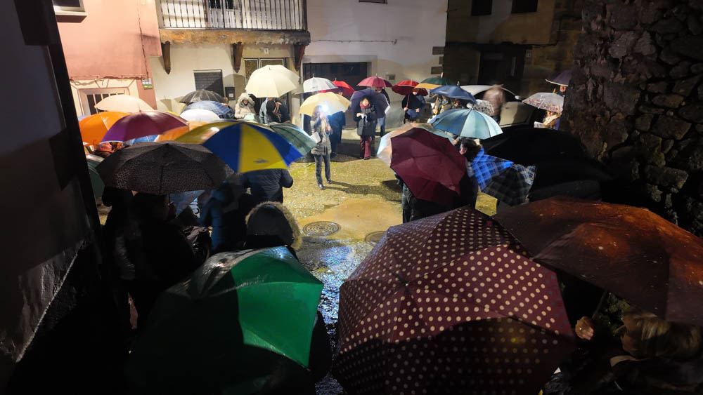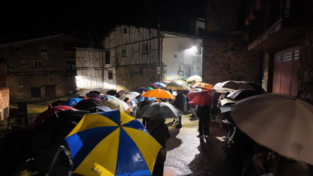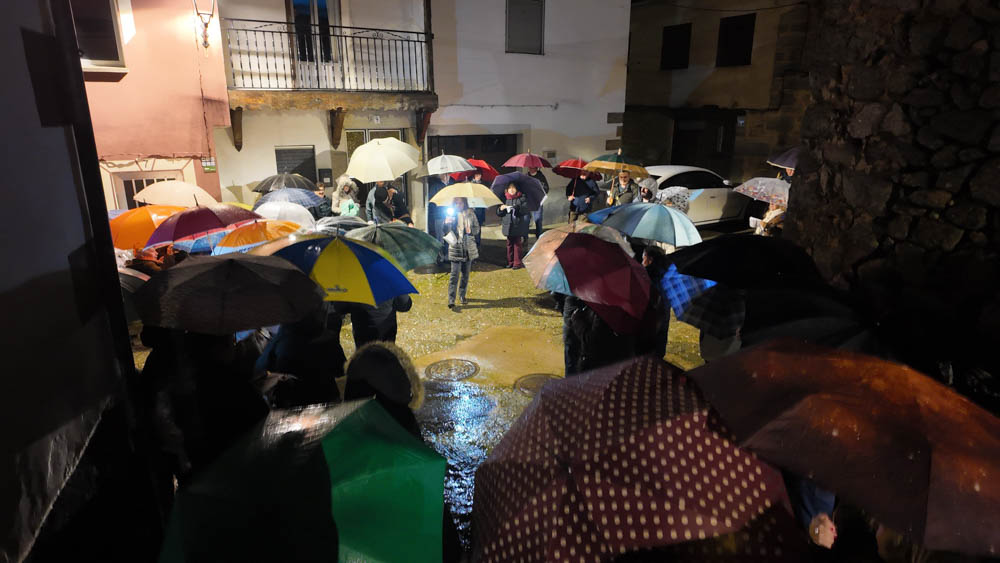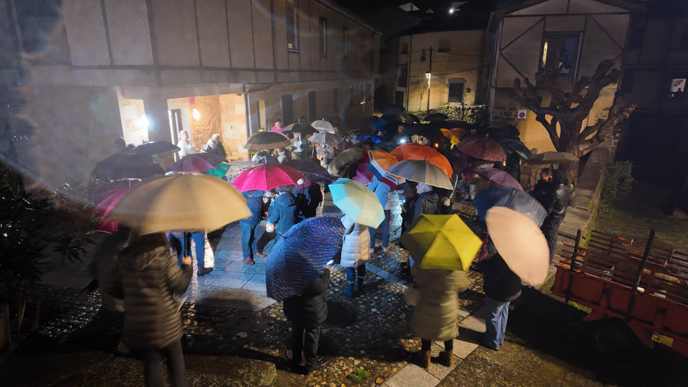 Al finalizar cada uno de los versos que los vecinos interpretaron bajo el cobijo de los paraguas para protegerse de la lluvia, se lanzó un cohete para indicar que el camino proseguía. Aunque es habitual que la comitiva realice su periplo a la luz de las velas que se instalan a lo largo del recorrido, la meteorología impidió esta vez que pudieran mantenerse las candelas encendidas.