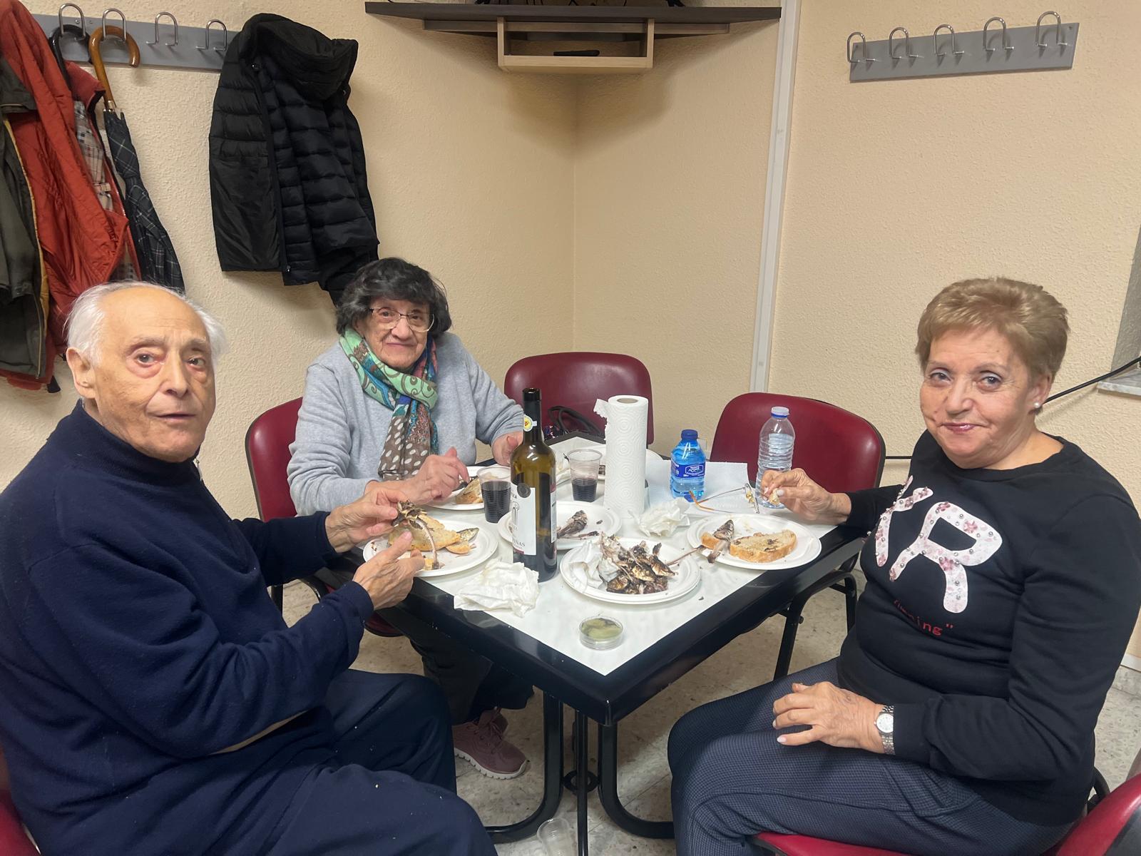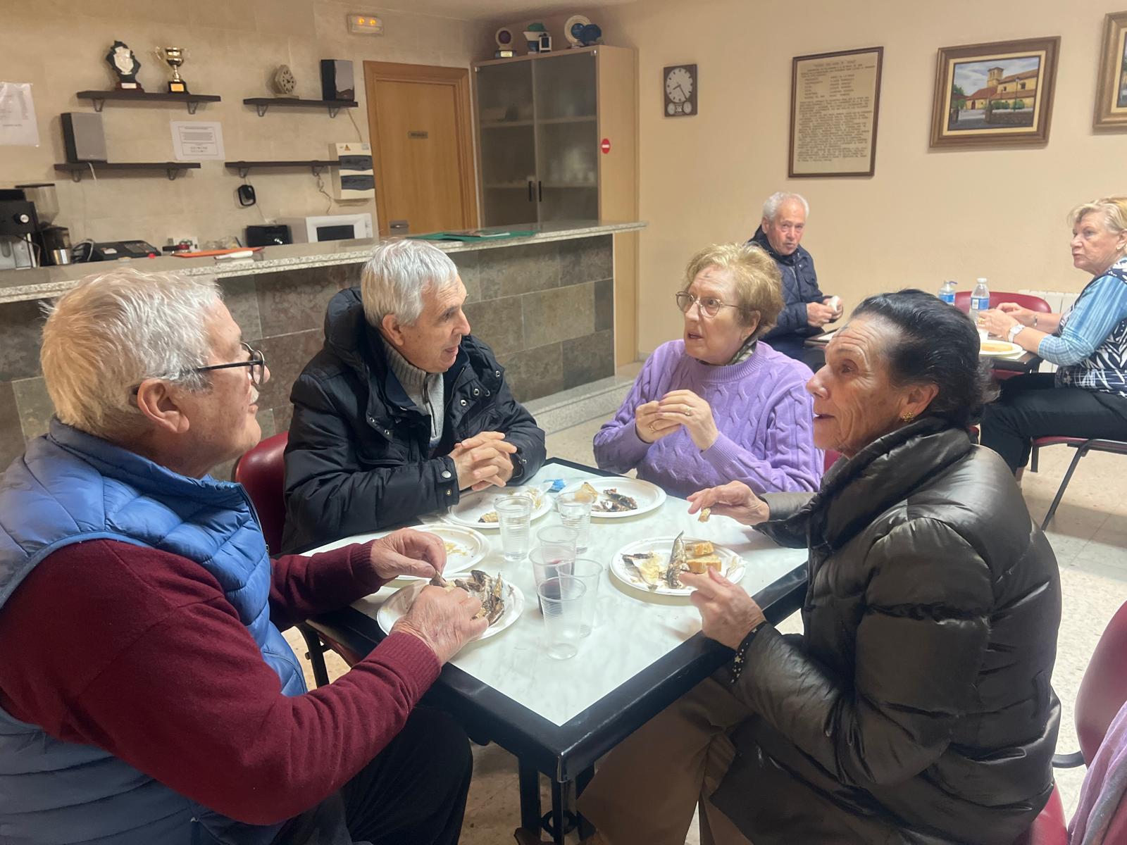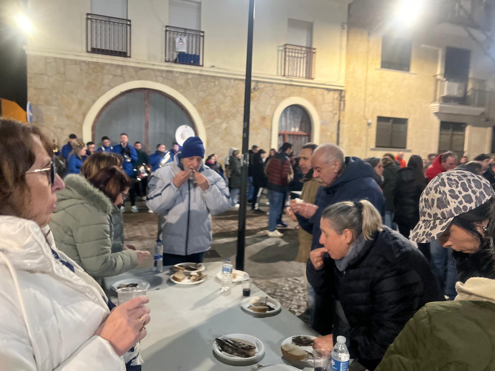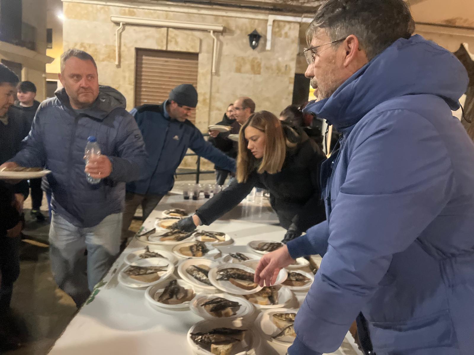 El viento y las malas condiciones meteorológicas han obligado a trasladar el lugar de celebración, aunque finalmente ha dado una tregua y los vecinos han participado y tras esperar su turno en la fila, han podido comer las sardinas en la calle y algunos han aprovechado la comodidad del hogar de mayores para disfrutar de la merienda festiva al ritmo de la música de la charanga.
