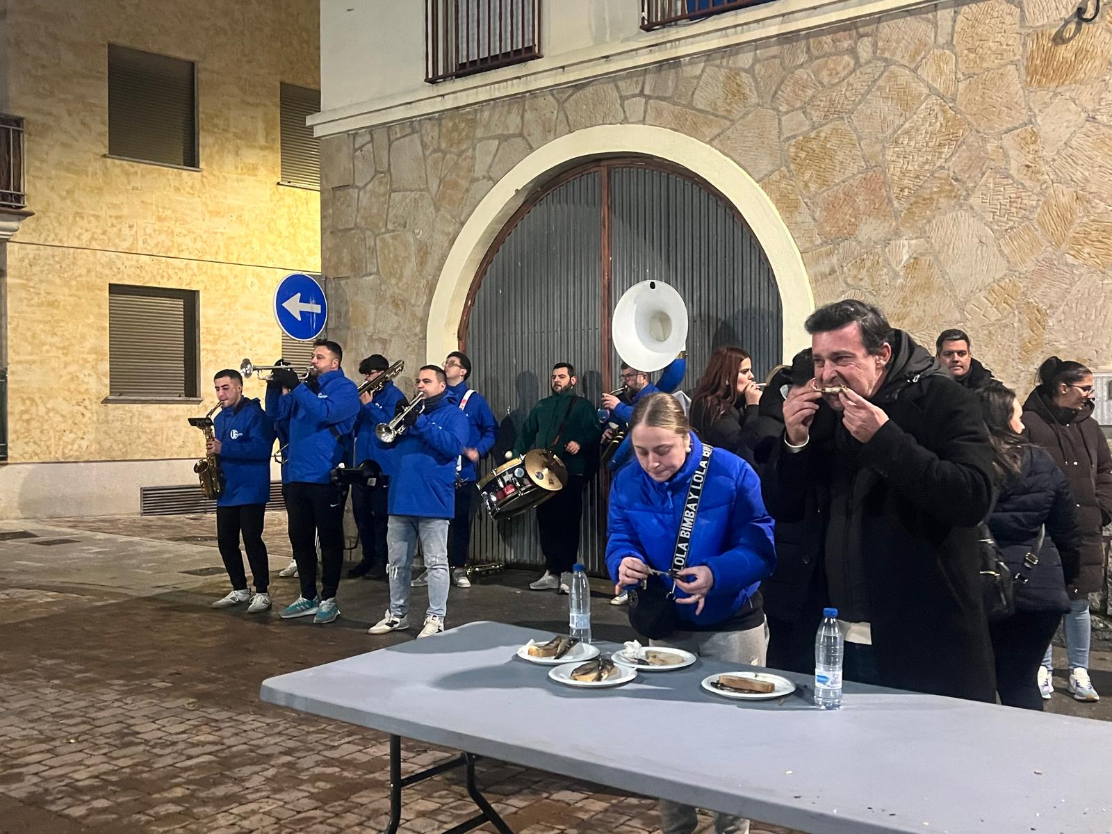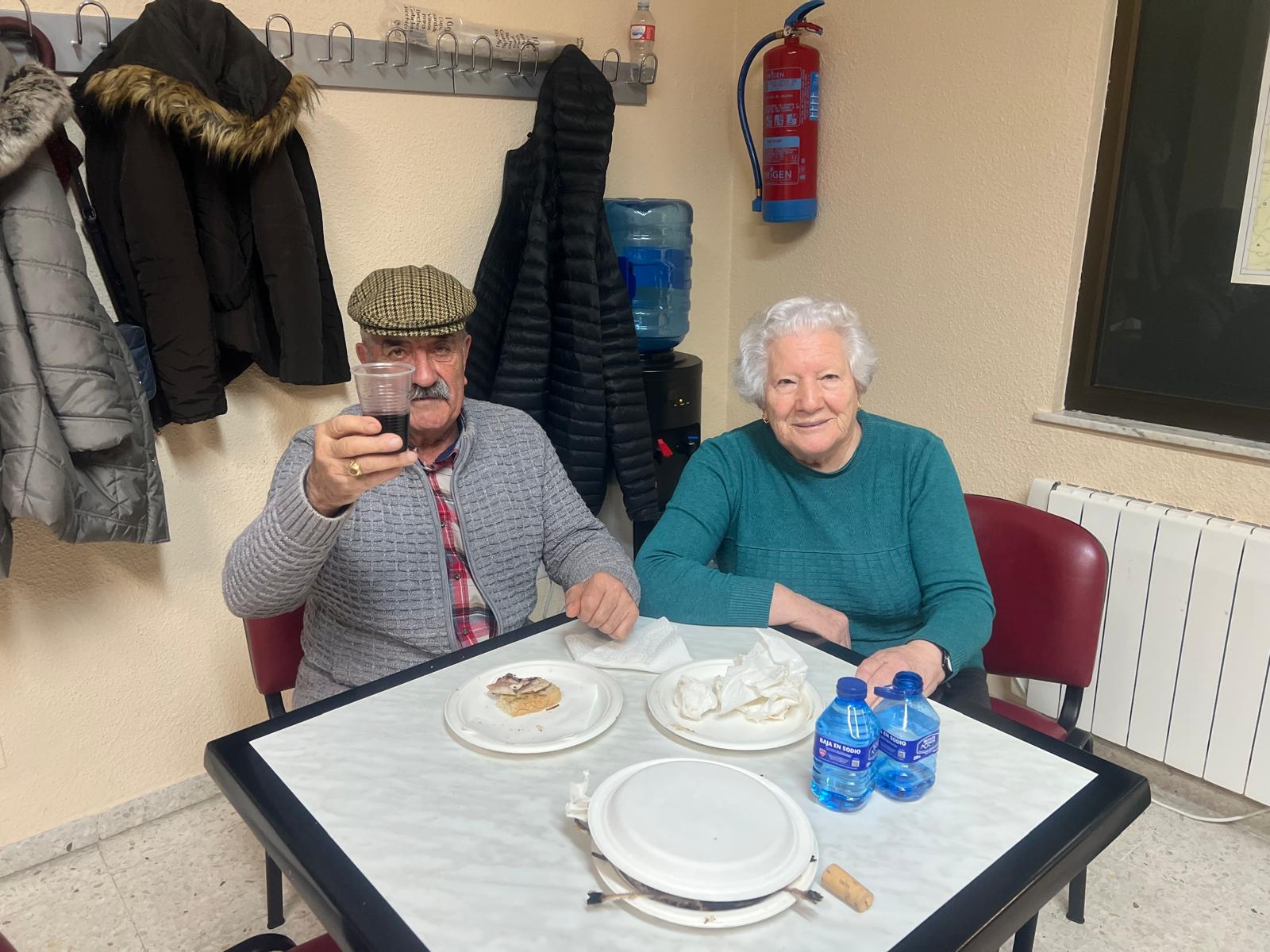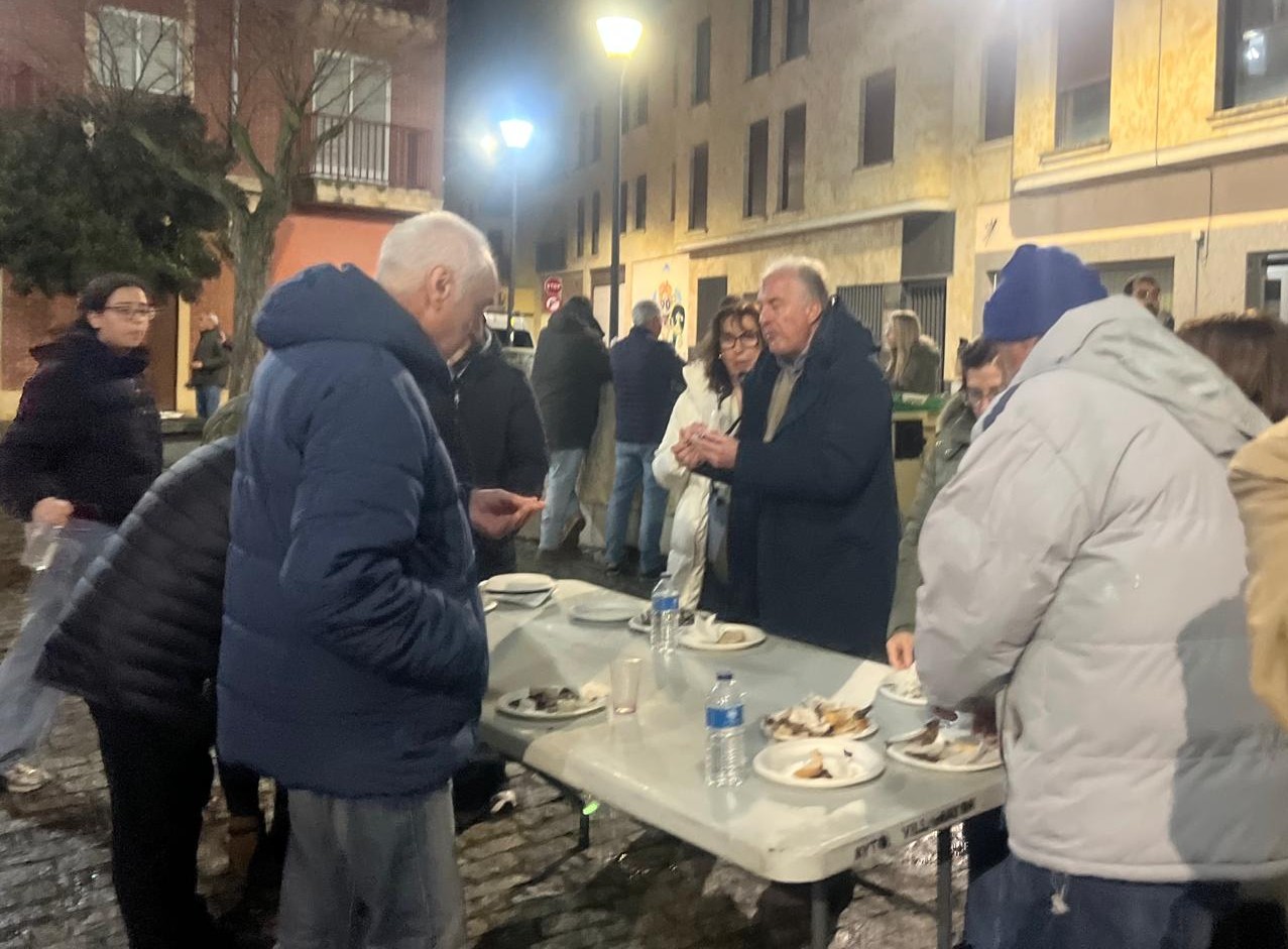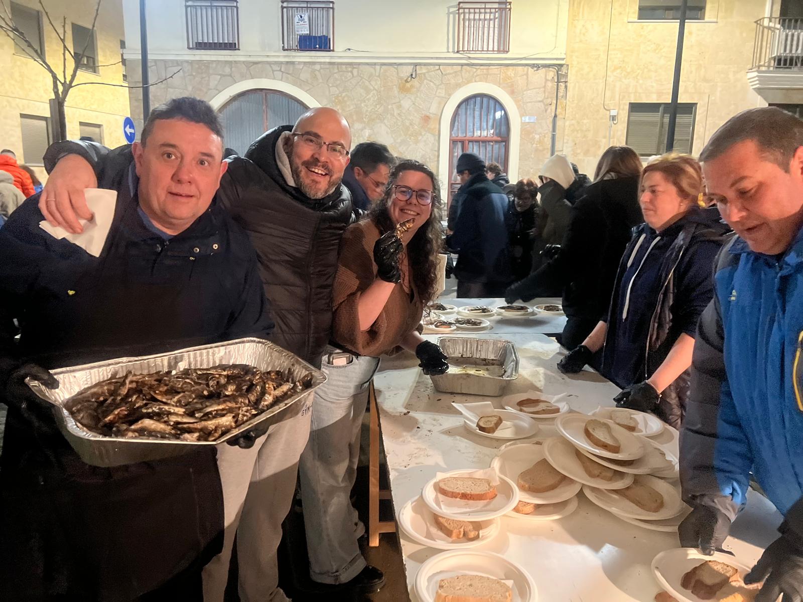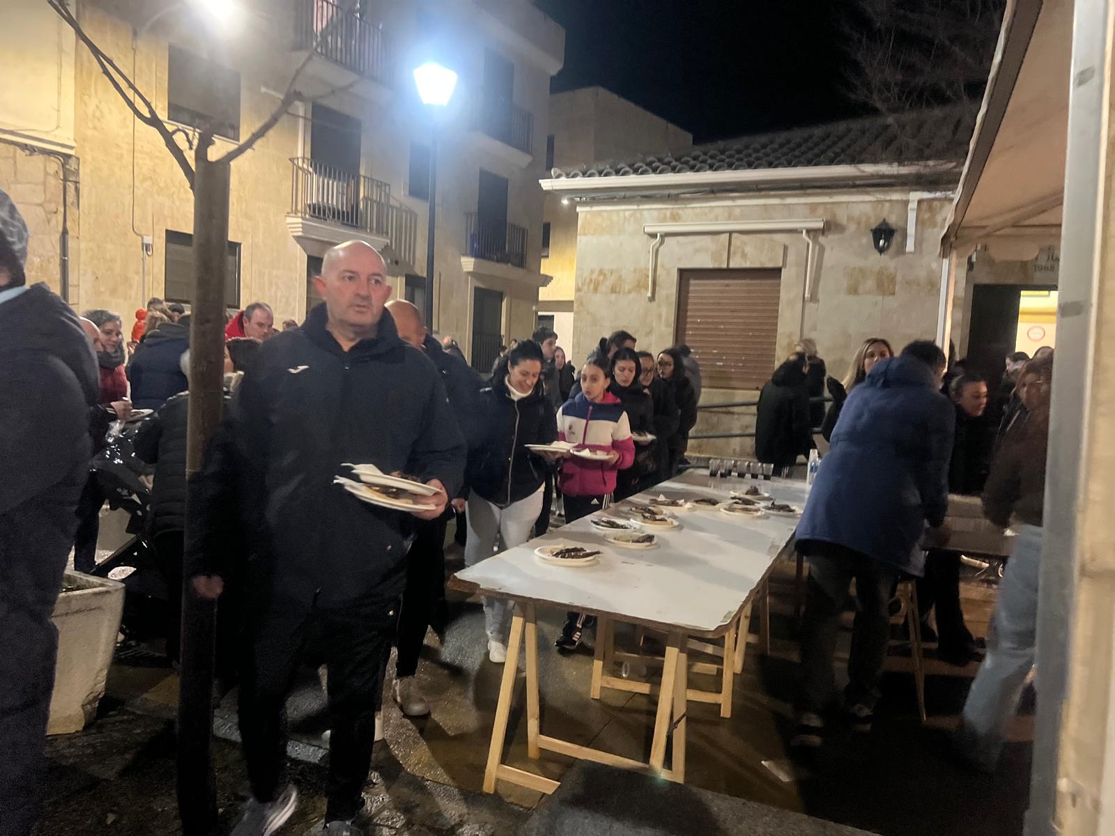 El viento y las malas condiciones meteorológicas han obligado a trasladar el lugar de celebración, aunque finalmente ha dado una tregua y los vecinos han participado y tras esperar su turno en la fila, han podido comer las sardinas en la calle y algunos han aprovechado la comodidad del hogar de mayores para disfrutar de la merienda festiva al ritmo de la música de la charanga.