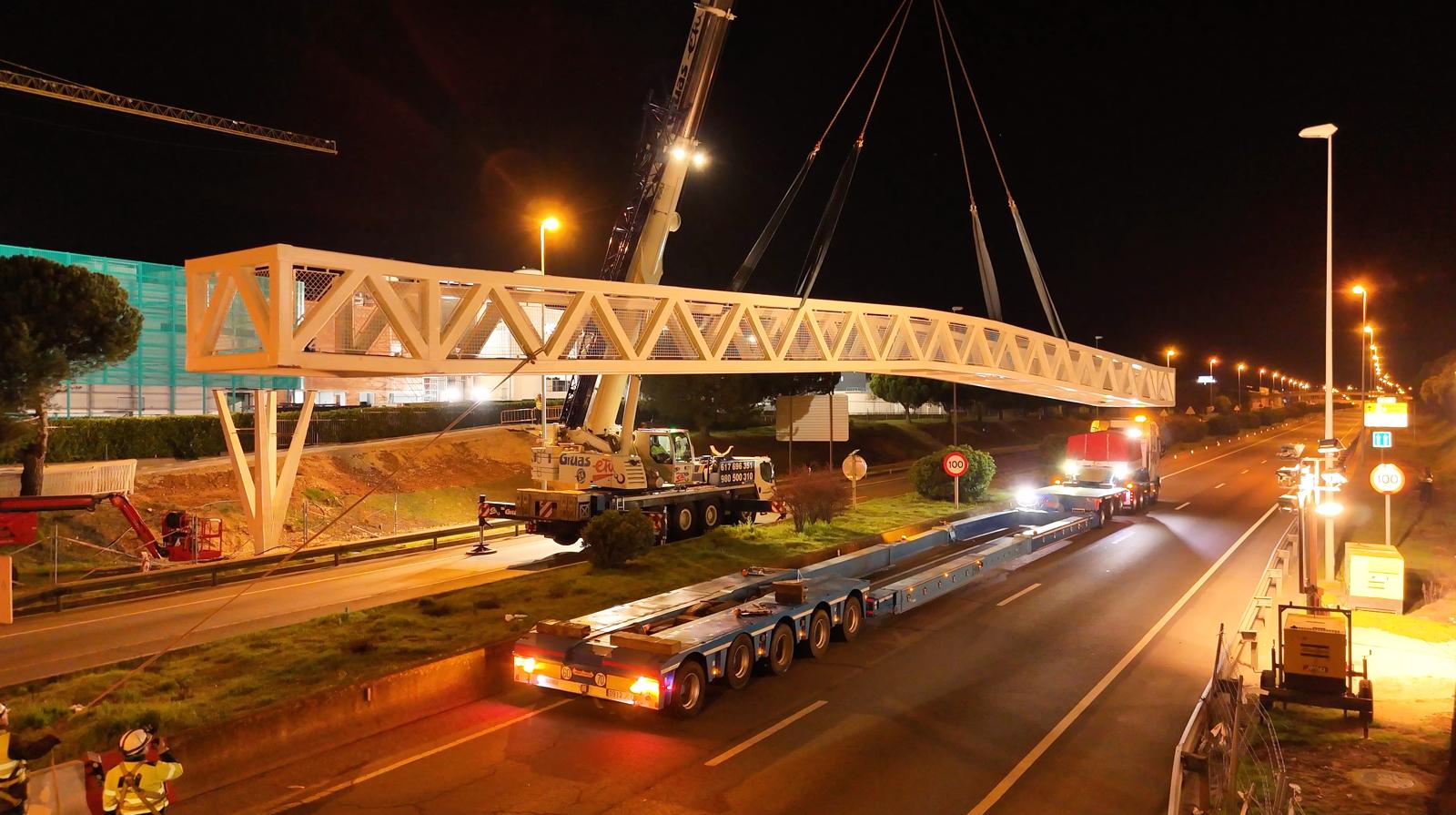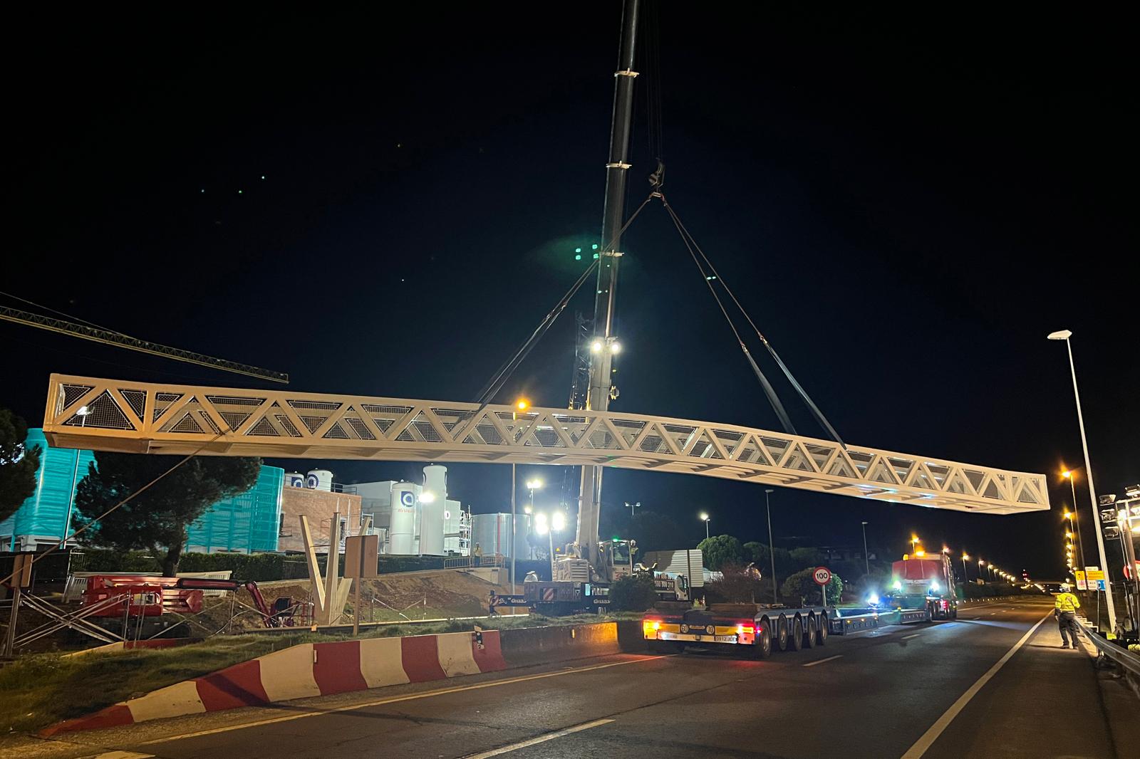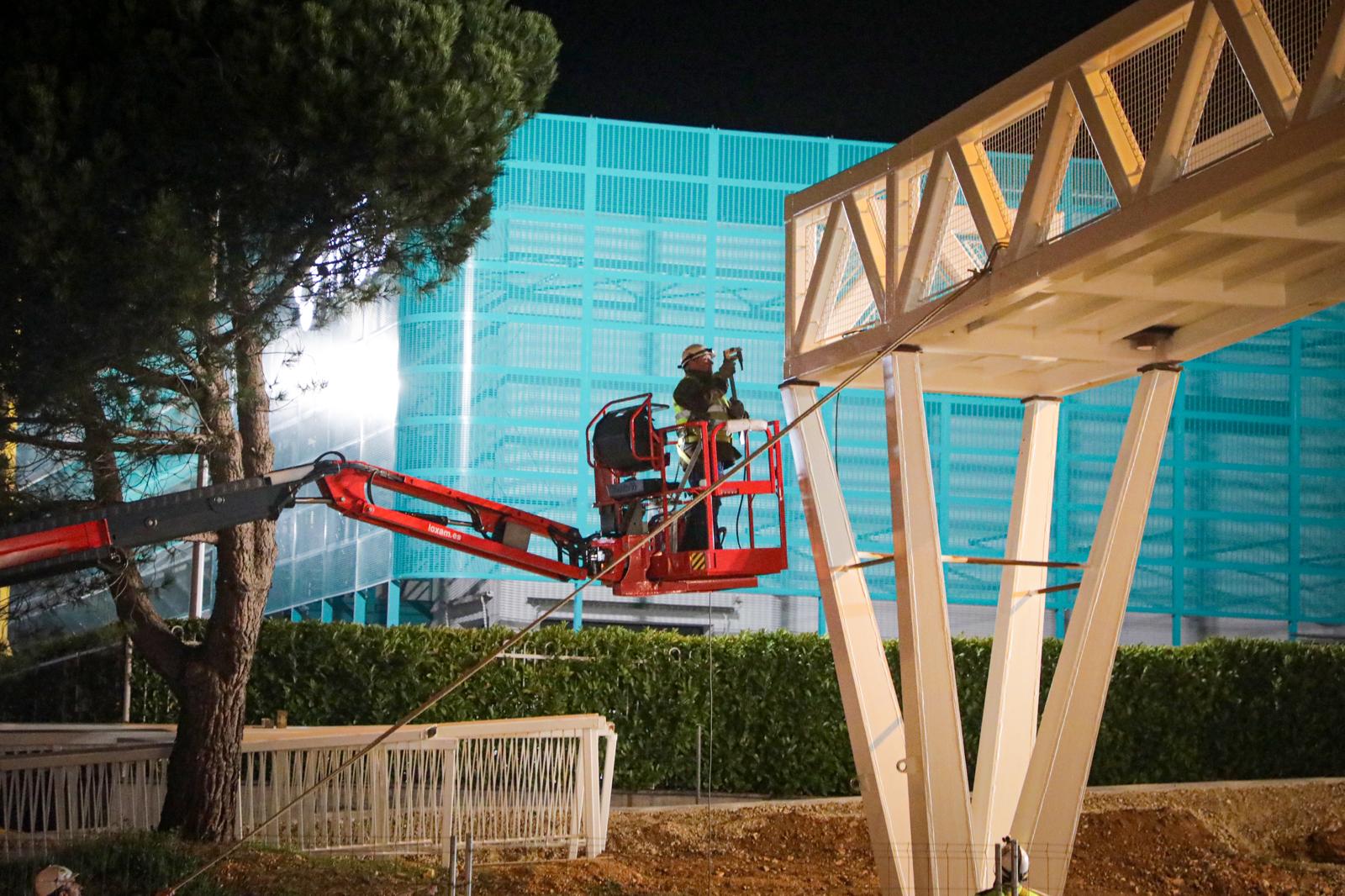La primera fase de las obras del montaje de la pasarela peatonal que une los polígonos El Montalvo I y El Montalvo III ya está ejecutada. Las buenas condiciones climatológicas han permitido que los operarios pudieran realizar en la noche de ayer los trabajos de izado y colocación de los dos primeros tramos de las rampas rampas a ambos lados de la vía SA-20. Durante el día de hoy está previsto finalizar los dos últimos tramos de las rampas y la prueba de peso y carga para garantizar la estabilidad y la seguridad de la infraestructura antes de su apertura al paso de los peatones.