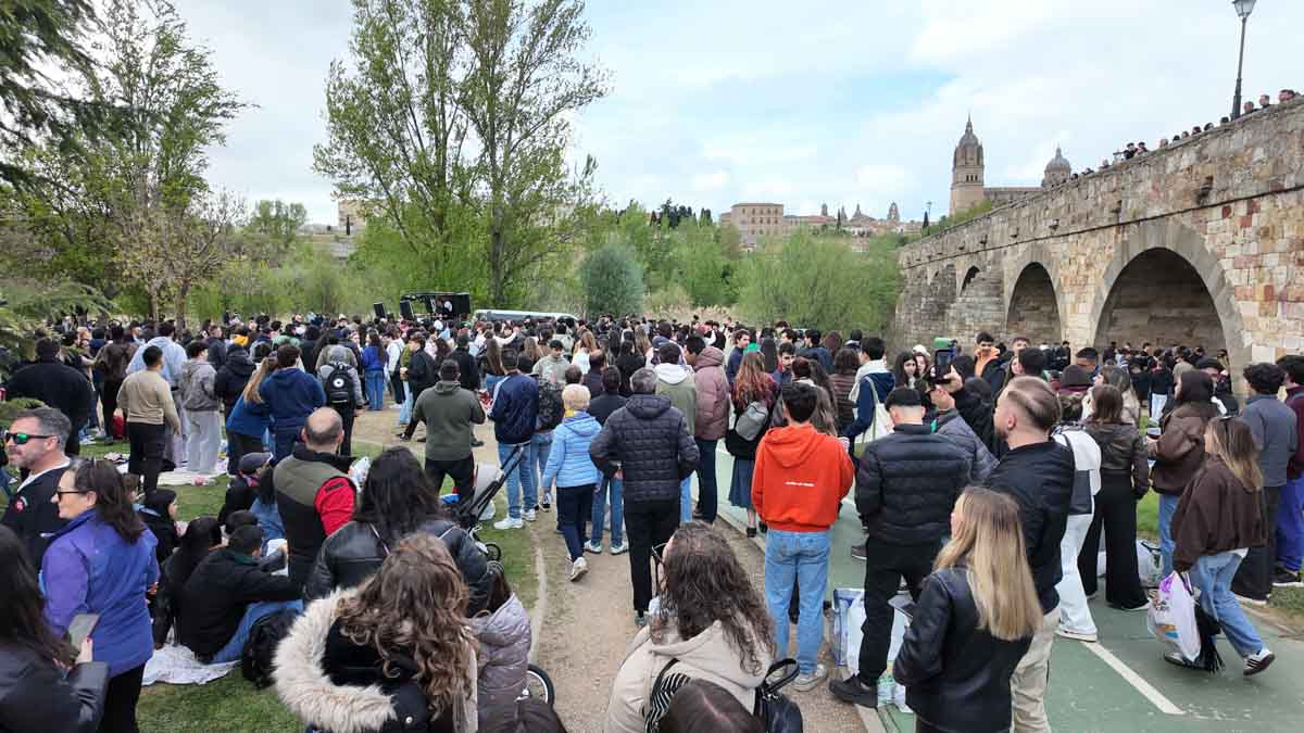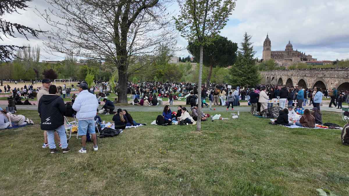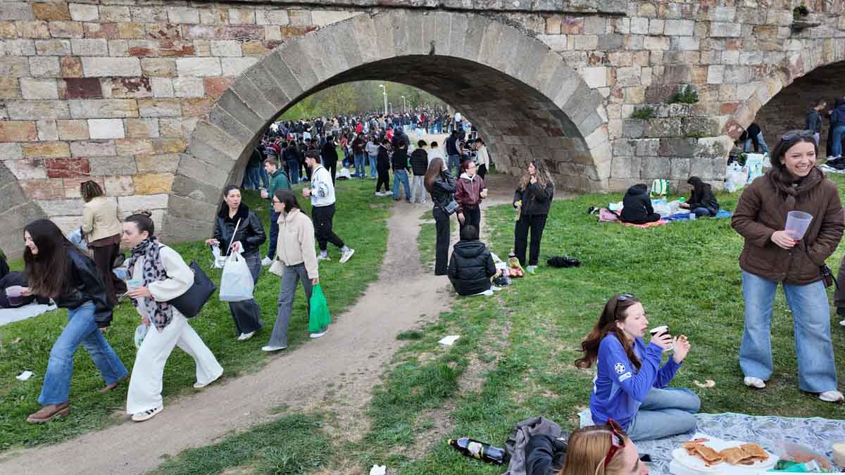 El frío y el viento de la jornada no han impedido que miles de personas se hayan desplazado hasta el Puente Romano para disfrutar y celebrar el Lunes de Aguas. El público joven ha sido el principal y fiel protagonista, ocupando las zonas libres de agua de la ribera del río Tormes. Hornazo acompañado del tradicional ‘botellón’ y de un ambiente festivo acompañado en todo momento por la música de la electrocharanga con la que han bailado y se han movido cientos de jóvenes en un Lunes de Aguas marcado por la presencia de mantas y prendas de abrigo.