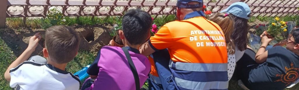 Los niños del Club de Animación del programa municipal Ciudad de los Niños de Castellanos de Moriscos han realizado la plantación de 80 nuevos rosales en los jardines alrededor de la iglesia, con los que contribuyen a embellecer el entorno y sensibilizarse con el cuidado del medio ambiente y la naturaleza que les rodea.