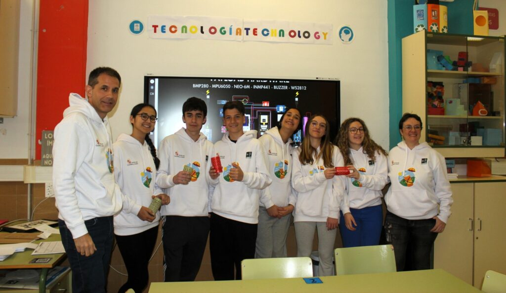 Jimena, Alessia, Alba, Mara, Iván y Óscar, acompañados por sus profesores de Matemáticas y Tecnología, Luz María Rodríguez y Carlos Sánchez, respectivamente, lideran el equipo de la ‘Misión Aurora’ dentro del Proyecto de Innovación Educativa CanSat organizado por la Agencia Espacial Europea.