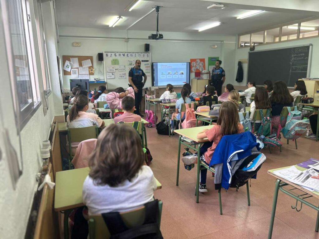 Los agentes de la Policía Local de Santa Marta de Tormes han acudido al colegio Carmen Martín Gaite del municipio para impartir la parte teórica del Curso de Seguridad Vial. Una actividad que los agentes realizan a lo largo del año con los diferentes centros del municipio para enseñar y formar a los escolares en los aspectos básicos que permitan mejorar la seguridad en las vías públicas. Cursos y charlas que cuentan con una parte teórica y una parte práctica que se realiza con los coches eléctricos en circuito de seguridad vial ubicado en la zona deportiva de la Signo XXV.
