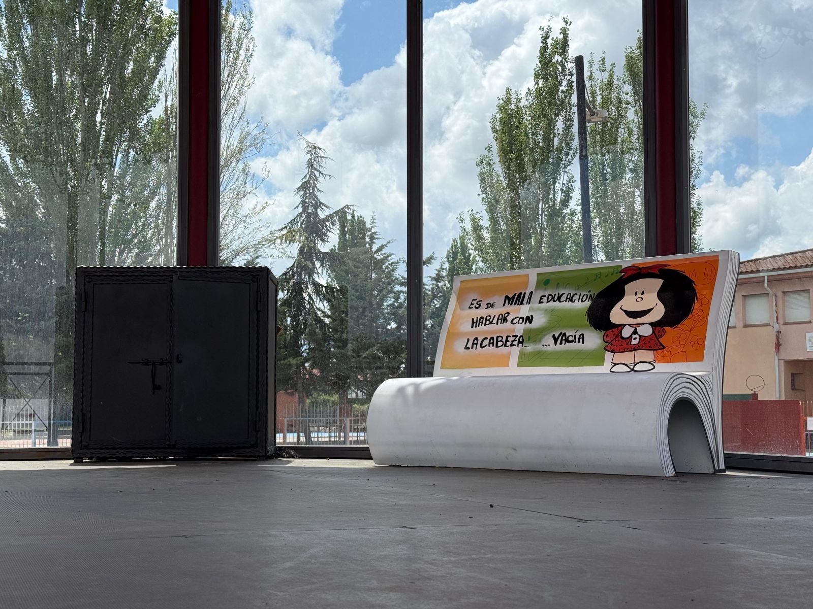 En cuanto al mobiliario, el Ayuntamiento ha incorporado un armario en forja y un banco de diseño inspirado en los cómics de Mafalda y con el lema: ‘Es de mala educación hablar con la cabeza…vacía’.